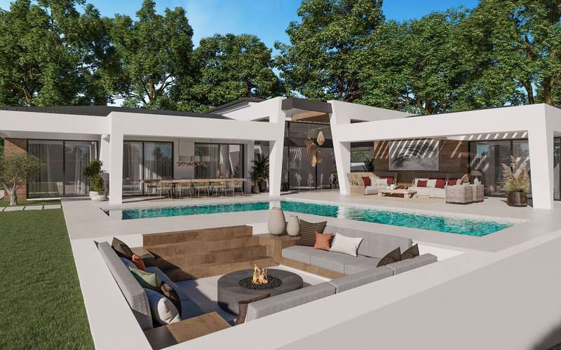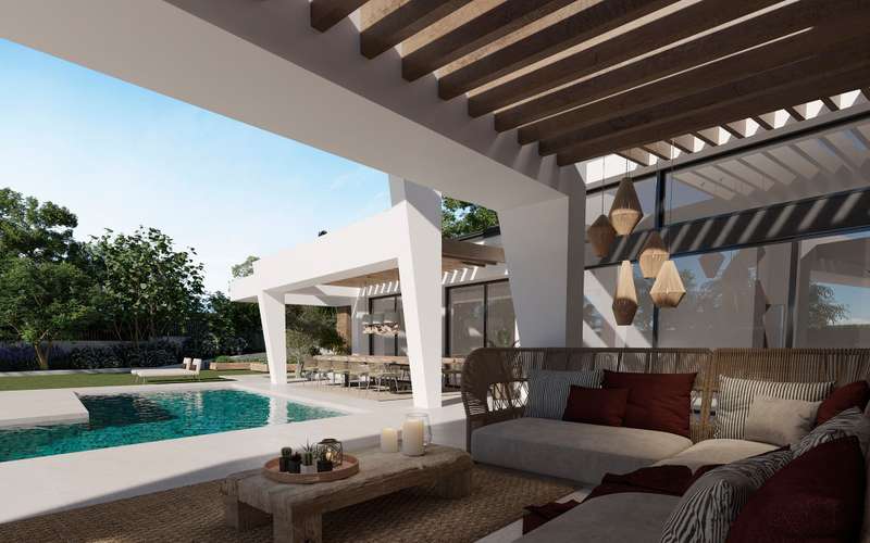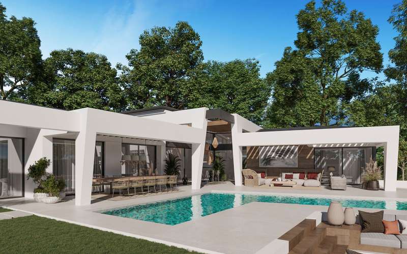 Three unique and innovative villas to be built in a prime location in the Golf Valley, Nueva Andalucía. Close to all amenities, Puerto Banús, Marbella and the beach, everything is very easily accessible. Single storey villas with a license already in place, designed with a combination of natural colours and wood to create a warm and relaxing environment with a sensation of comfort. The villas versatility and innovative style will give each space in the villa a uniqueness, allowing for comfortable, modern and efficient living. With high quality finishes throughout and a good distribution. There will be open living spaces, a fully fitted modern kitchen and floor to ceiling windows, giving plenty of light. With the most advanced technologies, home automation system and the best brands. Each villa will have large terraces, plenty of seating areas, garden, pool and chill out area with a winter fire. The villas have an underground garage and a large basement that can be customized