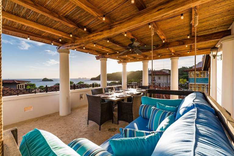 The open-concept living space serves as the central hub for relaxation and entertainment, seamlessly connecting to the highlight of the home: a private covered rooftop terrace. This elevated outdoor retreat offers panoramic views of the Pacific Ocean, surrounding mountains, and the charming pedestrian streets of Las Catalinas. With seating for eight, it's perfect for enjoying your morning coffee, hosting a sunset dinner, or simply unwinding under the stars.