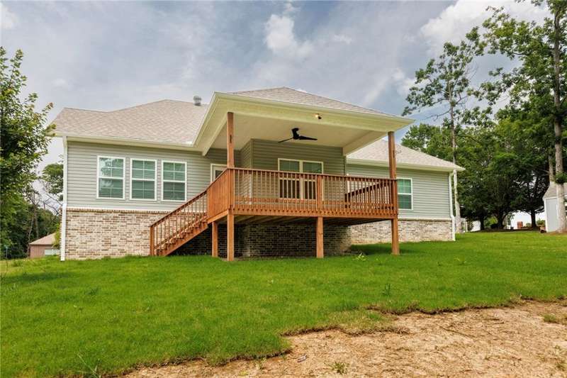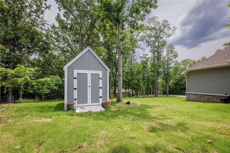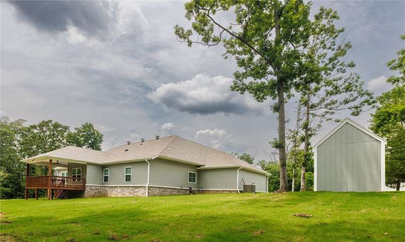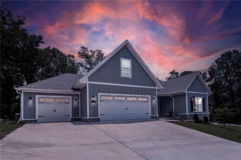 Built in 2023 on a rare, mostly flat, double lot in Bella Vista, this move-in ready home offers 4 bedrooms, 3 baths and a private office. This home has TWO primary suites! The open split floor plan features vaulted ceilings with beams, wood floors, high-end finishes, and a ventless fireplace added in 2024. Outdoor living includes a wood deck, spacious front patio, and charming wood shutters. An oversized 3-car garage plus outbuilding provide storage or workshop space. Fresh sod (2025) completes the yard. Conveniently located near lakes, golf, and biking/hiking trails, this property blends comfort, function, and lifestyle. Seller offering $2,000 toward closing costs! Don't miss out of this rare double lot beauty!