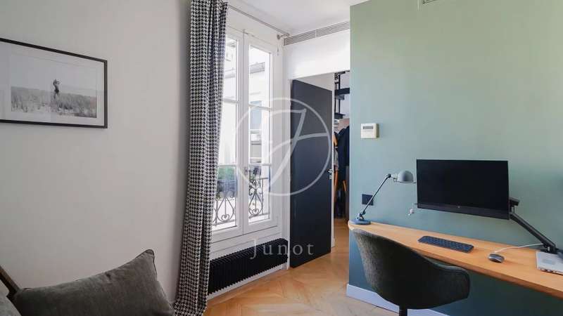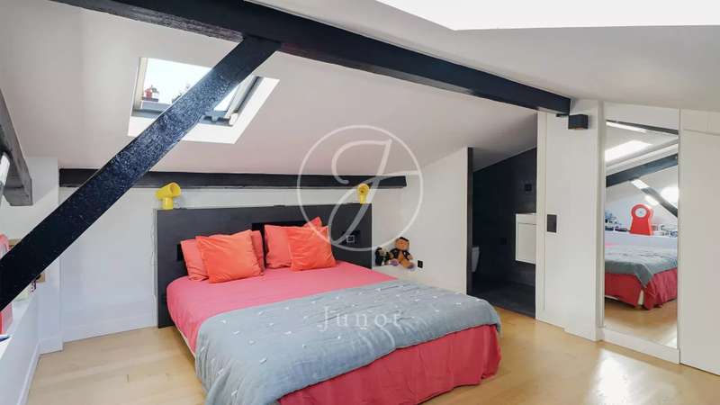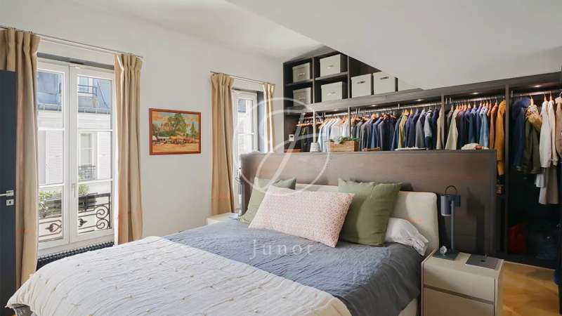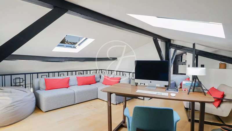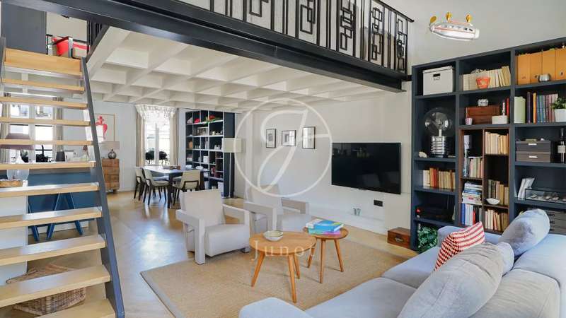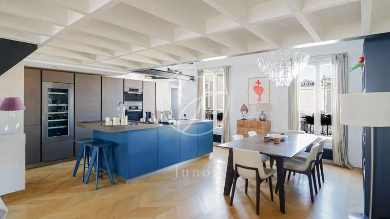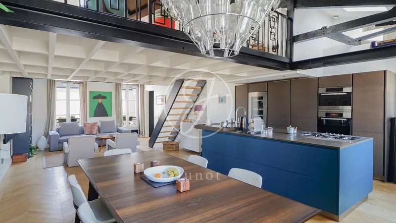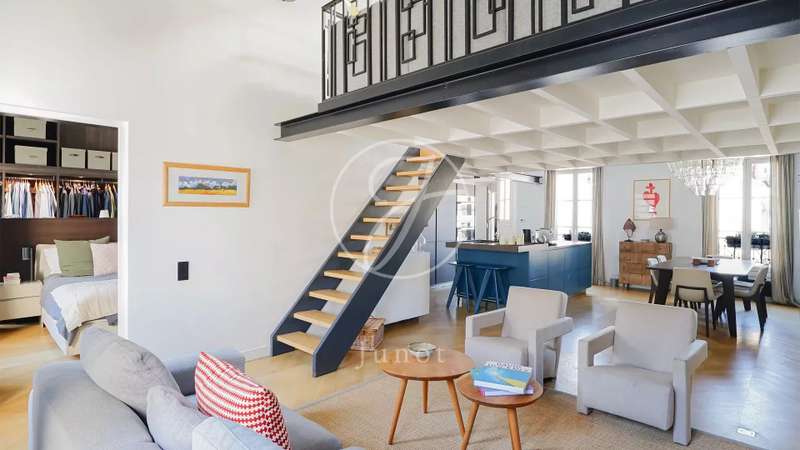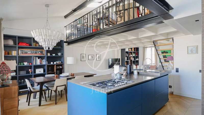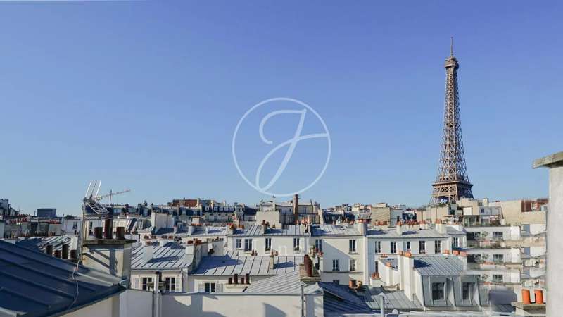 This magnificent duplex apartment of 101.31sqm loi Carrez and 131,07sqm on the ground floor is a true haven of peace, offering a privileged living environment with plenty of sunshine and an unobstructed view of the Eiffel tower. On the top floor, this property comprises an entrance hall, a 48sqm east-west through living room, an open-plan kitchen with a central island and noble materials, equipped with Miele appliances, a master bedroom with a large dressing room, a bathroom with walk-in shower, bath and toilet. This first level also features an office that could become a guest bedroom, a laundry room and a guest toilet. An elegant staircase leads to the upper level, featuring an open-plan mezzanine converted into an office with reading area, an attic bedroom with closet and a shower room with toilet. Located in a quiet street, this duplex is accessible by elevator to the fourth floor, then by a private staircase. It has been renovated by an architect to contemporary taste, with custom-made closets and air-conditioning in all rooms. A cellar completes this offer in a privileged location, very close to the Champ de Mars gardens, the quays of the Seine and the shops of the Gros Caillou district, with Rue Cler just a five-minute walk away. An ideal pied-à-terre.