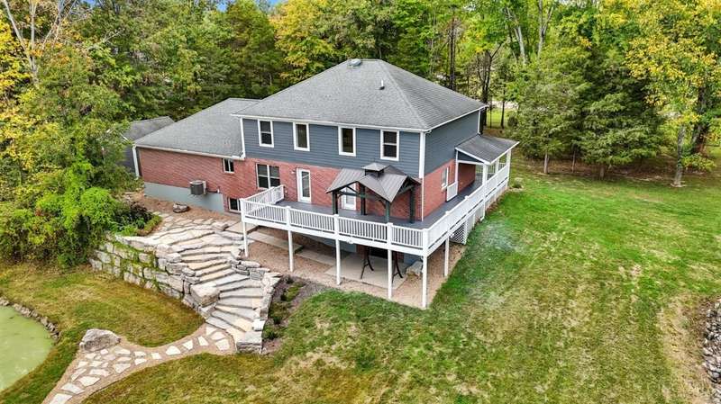 Welcome to Morrow Meadow Farms! This inviting 3-bedroom traditional home with a first-floor primary suite offers over 3,200 square feet of living space and a serene natural setting. The private backyard is a true retreat featuring a wooded view, stone firepit, flowing creek, koi pond, and soothing waterfall, perfect for peaceful relaxation or entertaining. Enjoy outdoor living on the expansive wrap-around deck or the newly finished walkout lower level, which opens to a stunning curved stone staircase and landscaped surroundings. Inside, the home features a spacious layout with a large bonus room, ideal for a fourth bedroom, office, or flex space. The oversized 2.5-car garage and storage shed provide ample room for hobbies, tools, or a workshop. With no HOA and a new HVAC system (2023), this property offers the perfect blend of comfort, functionality, and tranquil living in a beautiful setting.