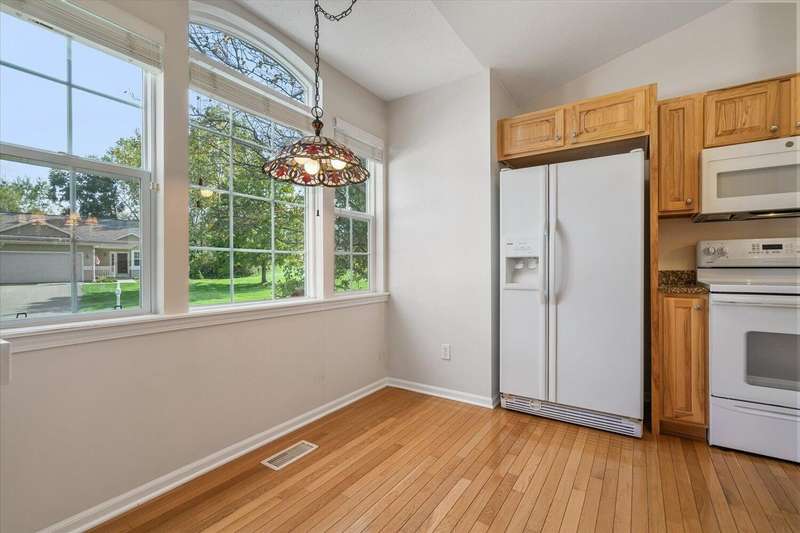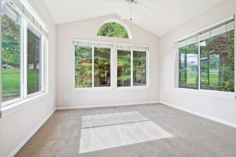 Fabulous End-Unit Condo in Quail Meadows! Welcome to this meticulous, move-in ready home that's been lovingly maintained inside & out. The charming front porch invites you into a warm & welcoming foyer featuring gorgeous hardwood floors that flow throughout the main living area. The open-concept kitchen is a delight, showcasing beautiful cabinetry, granite countertops, & a seamless connection to the dining area & spacious living room. Relax in the inviting living room with vaulted ceilings & cozy gas fireplace, or step into the sunroom-the perfect spot to enjoy your morning coffee while overlooking the private wooded lot & lush flower gardens. The primary suite offers a peaceful retreat with a large walk-in closet and a luxurious bath complete with a jetted tub, separate shower, double vanity, and linen closet. The main floor also includes a convenient laundry area & guest half bath. Love to entertain, the walkout lower level is ideal, featuring a spacious rec room, office or hobby room, a 2nd bedroom, full bath, and plenty of storage space. Recent updates include a new roof, new carpet on the main level, and a new hot water heatermaking this beautiful condo truly move-in ready!