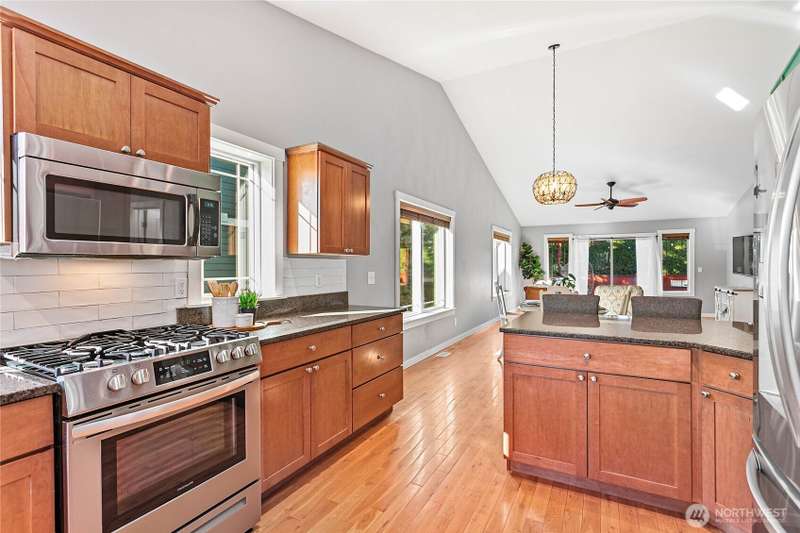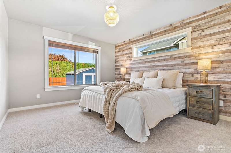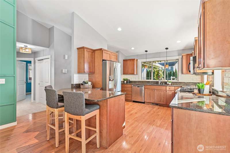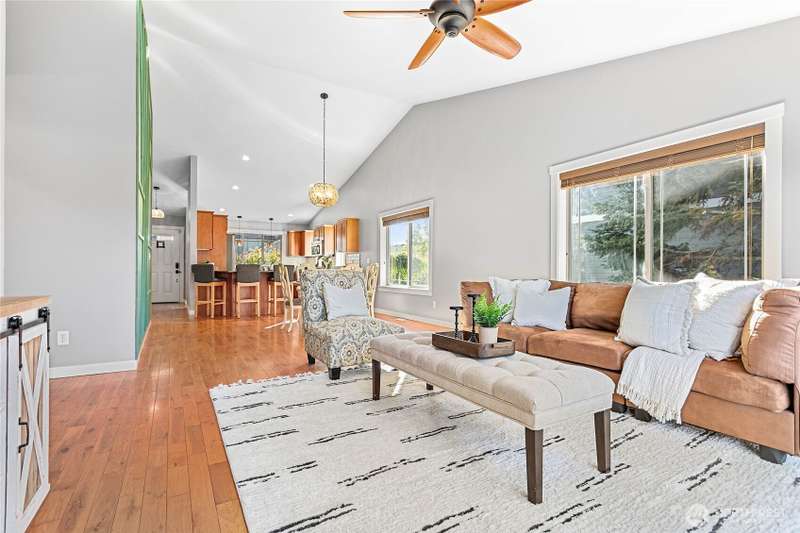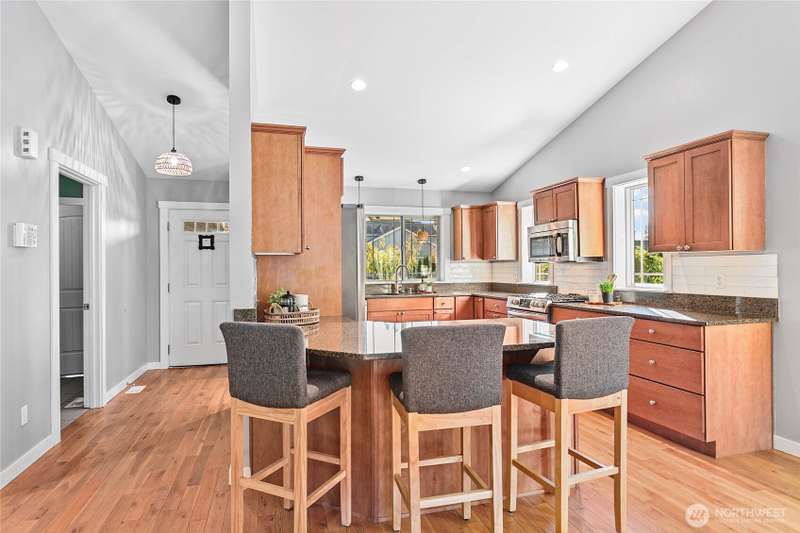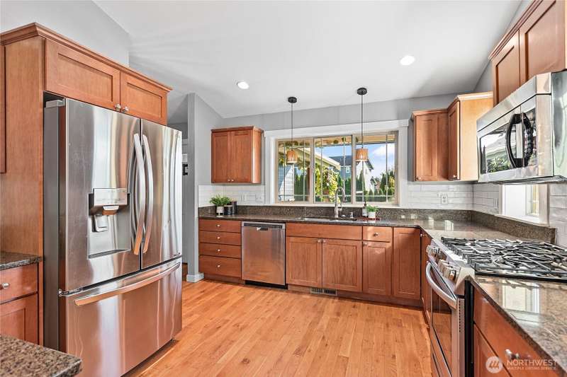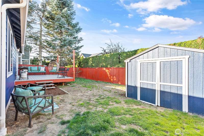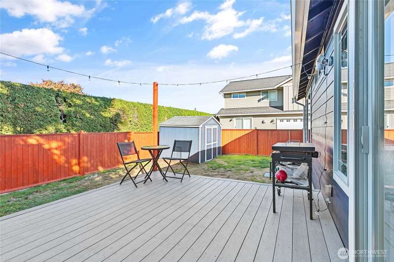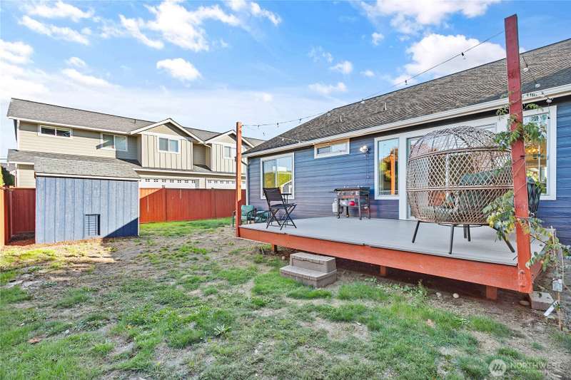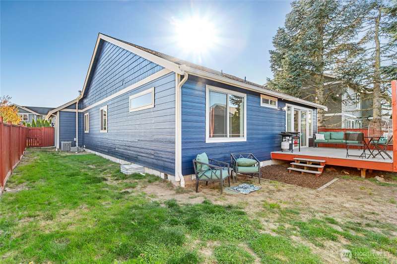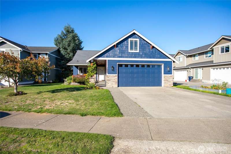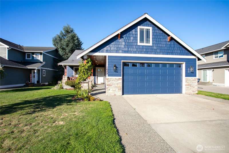 Newly sealed and painted Craftsman single level home. No HOA! Perfect entry level home, investment property or low maintenance living in desirable area. 1445 sf with spacious kitchen, granite countertops, stainless appliances, open concept space. Hardwood floors, new carpets & padding, 3 bedrooms, 2 full baths, lots of natural light, high ceilings and fully fenced yard with composite decking and outdoor shed. Natural gas forced air heating plus A/C! Large storage above garage w/ ladder access, storage shed out back. Sunny lot w/ garden beds, dwarf bing cherry and grapes. Close to city parks, trail systems, golf and local farms. Lynden's known for being the largest Dutch settlement in WA with a charming downtown, featuring a working windmill