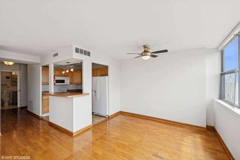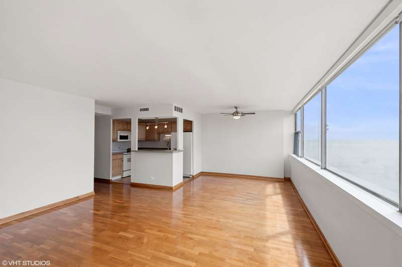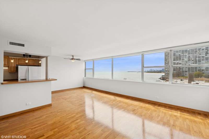 Residence 6V will not disappoint. Enjoy unobstructed views of Lake Michigan, Downtown City Skyline, Navy Pier, fireworks, Edgewater Beach, completely breathtaking from southwest corner Residence sun-drenched with natural sunlight. Residence 6V, renovated features formal entry, wood laminate floors throughout entire unit including bedroom, bathroom, with pedestal sink, new toilet, medicine cabinet, shower glass, tub/ shower combined, gracious bedroom with built in Armoires for folded and hanging clothing storage. Open kitchen concept with beautiful scenic views, breakfast bar, all wood cabinetry, separate dining area, more than adequate living space. Newer windows. Roller shades throughout. Full amenity building features 24 hour doorstaff, onsite maintenance, management and engineering staff. Complete gym, roof top deck for 360 degree views, bicycle storage. Steps away from the Chicago Express bus and EL stop making this a very public transpiration friendly location to Downtown and Loyola University's Campus. Rent includes tangible items including cable, internet, and heat. Electricity is paid outside rent by Tenant. Building offers garage parking for additional fee. No storage with this unit. Renovated unit is available NOW, professionally deep cleaned and freshly re-painted. Parking available through the building at $158 per month, no waiting list