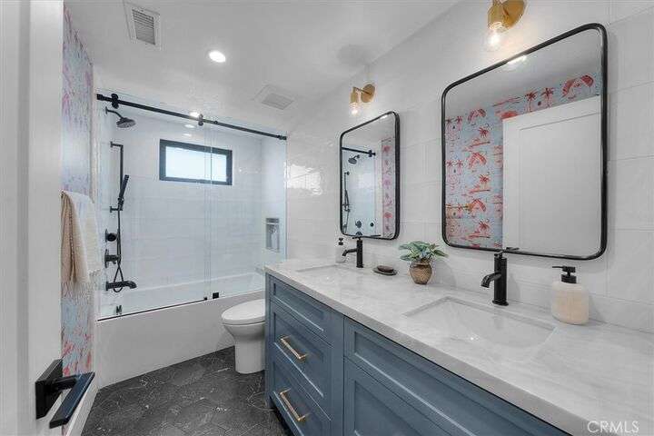 This beautifully remodeled and updated 3-bedroom, 2-bathroom home offers the perfect blend of modern design and coastal charm. Guests are welcomed by an entertainer’s patio with a custom fire feature, leading to a striking Dutch door with brass hardware. Inside, the great room showcases an open-concept layout with a modern kitchen, oversized island, and spacious living area highlighted by vaulted ceilings and white bead board finishes. A warm gas log fireplace with custom, distressed wood mantel and built-in Sonos surround sound system complete the elegant atmosphere. Recent upgrades include new electrical, plumbing and air conditioning, complemented by an Ecobee smart thermostat for efficient climate control. Throughout the home, Restoration Hardware lighting and fixtures pair seamlessly with wide-plank French white oak flooring. The chef’s kitchen is outfitted with Thermador appliances, custom awning windows, and a Fleetwood sliding glass door that extends to a large, attached mahogany deck, providing additional space for entertaining. Beyond, the expansive backyard is finished with turf for easy maintenance, complemented by extensive garden space and plenty of room for recreation. Each of the three bedrooms features vaulted ceilings, custom Smith & Noble window coverings and thoughtfully designed closets. Both bathrooms have been recently upgraded and include marble countertops, custom cabinetry and frameless shower doors. The finished garage includes drywall, industrial epoxy flooring, built-in laundry with storage, and a 220-volt outlet for electric vehicle charging. Ideally located near downtown Manhattan Beach, the Greenbelt, and just minutes from the sand and surf, this home embodies refined coastal living at its best. Architectural plans for remodel/addition available for review.