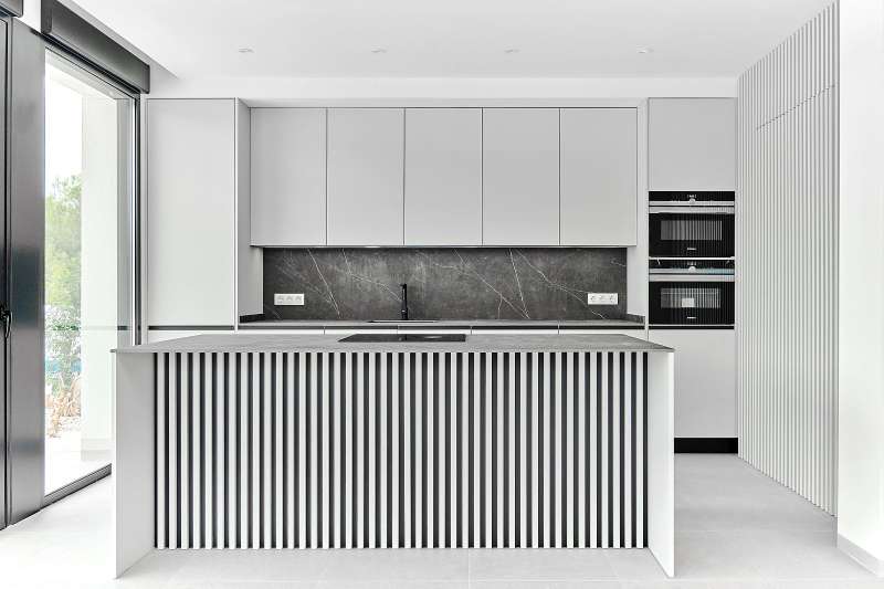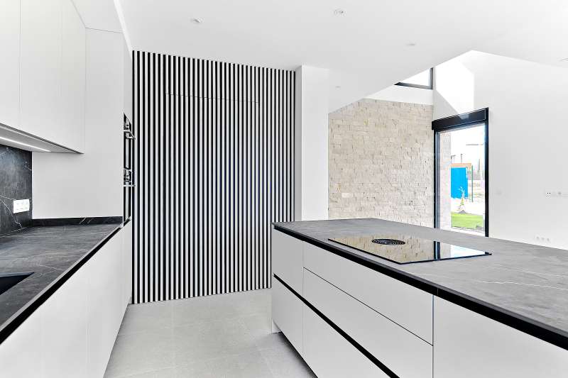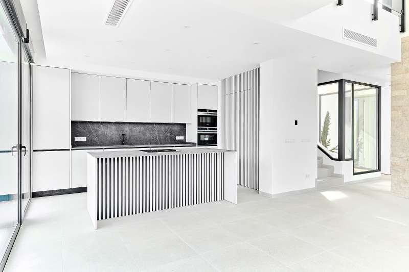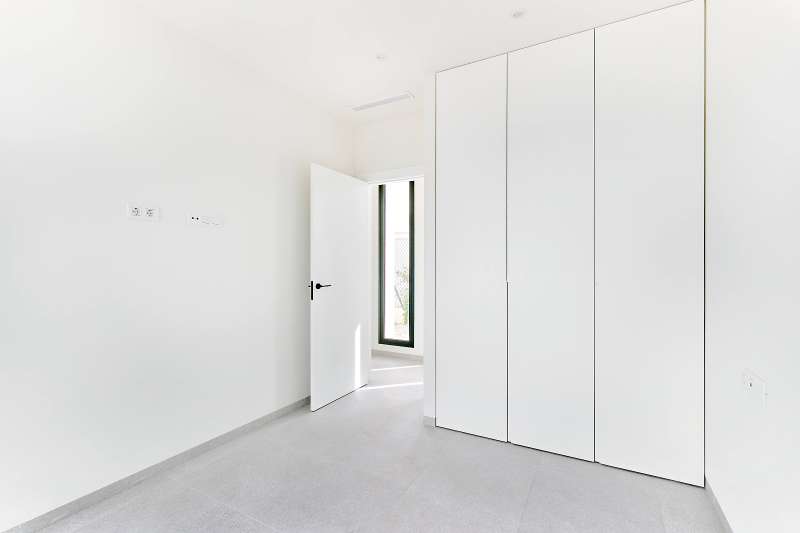 The interior spaces of the villas include 3 spacious double bedrooms all with fitted wardrobes, and 2-3 bathrooms with walk-in showers depending on the model. The master bedroom in all models has an en-suite bathroom. Each villa comes with an open-plan kitchen with an island feature, an open-plan dining area, and a sizeable living space with large French-style windows that allow ample natural light.