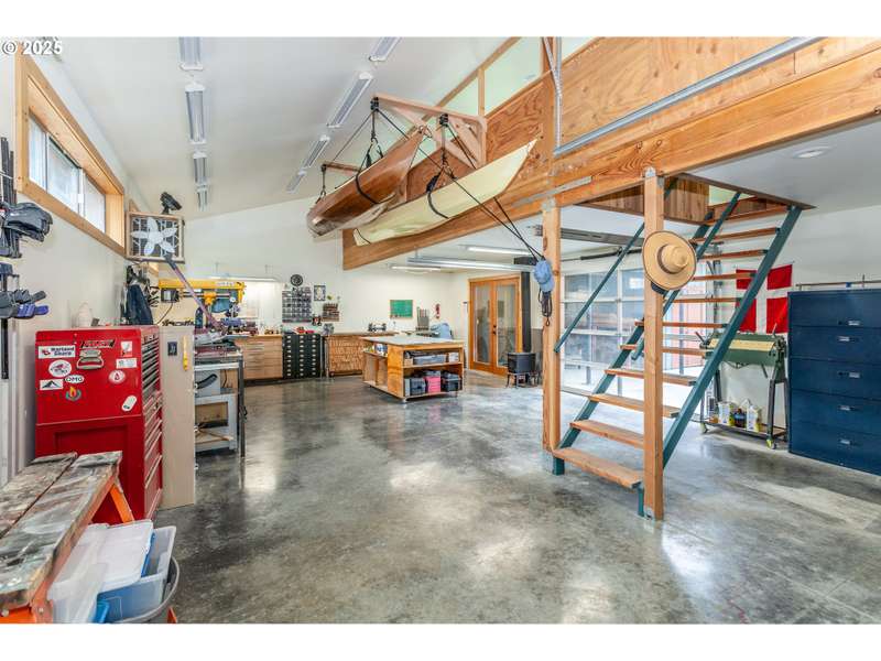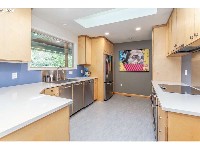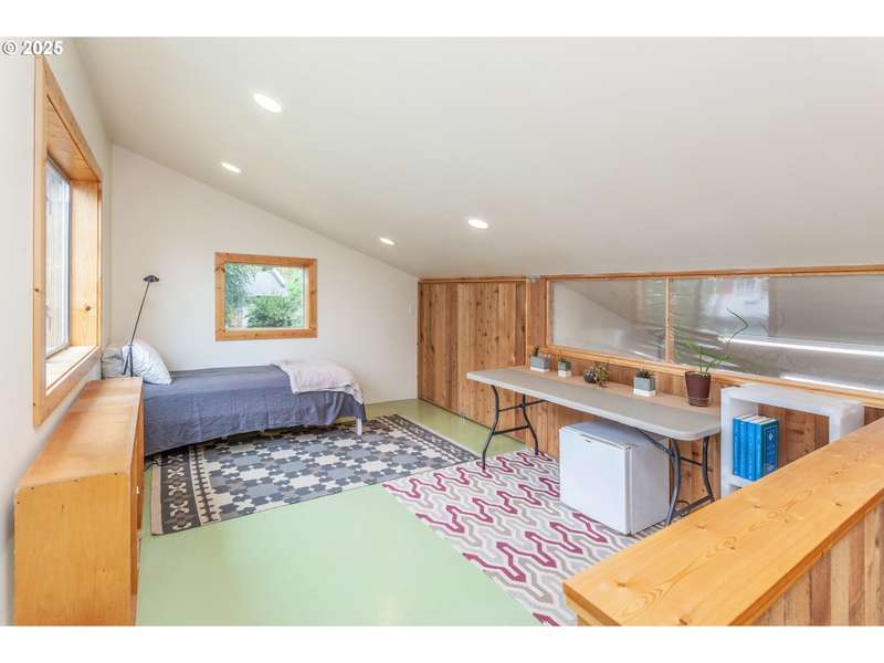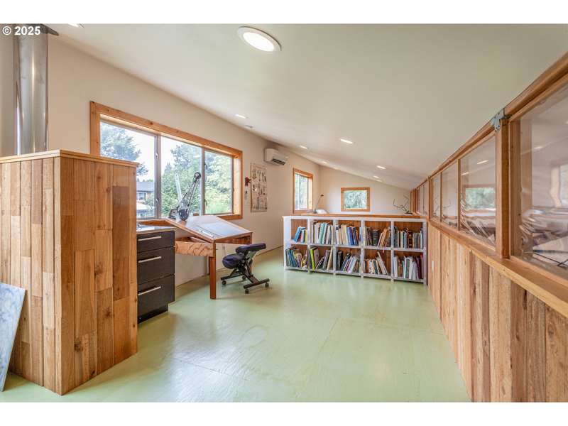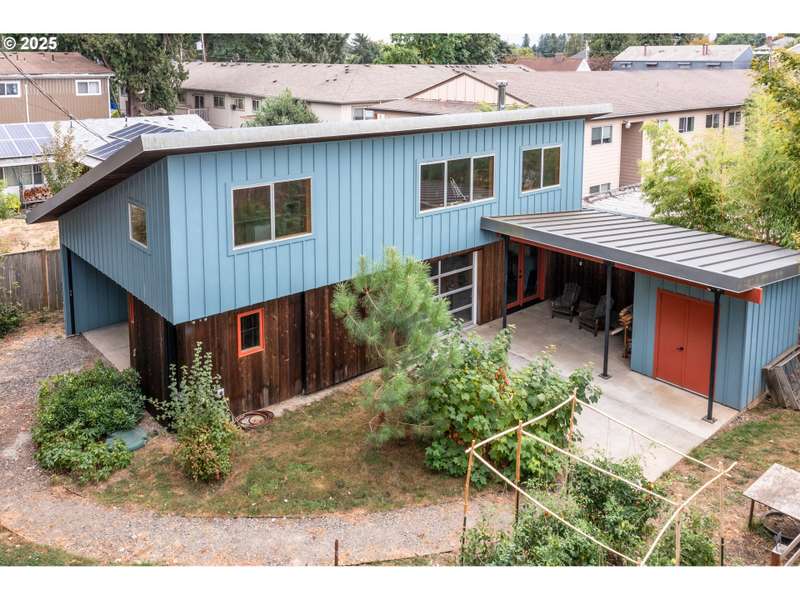 Gorgeous Mid-Century home, plus custom 2 story studio (ADU ready!), on huge .38-acre lot. Truly one of a kind green oasis in the heart of SE Portland. 3 bed 2 bath home has been lovingly maintained and is packed with charm: warm and inviting living room with cozy fireplace, bright open floor plan, gleaming hardwoods and an updated kitchen with custom cabinets, quartz counters, built-in oven, and stainless appliances! 3 generous sized bedrooms on the main floor with updated baths upstairs and downstairs. Large basement has a finished side complete with wood burning fireplace, perfect for family room or additional bedroom. Unfinished side is packed with built-in storage for hobby room or office.Built in 2017, the ADU ready 2 story studio is a work of art with custom track barn doors, 2 roll up glass garage doors, a covered patio and extra storage area! Fully plumbed/wired for kitchen install, with an upstairs loft ideal for living area or bedroom. Minisplit provides heating and cooling. Toasty woodstove on the main. Full bath with custom tile walk - in shower. The yard is thoughtfully designed for natural privacy with mature native landscaping up front plus a wonderful park-like backyard with stone patios, walkways, and a well laid out garden for tomatoes, raspberries, tayberries, artichokes and more, complete with raised beds and drip system! Spacious detached 2 car garage has an extra rear facing garage door for easy driveway access to the back. Solar panels on the studio, and earthquake retrofitting has be done in the home. All in a super convenient location close to stores, restaurants, shopping and transit. This is a must see! [Home Energy Score = 4. HES Report at https://rpt.greenbuildingregistry.com/hes/OR10241760]
