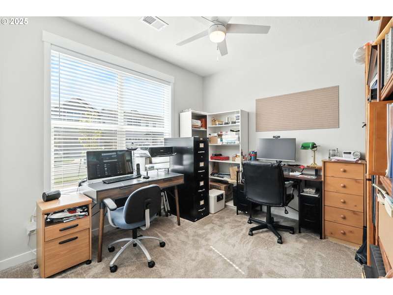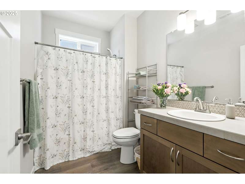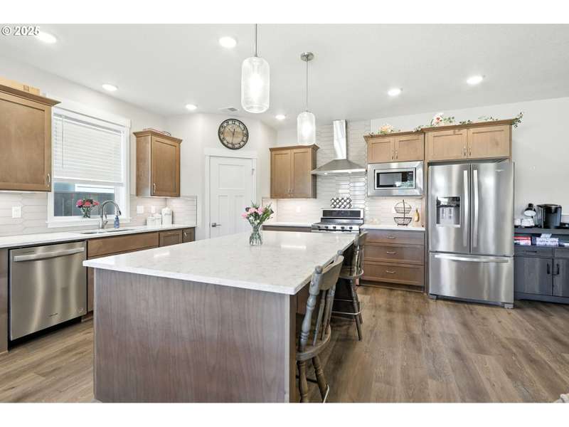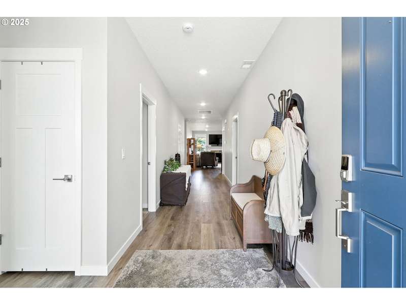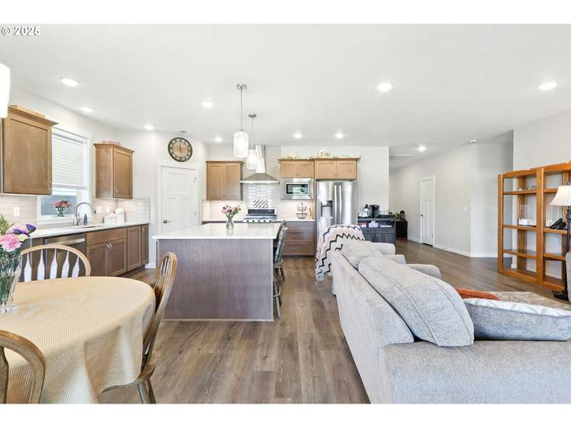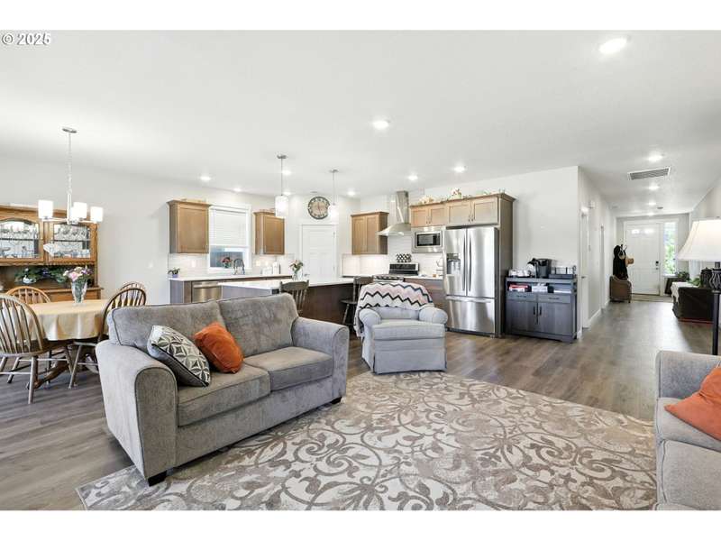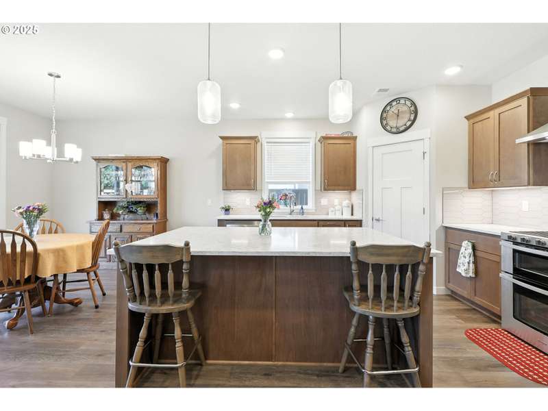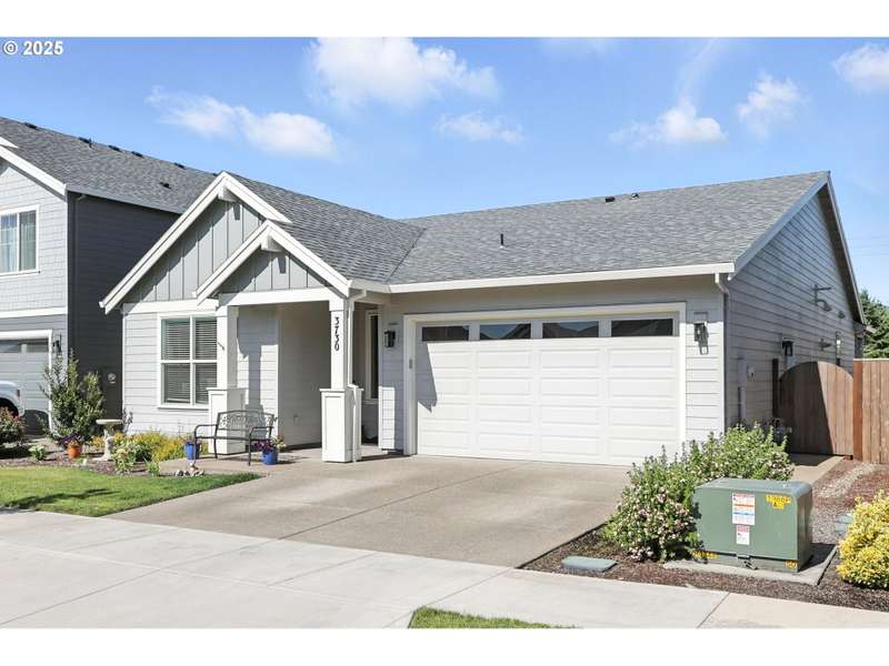 Single-level living! This custom-built Stone Bridge NW home offers all the benefits of new construction—plus thoughtful upgrades already in place! Enjoy a move-in-ready lifestyle with upscale window treatments, full landscaping, and appliances already installed. Backed by peaceful greenspace, this home offers the best of both worlds: the low-maintenance perks of a new community and the serene feel of country living. Inside, you'll find an open-concept layout with modern finishes, including luxury vinyl plank wood floors and a cozy tile surround fireplace. The kitchen is equipped with a large eat-in island, quartz slab countertops, a designer tile backsplash, a gas range with a stainless steel hood, pantry, and plenty of space for cooking. The spacious primary suite overlooks the territorial views and has a large walk-in closet, dual sink vanity, and a beautifully tiled walk-in shower with mosaic detail. A bonus interior storage room offers ideal space for pantry overflow or craft/hobby storage. Enjoy the fully fenced backyard ready for outdoor entertaining with a new deck, a gas line for grilling, ample lawn space, and greenspace/rural views. Rare 2-car garage with extended bay storage—perfect for a trailer, outdoor toys, or workshop. Additional highlights include a tankless water heater, upgraded ceiling fans in all bedrooms, and a large laundry room with a utility sink. Close to Forest Grove High School and Pacific University, and a short drive to charming downtown Forest Grove’s shops, dining, and farmers markets. Enjoy evenings at the nearby Henry Hagg Lake and local wineries!