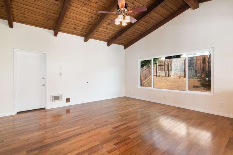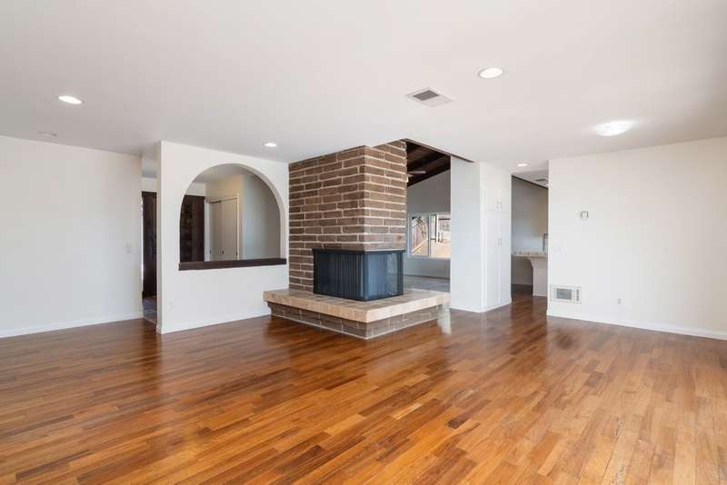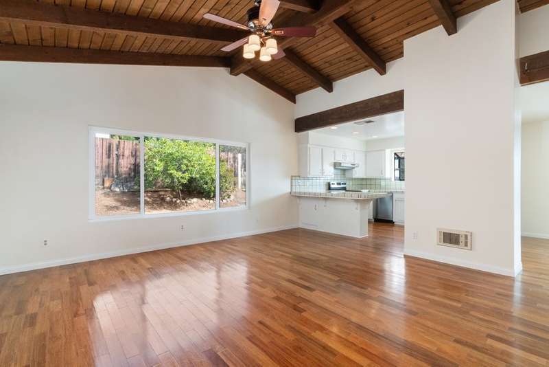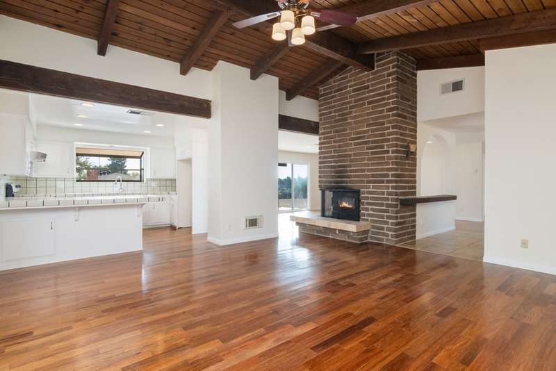 Welcome to this inviting single-story ranch home offering 1,710+- sq. ft. of comfortable living space. Featuring 3 bedrooms and 2 bathrooms, the open-concept layout is enhanced by hardwood floors, vaulted ceilings, and a striking wood beam ceiling in the family room. At the heart of the home sits a large, dual-sided fireplace--creating a warm focal point for both the family room and formal living area.
