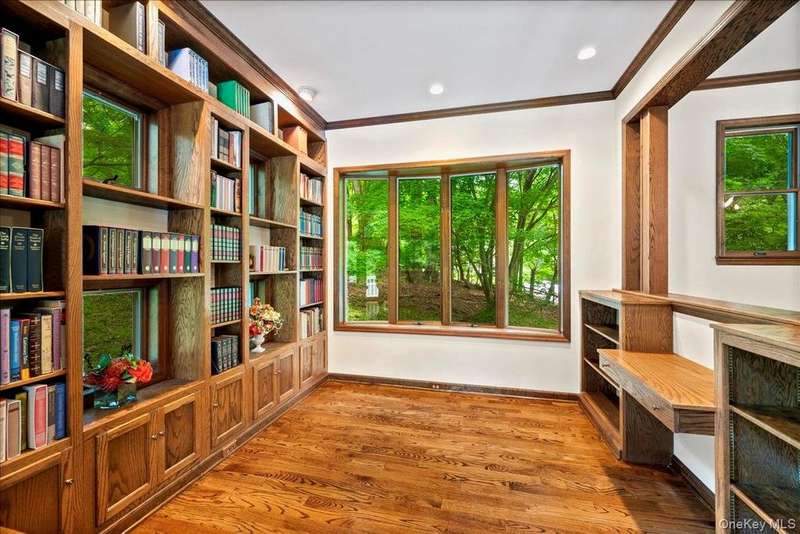 Set on nearly an acre of mature landscaped grounds, this Upper Nyack home offers privacy, style and effortless indoor-outdoor living. A bespoke library with floor to ceiling book shelves and a light filled south facing family room addition, brings architectural interest, complemented by natural wood finishes, cathedral ceilings and a wood burning fireplace. Beautiful hardwood floors run throughout the first level . Featuring 4 /5 bedrooms and 3 baths including an ensuite primary this layout is both spacious and functional. Outside an in-ground pool and huge deck anchor the tranquil backyard, ideal for entertaining or unwinding. Just minutes from Hook Mtn State Park, River Hook and scenic nature trails this property blends unique design with a connection to nature. Upper Nyack Elementary and Clarkstown pools and parks. All this and only a 45 minute drive into mid-town Manhattan.