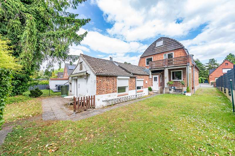 This old building presents itself in the style of the 1920s with characteristic red brickwork and an architecturally charming rounded hipped mansard roof. The main house has 3.5 rooms and is spread over approx. 122 m² of living space. In the adjoining extension from 1951, there are 2 adjoining rooms plus kitchen and bathroom and guest WC with approx. 55 m². The heating is provided by two efficient gas central heating systems from 2001. The general condition of the property corresponds mainly to the 1980s and requires energy modernization. We will be happy to provide you with a virtual tour in advance to help you estimate the implementation costs. The plot is extremely spacious with a width of approx. 15 m and a depth of approx. 60 m and impresses with its fantastic west-facing orientation - ideal for sunny afternoons and evenings in the garden. Development possibilities: The plot is subject to the planning law "BS Iserbrook-Sülldorf (4th amendment)" dated 13.09.1960 and "BS Iserbrook-Sülldorf" dated 14.01.1955. According to the development plan, development is possible in accordance with W2o: - Residential area - Two full storeys - Open construction This also makes a new-build project realistic and attractive - be it a modern detached house or a semi-detached house solution. For further information, please contact us by telephone. PLEASE REFRAIN FROM SPONTANEOUS, UNSCHEDULED PROPERTY VIEWINGS, AS THE PROPERTY IS STILL OCCUPIED.