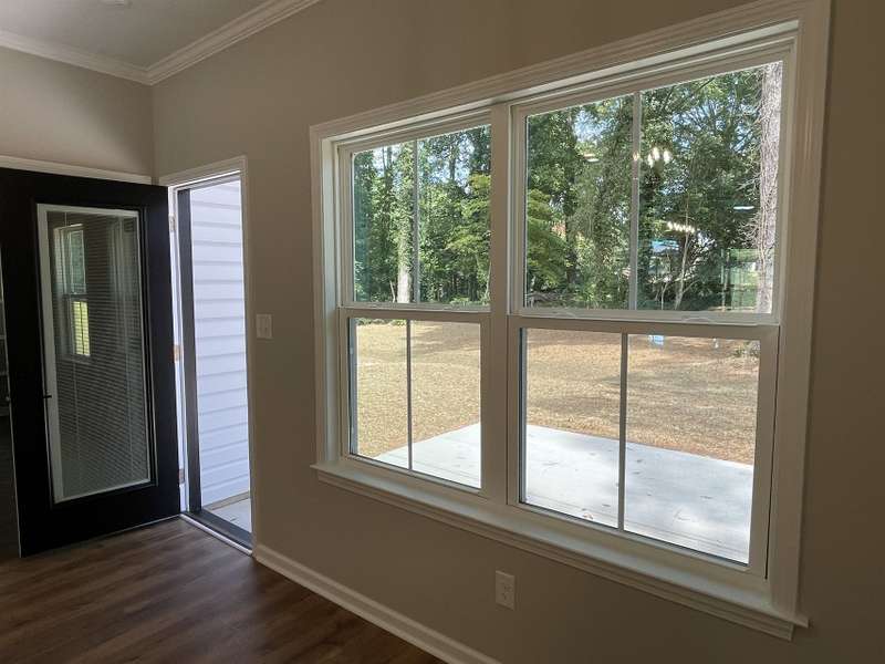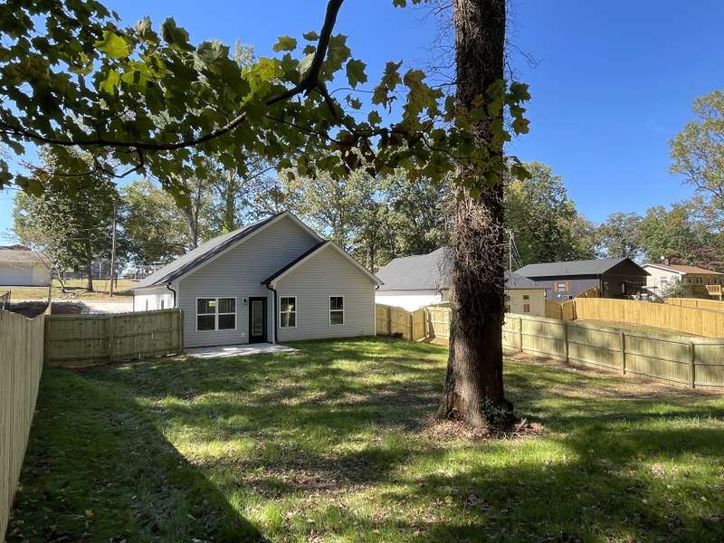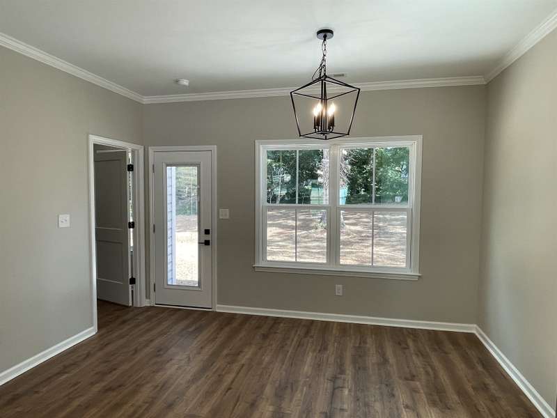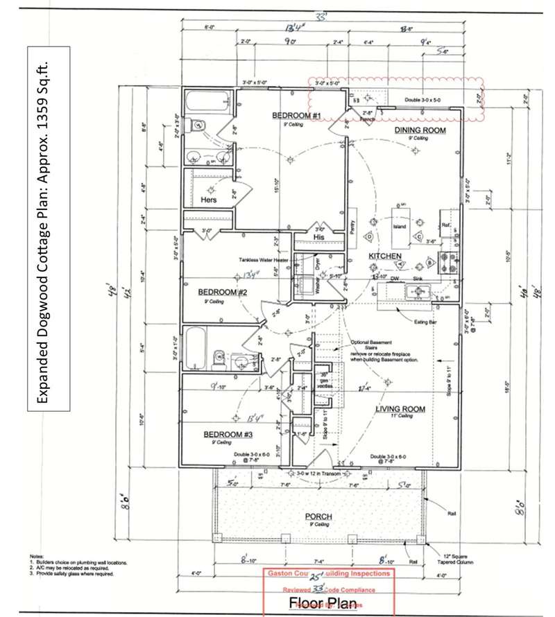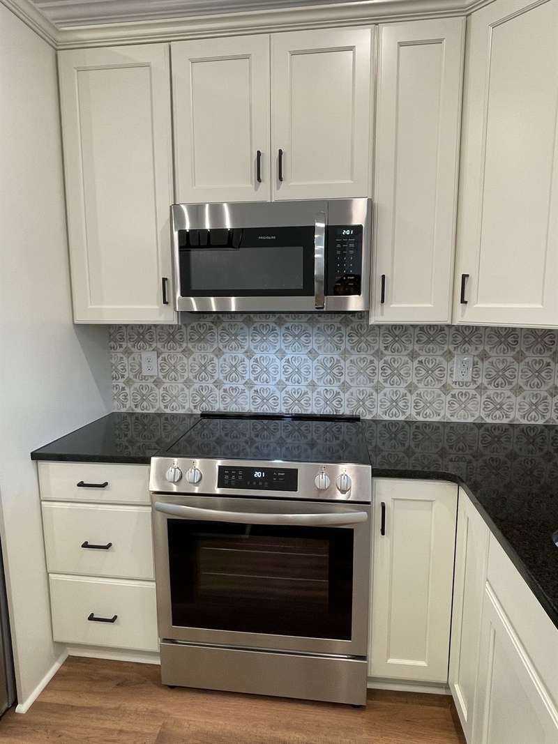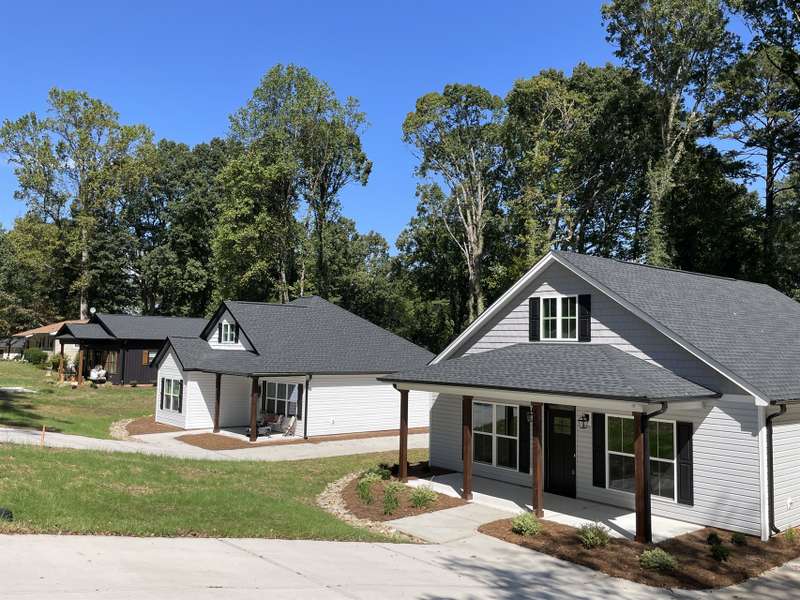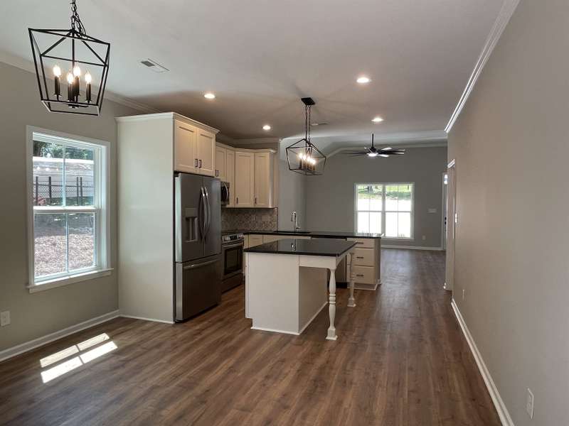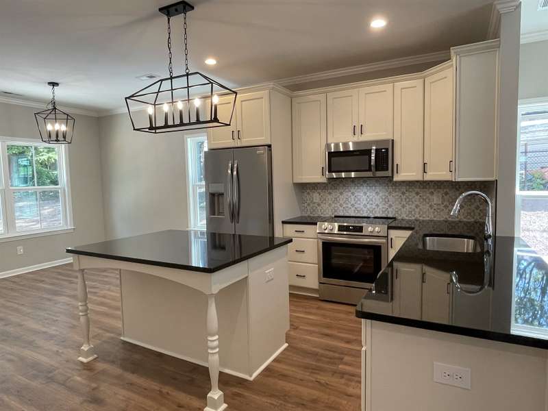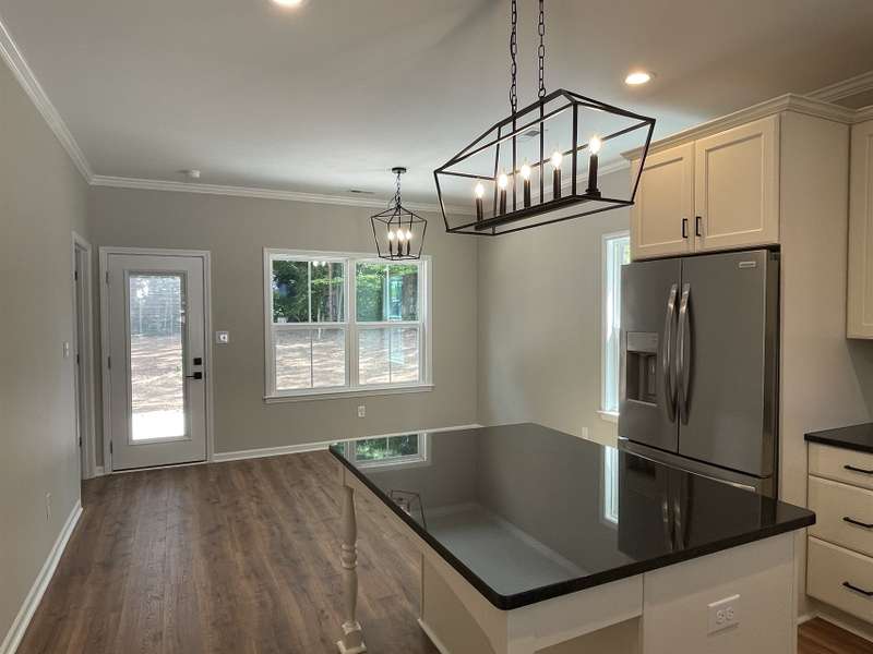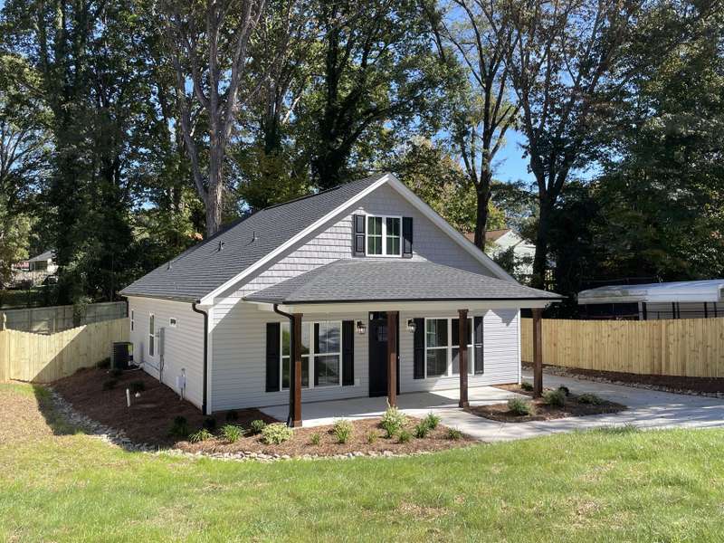 Expanded Dogwood Cottage plan completed and move-in ready. Includes stainless steel kitchen appliance package with refrigerator. Has granite counter tops in kitchen and baths, and tiled kitchen backsplash, as well as a tasteful granite-topped kitchen island/breakfast bar with table legs. Wood-look laminate LVT throughout except tiled bathrooms. Primary BR has walk-in closet and bath with step-in shwr with a tiled surround and glass door. Covered front porch. Landscaped with shrubbery and rock. Architectural roof. Efficient all electric with heat pump. Extended driveway parking pad on the right side of the house with sidewalk curving to the 12x12 patio. Back yard and right lot line has 5' wooden privacy fence. See Matterport tour to walk through similar standard Dogwood plan (though this expanded plan is approx 63 sq.ft. larger than representative tour). Only 16 miles to Charlotte Douglas!