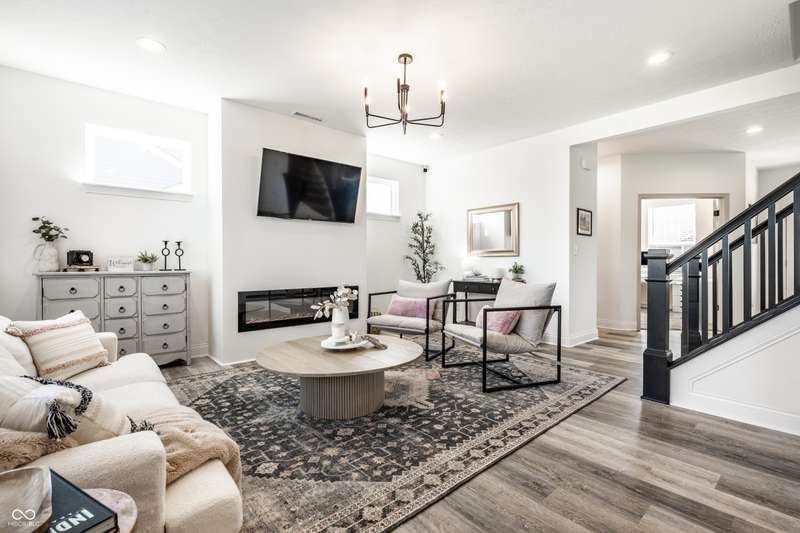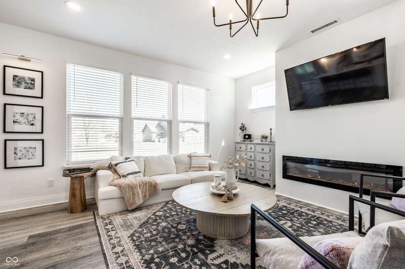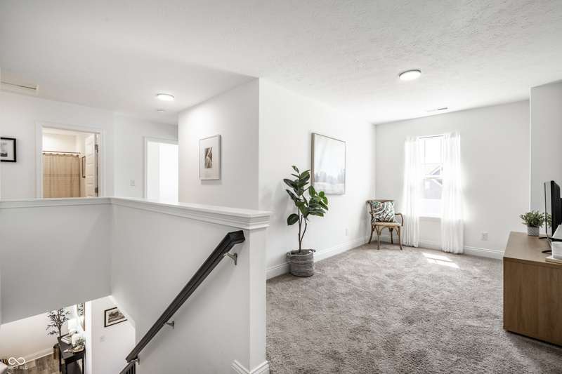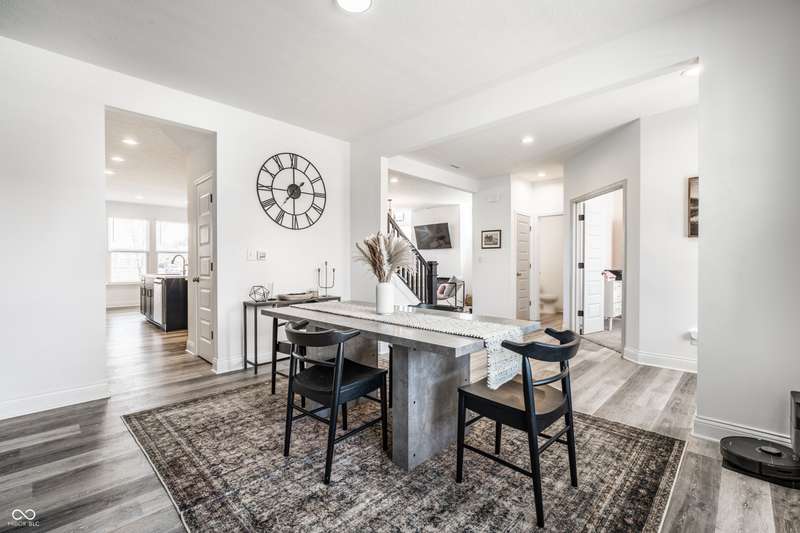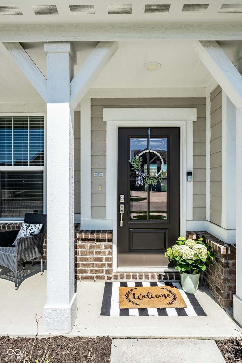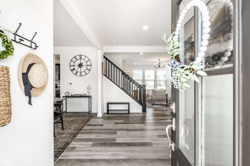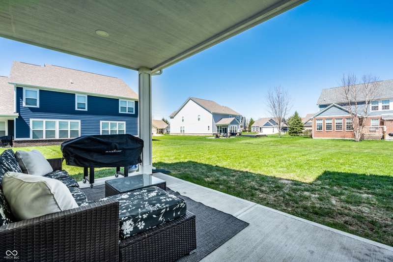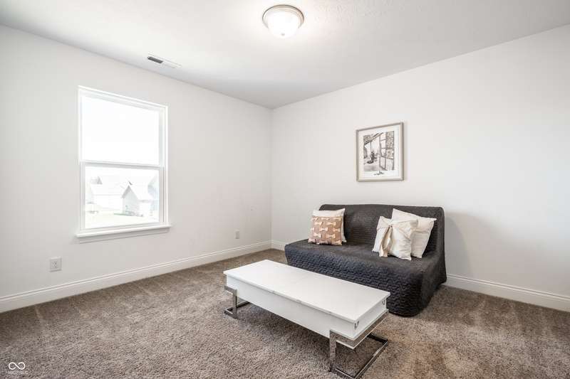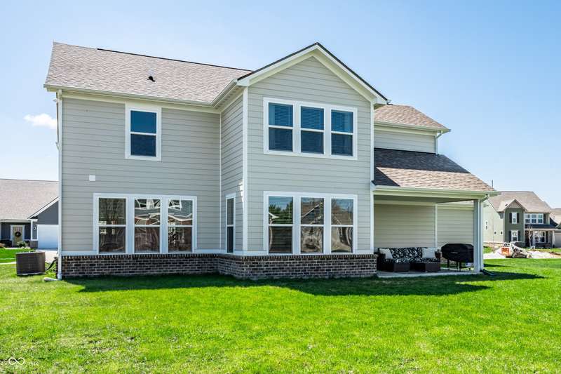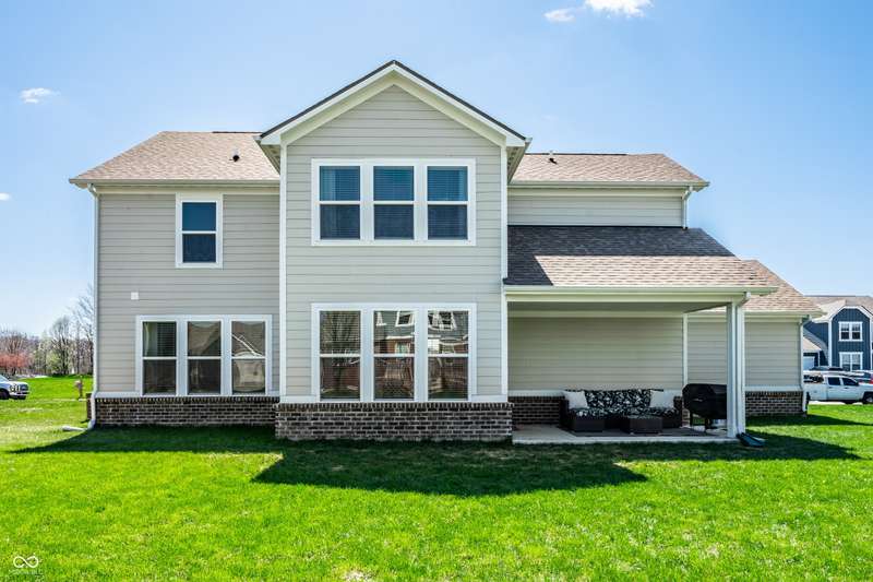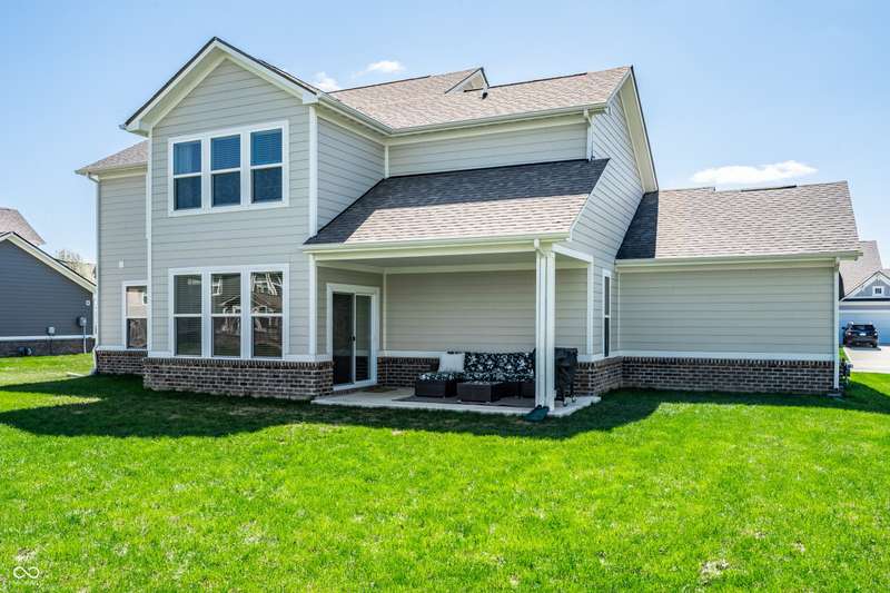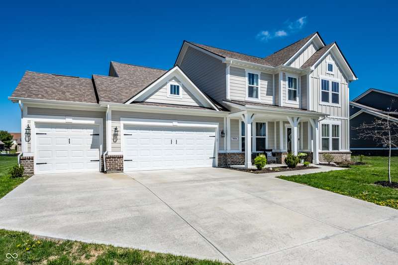 NEW PRICE LOW PRICE! Welcome to this nearly new, beautifully crafted 2 story home where modern comfort meets timeless charm! Boasting a cozy, inviting covered front and back porch, farmhouse-style elevation and neutral color palette, this home is ready for its next chapter. Step inside the foyer to discover an open-concept layout designed for both everyday living and effortless entertaining. Off the foyer, the formal dining room offers an elegant space for hosting dinners and holiday gatherings and sits across from a versatile flex room, perfect as a private home office, den or guest bedroom. The spacious great room, anchored by a cozy electric fireplace, seamlessly flows into the stunning kitchen where gleaming white granite countertops, bar center island bar seating, stainless steel appliances and not one, but two pantries for ample storage are a chef's dream. The additional breakfast area opens onto a covered back patio and over a 1/4 acre lot, ideal for morning coffee or evening get-togethers with an adjacent mudroom providing a landing spot to organize bags, coats and shoes after a long day. Upstairs, the spacious primary retreat is bathed in natural light and includes a spa-inspired en suite bathroom with tiled walk-in shower, dual-sink vanity, generous walk-in closet plus linen closet. The dual temperature control and second-floor laundry just steps away add convenience and comfort. In addition to the remaining 3 upstairs bedrooms, a loft offers additional flexible living space, perfect as a playroom, media room or creative studio. As a bonus, the roomy, finished 3-car garage includes an extra rear storage area, perfect for tools, bikes or seasonal items. With its prime location near shops, dining and quick access to Hwy 52 and I-465, this home checks all the boxes!