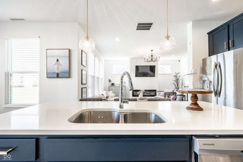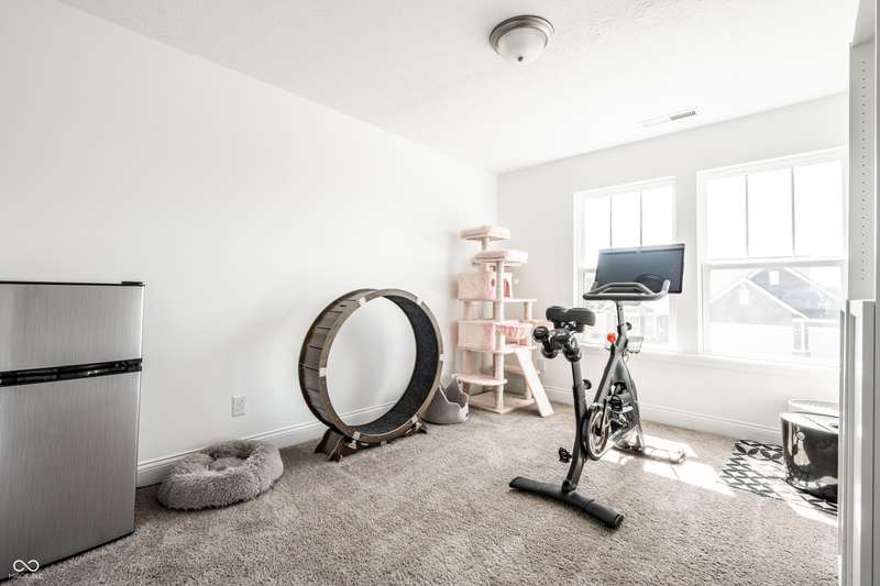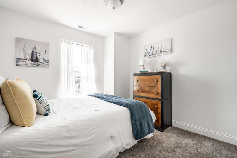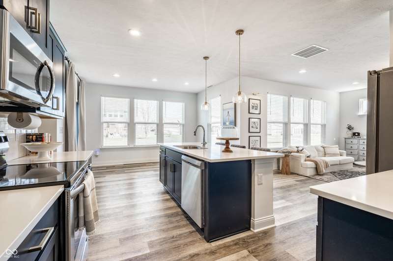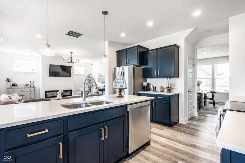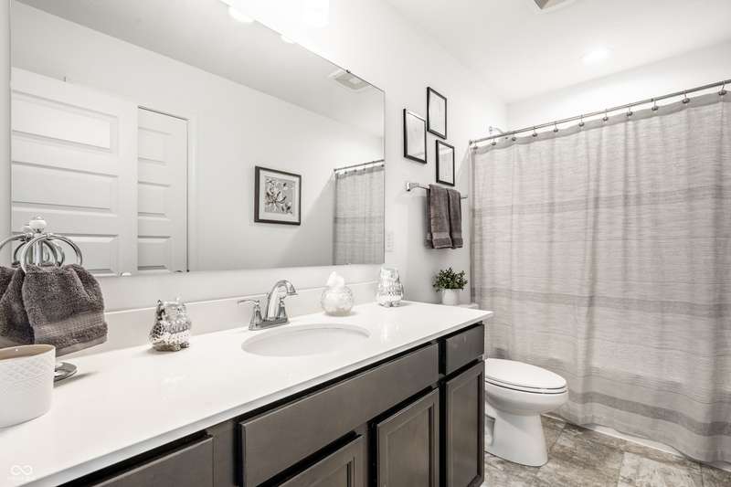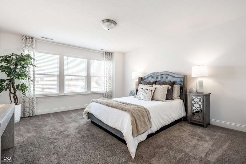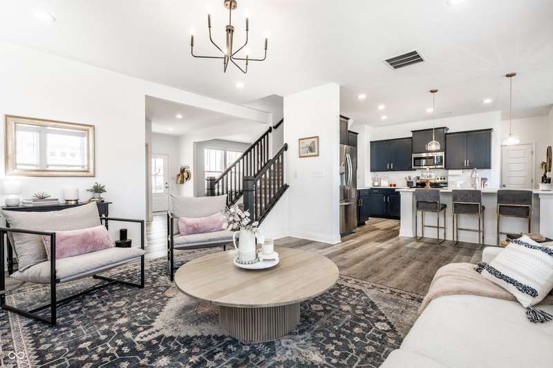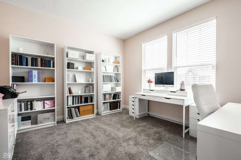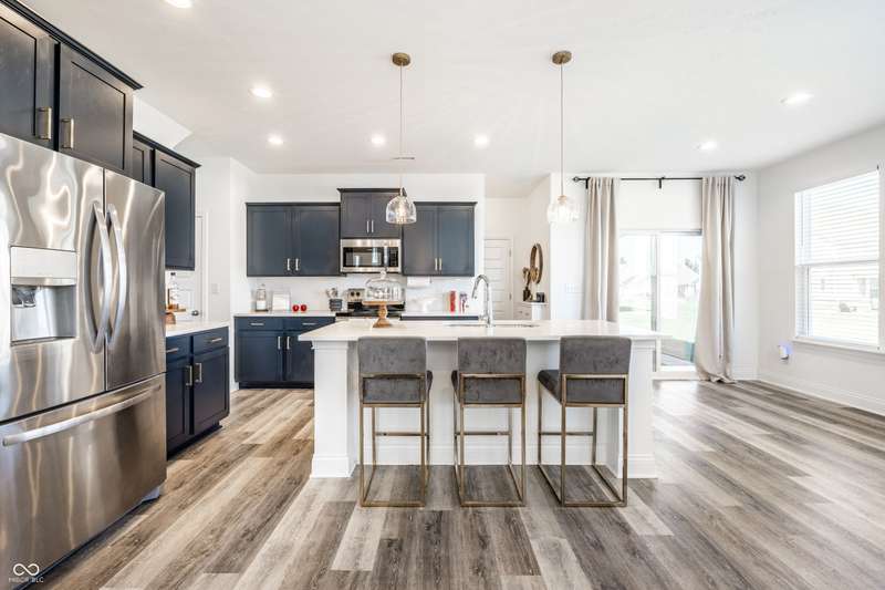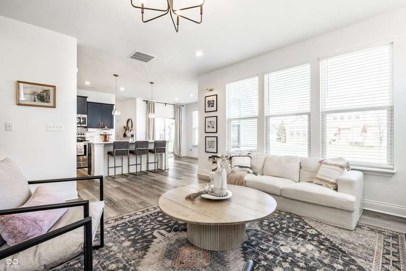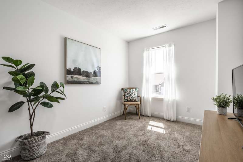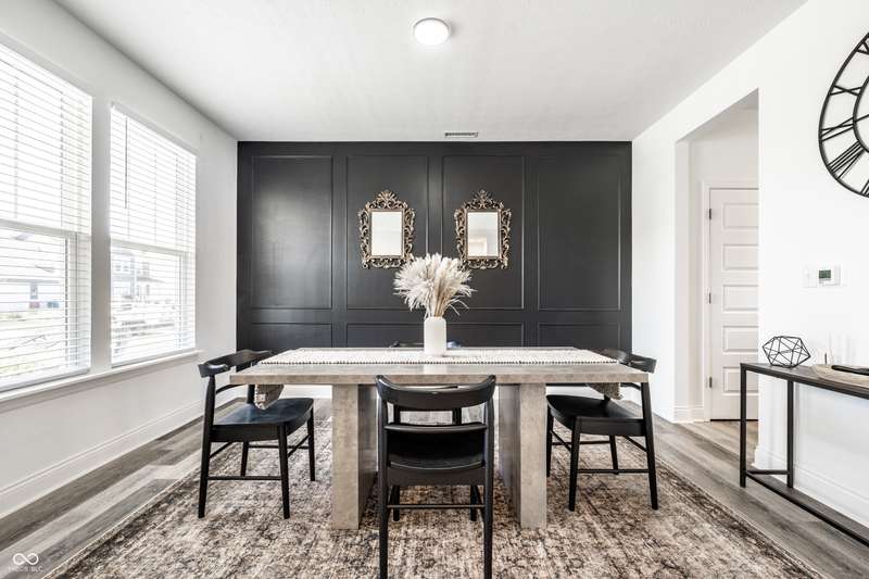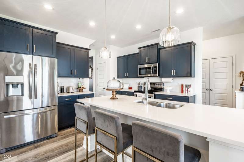 NEW PRICE LOW PRICE! Welcome to this nearly new, beautifully crafted 2 story home where modern comfort meets timeless charm! Boasting a cozy, inviting covered front and back porch, farmhouse-style elevation and neutral color palette, this home is ready for its next chapter. Step inside the foyer to discover an open-concept layout designed for both everyday living and effortless entertaining. Off the foyer, the formal dining room offers an elegant space for hosting dinners and holiday gatherings and sits across from a versatile flex room, perfect as a private home office, den or guest bedroom. The spacious great room, anchored by a cozy electric fireplace, seamlessly flows into the stunning kitchen where gleaming white granite countertops, bar center island bar seating, stainless steel appliances and not one, but two pantries for ample storage are a chef's dream. The additional breakfast area opens onto a covered back patio and over a 1/4 acre lot, ideal for morning coffee or evening get-togethers with an adjacent mudroom providing a landing spot to organize bags, coats and shoes after a long day. Upstairs, the spacious primary retreat is bathed in natural light and includes a spa-inspired en suite bathroom with tiled walk-in shower, dual-sink vanity, generous walk-in closet plus linen closet. The dual temperature control and second-floor laundry just steps away add convenience and comfort. In addition to the remaining 3 upstairs bedrooms, a loft offers additional flexible living space, perfect as a playroom, media room or creative studio. As a bonus, the roomy, finished 3-car garage includes an extra rear storage area, perfect for tools, bikes or seasonal items. With its prime location near shops, dining and quick access to Hwy 52 and I-465, this home checks all the boxes!