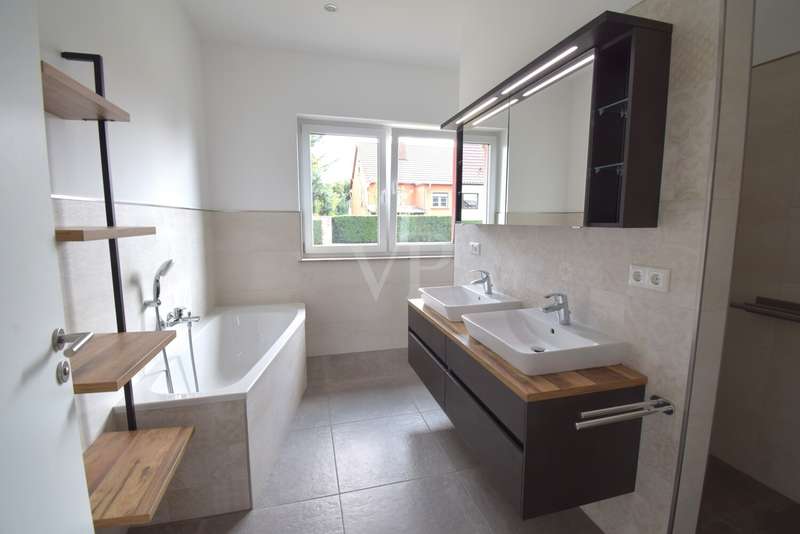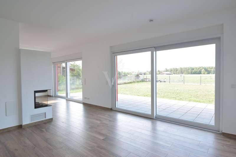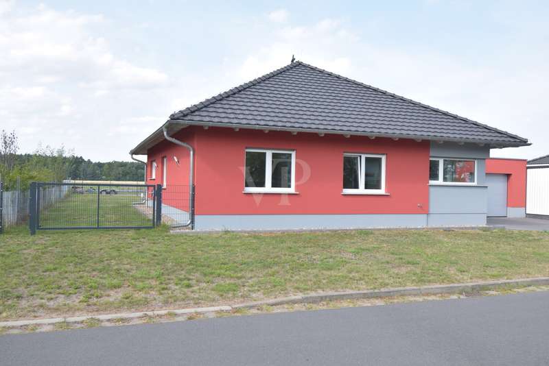 This Tuscany-style bungalow stands on a plot of 860 m² in the small Spreewald village of Kuschkow. Located in a cul-de-sac with far-reaching views of fields and meadows, this energy-efficient house (KfW 55) could become your new home. The house is heated with an energy-efficient, environmentally friendly brine-water heat pump. An additional fireplace in the open-plan living/dining area creates a cozy atmosphere. The garage and a small workshop/storage room can be accessed directly from the house. There is a further parking space on the property. The garden offers enough space to create a green oasis with wellness elements or other outdoor dreams. The highlight of the bungalow is the large window front facing the garden. The bright and open rooms make you want to spend a lot of time here. The kitchen and the living and dining area with the fireplace in the middle are the heart of the property. Here you can spend time together. The huge glass elements of the window façade ensure optimal light and a consistently positive living atmosphere. The kitchen is adjoined by a practical pantry for storage. Two further rooms can be used as a bedroom, office, children's room or guest room. The daylight bathroom with bathtub, double washbasin and barrier-free shower with a modern tiled look is an inviting wellness oasis. A large utility room offers sufficient space for heating technology and plenty of storage space. Come and see this property for yourself!