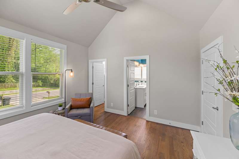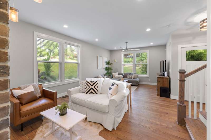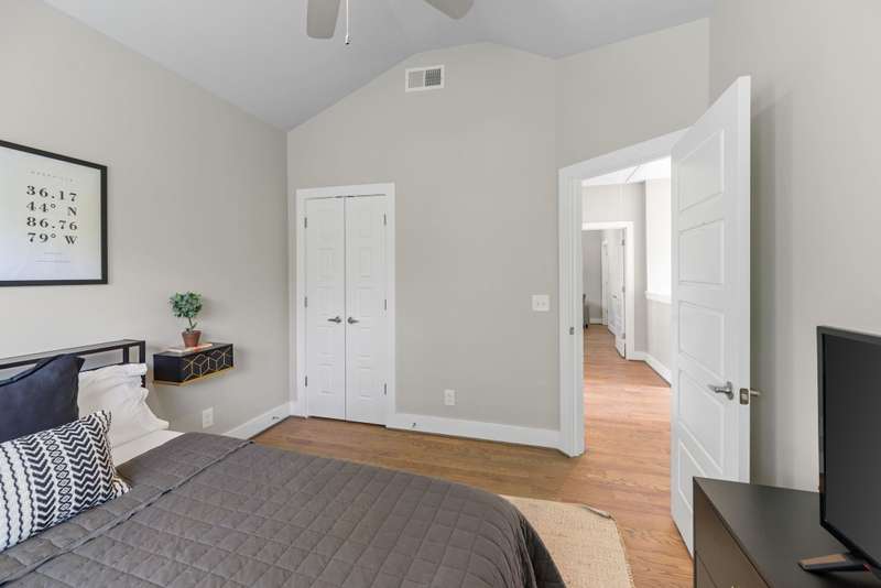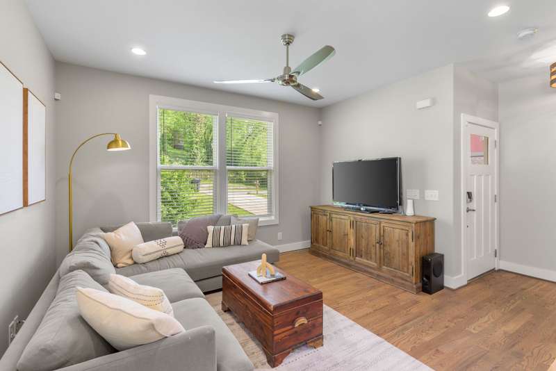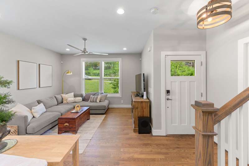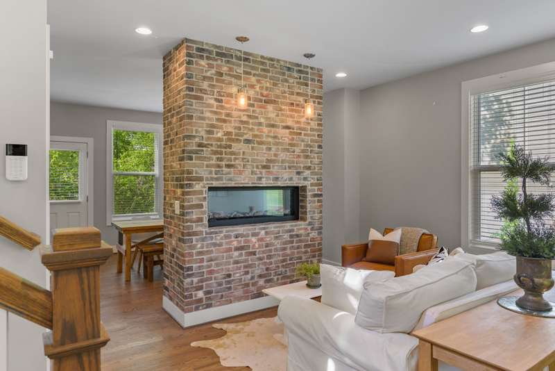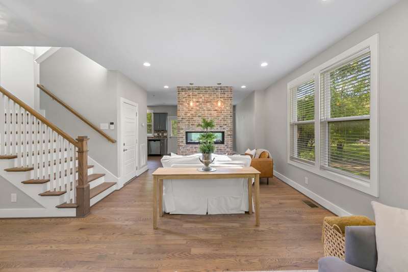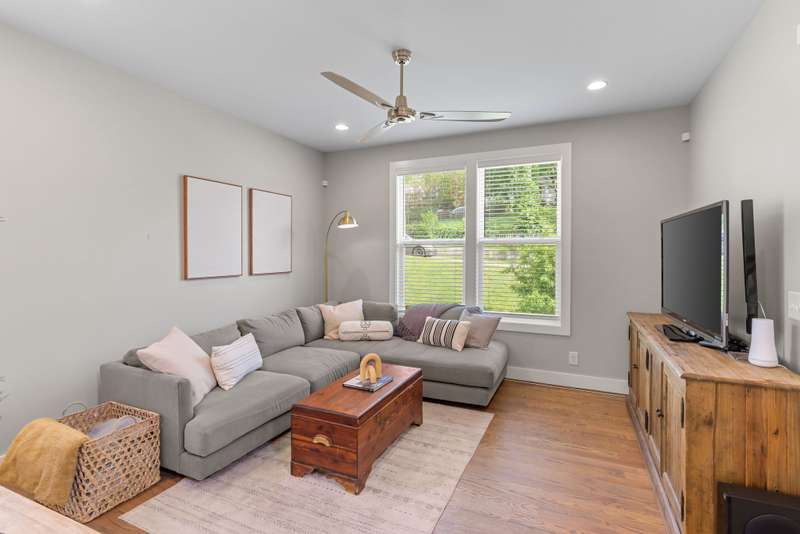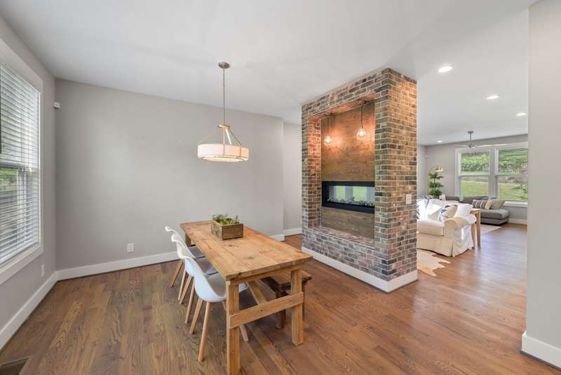 Spacious and stylish, this home features an open floor plan with hardwood floors, large windows, and a stunning double-sided brick fireplace between living and dining areas. The kitchen offers granite countertops, and stainless appliances. Upstairs: a private primary suite with walk-in closet, plus two more bedrooms and full bath. Laundry also on bedrooms level! The finished walk-out basement includes a 17x26 media/game room with built-in banquette and a 12x7 fitness room--ideal for today's lifestyle. Located just minutes from Downtown Nashville, GEODIS Park, and Nolensville Pike dining.