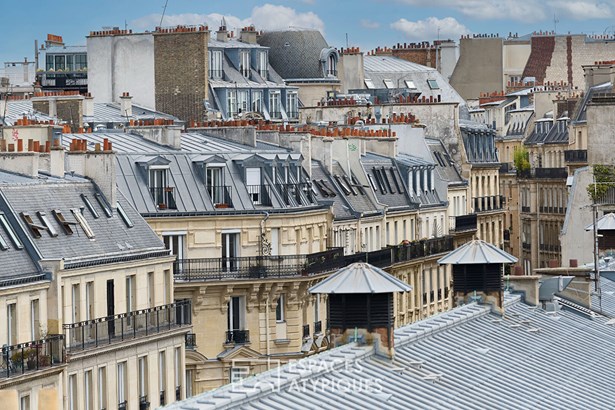 The exterior is the main asset of this atypical apartment: the panoramic terrace, completely unoverlooked, facing East/South/West, reveals a clear view of the rooftops and the Eiffel Tower.