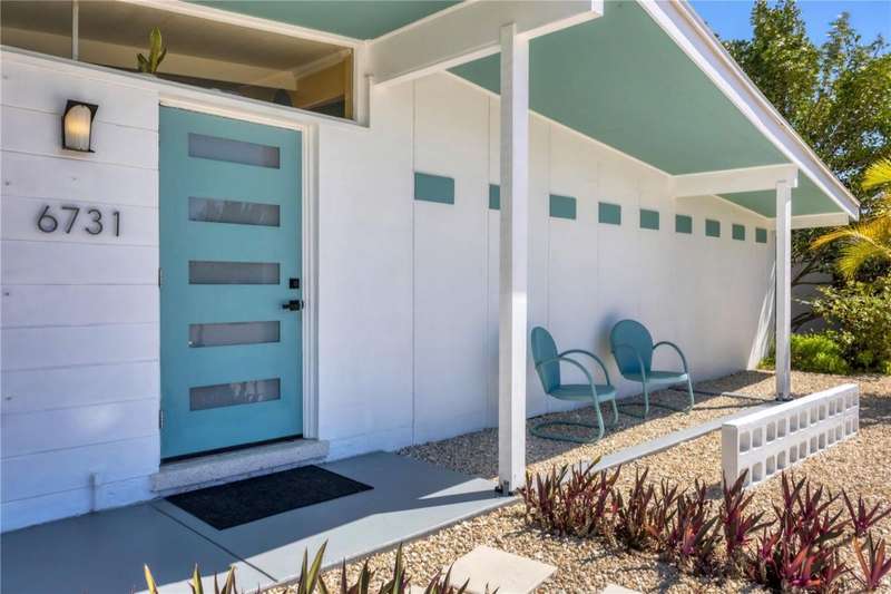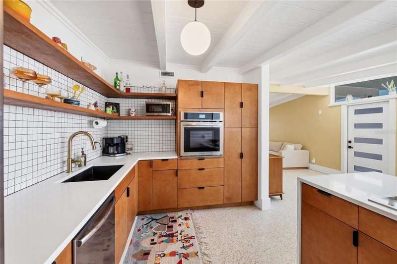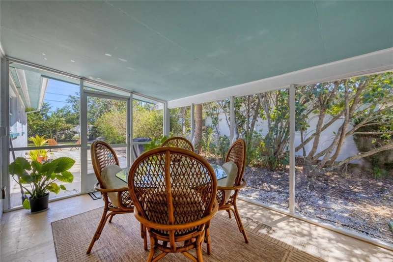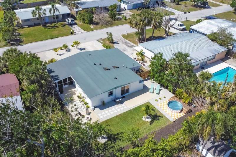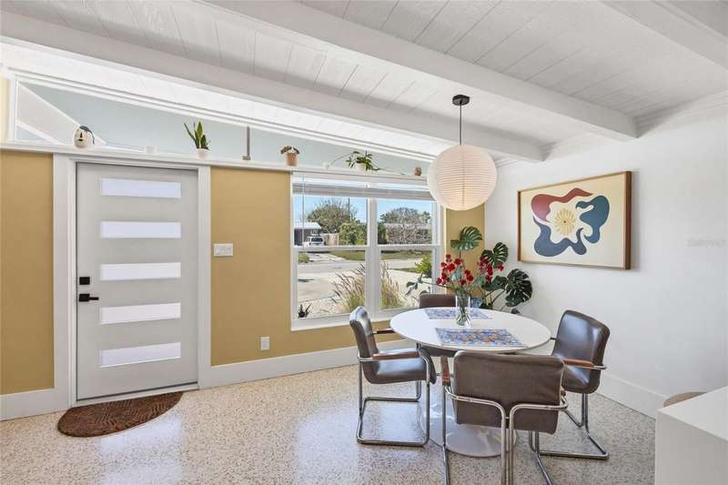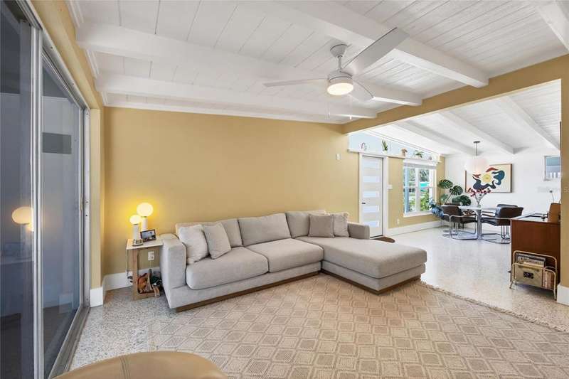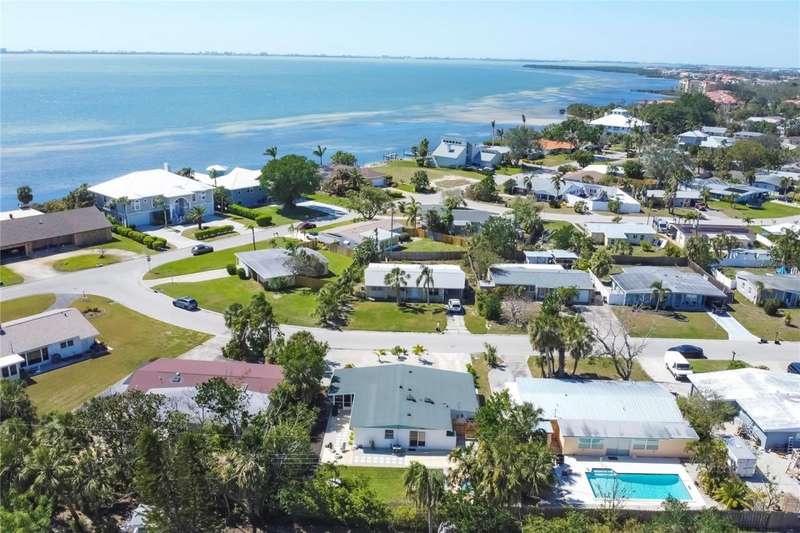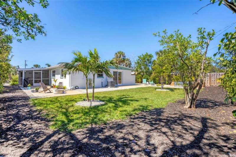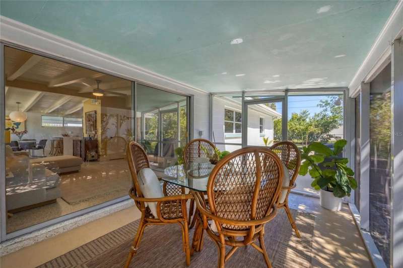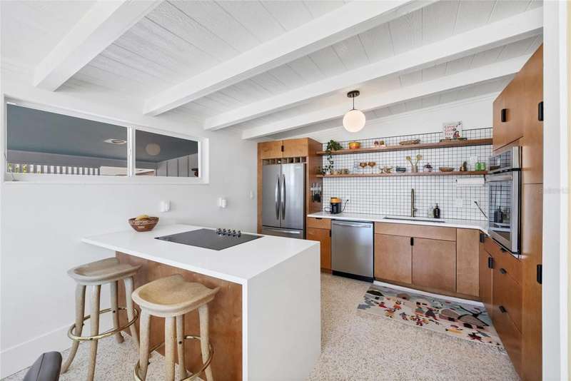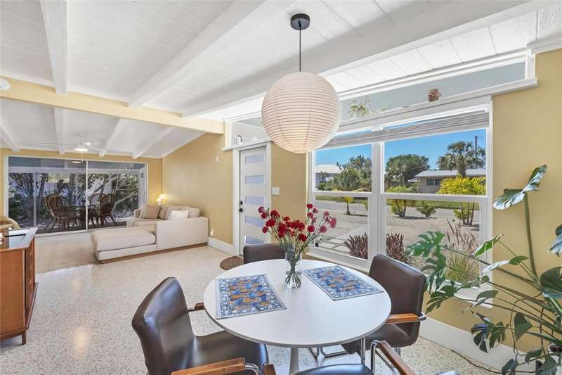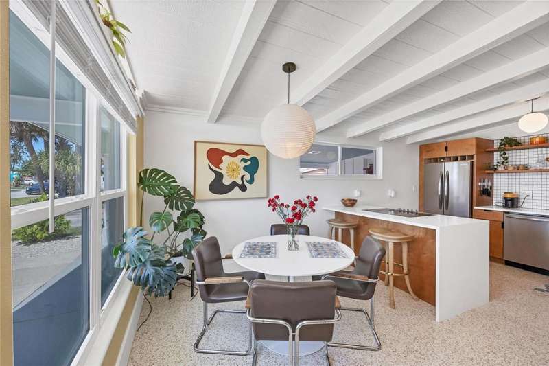 This mid-century gem enjoys nearby Sarasota Bay breezes. Welcome yourself to a tastefully updated & lovingly maintained 3-bedroom 2 full bath West Bradenton home that is sure to please. The sellers have a unique knack for embellishing on the characteristics of an era gone by, starting w/the refinished terrazzo floors & ending w/the beamed & vaulted ceilings above & everything in between. The kitchen was tastefully updated in 2023 w/quartz counters accompanied by a pretty tile backsplash, beautiful wood cabinets, large pantry, stainless appliances & those ever-popular pan drawers. An abundance of storage is found in the lazy Susan corner cabinet as well as the large island which is home to a smooth cooktop w/a warmer burner & plenty of room for bar stools. The dining area is light & bright w/a full wall impact window & is home to a charming hanging retro light. A spacious living room has sliders to an awesome screened lanai that leads outdoors to a well-manicured side & back yard. The rear walkways have been updated w/stone & concrete patios for year-round enjoyment leading to the beautiful backyard w/its lush green grass, a Meyer lemon fruit tree & tropical Christmas palms. Back inside the lucky new owners of this awesome home will enjoy a spacious primary bedroom w/a mini-split AC unit (for those of you who like to sleep w/a blanket) & impact sliding doors that lead to the backyard oasis. The primary bath has a thoughtfully designed d?cor w/spa tile floor & shower wall, step in shower, floating vanity, light up mirror & textured glass door that aligns beautifully with the period style motif. The guest bath enjoys the same mid-century-like genre w/a European style bowl & vanity w/a vessel sink, coordinating w/the original tub which is complimented by an updated shower head & glass. A covered carport is accessed via a large circular driveway for overflow parking & houses a spacious laundry & storage room. The outside front has been given the same attention to detail w/its tropical color palette, retro style textured glass front door, raised house numbers, all encompassed by the beautiful Florida fauna & decorative stone. Other notable features include a 2023 roof, updtd plumbing & electric panel, baseboards & door jambs, 6 panel interior entry doors, gutters, ceiling redone w/newer insulation & faux beams, lighted ceiling fans, dedicated storm plywood for bedroom windows & central AC. Bayshore Gardens enjoys a plethora of amenities including a junior Olympic pool, community clubhouse, baseball field, basketball court, playground, picnic tables, & kayak launch, most of which is included in the annual Recreation District Tax. In addition, there's a huge marina w/boat dock & dry storage for nominal fees compared to commercial spaces. Students enrolled in IMG Academy, SCF, Bayshore High or Elementary or Lee Middle Schools, are about 5-10 minutes away. Approx 10 minutes to SRQ Airport, Ringling Museum & Asolo Repertory Theater, 15 to 30 minutes to sugary sand beaches, UTC Mall, St. Armand's Circle, restaurants, houses of worship, theaters including live plays, boating, golfing, fishing, rowing & sports teams incldg springtime professional baseball, & polo matches. Come enjoy the ambiance of this wonderfully updated period style home before it is gone.