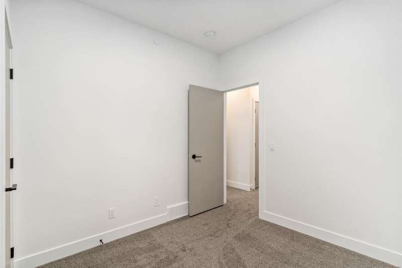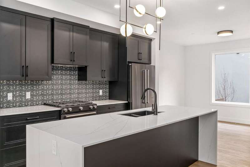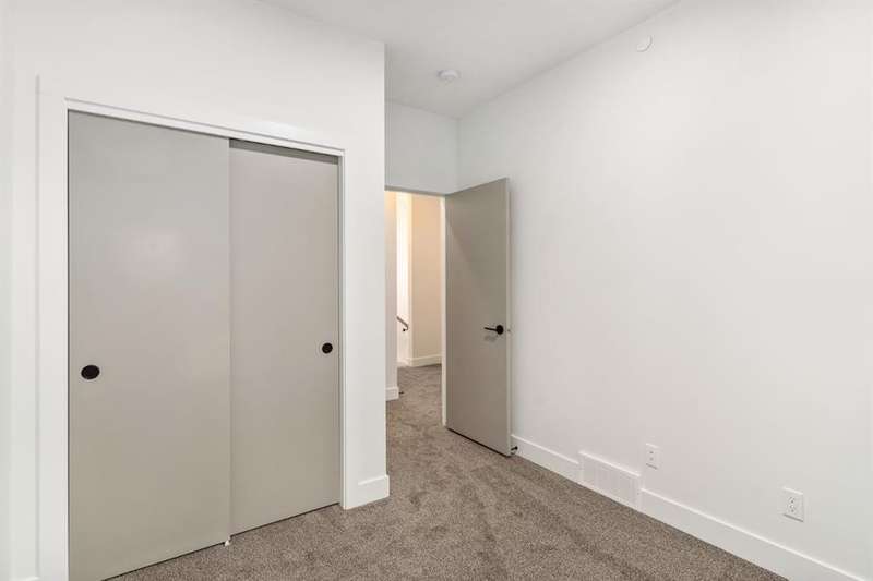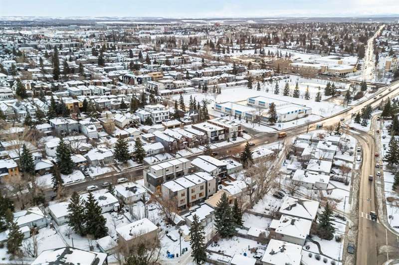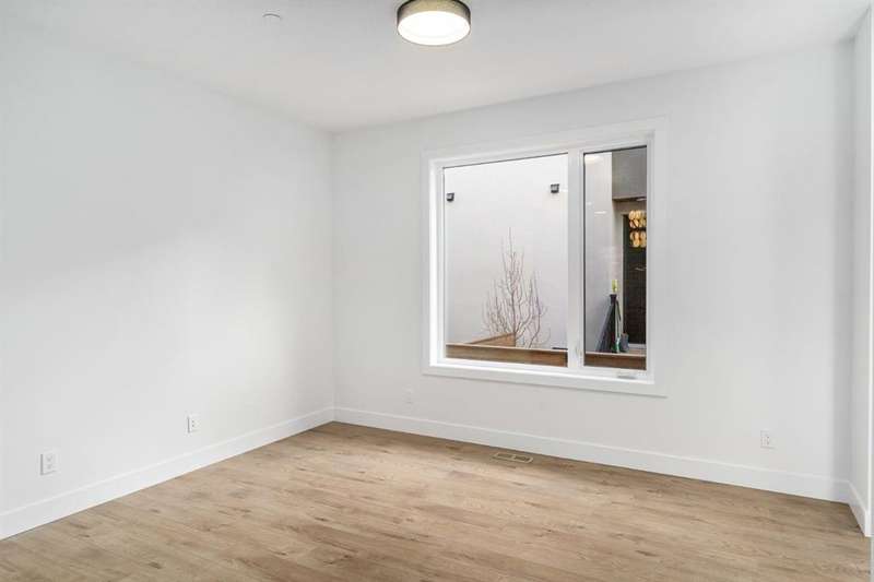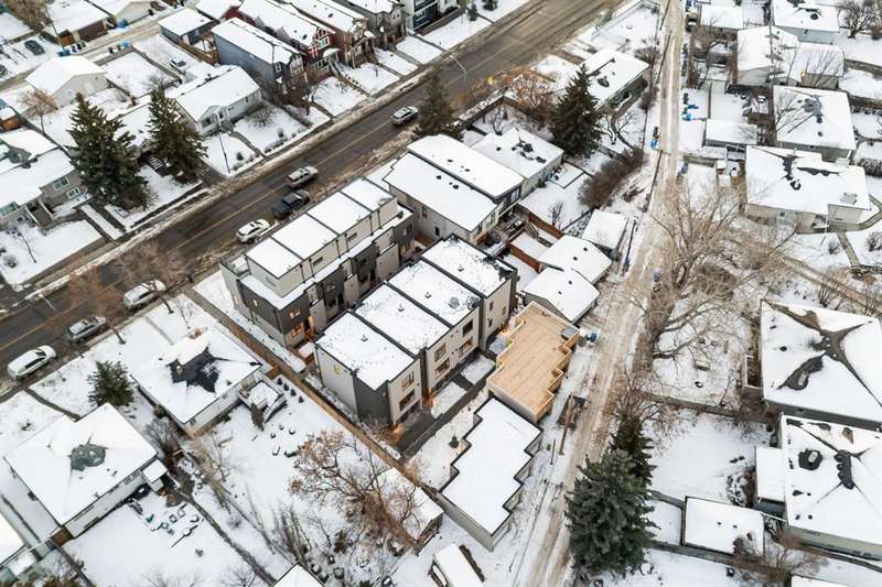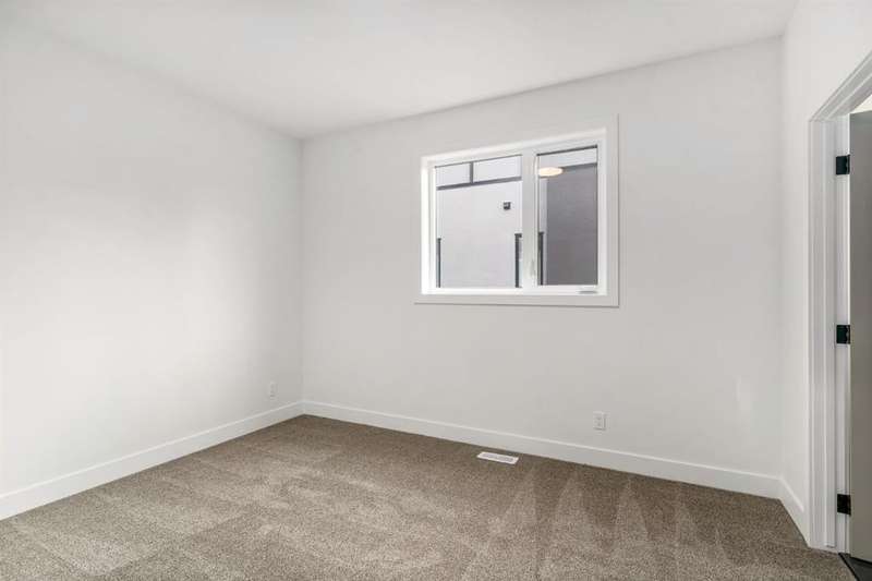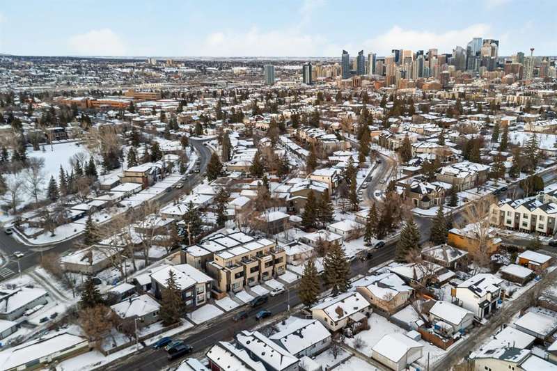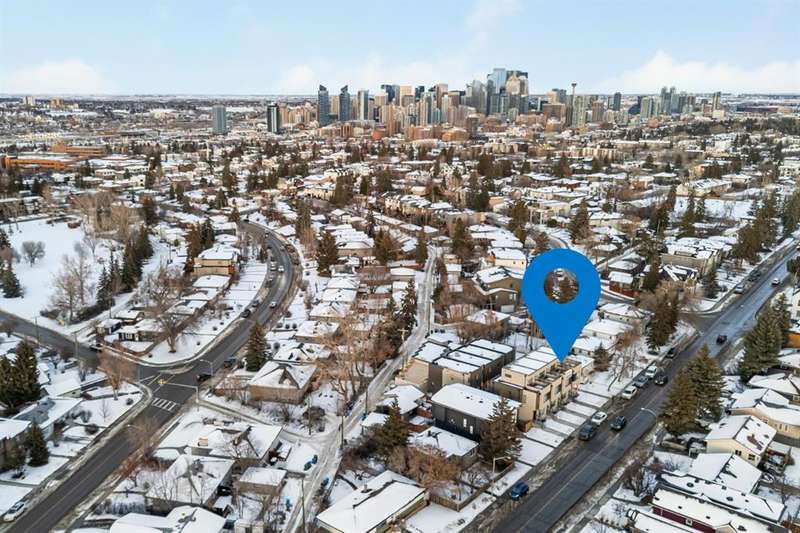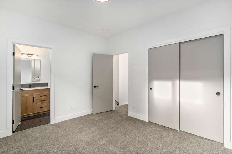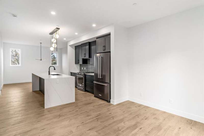 *Builder Incentive to cover all condo fees for first year* This modern townhouse embodies the ideal inner city lifestyle. Constructed by highly acclaimed builder Crystal Creek Homes, this meticulous residence is a testament to keen craftsmanship and spares no details. Luxury vinyl plank flooring, knockdown textured ceilings, and designer light fixtures are merely a few of the elements embedded throughout that truly elevate this home. Enter the impressive foyer and into expansive 9' ceilings, with huge south facing triple-glazed argon fill windows illuminating the living room and adjacent dining area. An open layout leads into the beautifully adorned kitchen, equipped with black stainless steel appliances, complementing black hardware, and geometric tiled backsplash. Quartz countertops, sleek dark cabinetry and a waterfall island with a Blanco Silgranit undermount sink seamlessly create the perfect environment for gastronomy enthusiasts looking to refine their technique, and host intimate gatherings with loved ones. A backyard outdoor amenity space is the opportune addition for summer evening BBQs or to simply enjoy a moment of fresh air. Tucked at the rear is the polished powder room with a highly efficient WaterSense toilet and undermount sink. Ascend the black metal spindled staircase with a durable shaker oak handrail and explore two palatial bedrooms, each with their own four piece ensuite bathrooms embellished with elegant quartz countertops, undermount sinks and wall tile detailing on the bathtub/shower surround all the way up to the ceiling. The primary bedroom includes a spacious walk-in-closet, the perfect accompaniment to the conveniently located stackable front load steam washer and dryer, injecting practicality and comfort into this luxurious offering. Escape to the third level loft, a thoughtfully curated ambience to unwind or entertain. With a unique multi-use area that can be easily converted into a family room, office, or bar/lounge, additional powder room, and exclusive rooftop patio that offers peeks of the mountains to the west. The undeveloped basement is as spacious as it is versatile, awaiting your personal customizations and individual flare to transform it from the existing sweeping storage space and executing your creative vision. Intricate upgrades include a High Efficiency Two-Stage furnace, Ecobee5 Smart Thermostat, active HRV system, as well as spray foaming of all cantilevers, rim joists and window openings for enhanced insulation. Enjoy all of the perks that come with an inner city townhome lifestyle, including the favourably located garage steps away from your front door, quick commuting times, along with the bonus of having exterior maintenance taken care of for you. Set against the vibrant amenities and attractions found within Marda Loop, this home provides a remarkable opportunity to pamper yourself daily, all while living in a desirable and energetic community centrally positioned with quick access the rest of the city.
