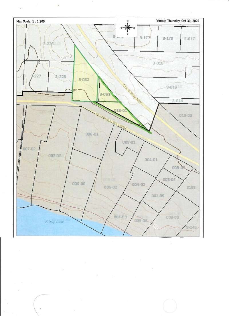 Build a four plex or two duplexes with water views of Kitsap Lake on these parcels. Three separate tax parcels are being sold together at the intersection of Chico Way & Northlake Way. 0.5 acres zoned Urban Low Residential (ULR 5-9 DU/ac) in Kitsap County. Perfect location for a four plex or two duplexes with additional space for a small private park. Vehicle access is from both roads easiest access to a lower garage area is from Northlake Way. Because of the contour elevations, build the living spaces above to take advantage of the wonderful views of Kitsap Lake to the south. Utilities stormwater, fiber (KPUD), water (City of Bremerton), & sewer (KC Public Works) are on the Northlake Way Road. Interior has been cleared for better viewing.