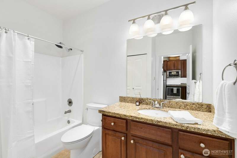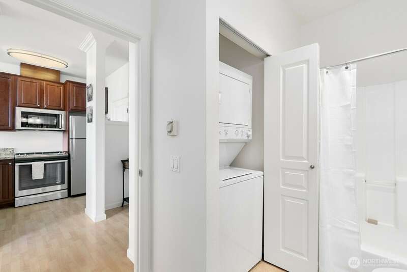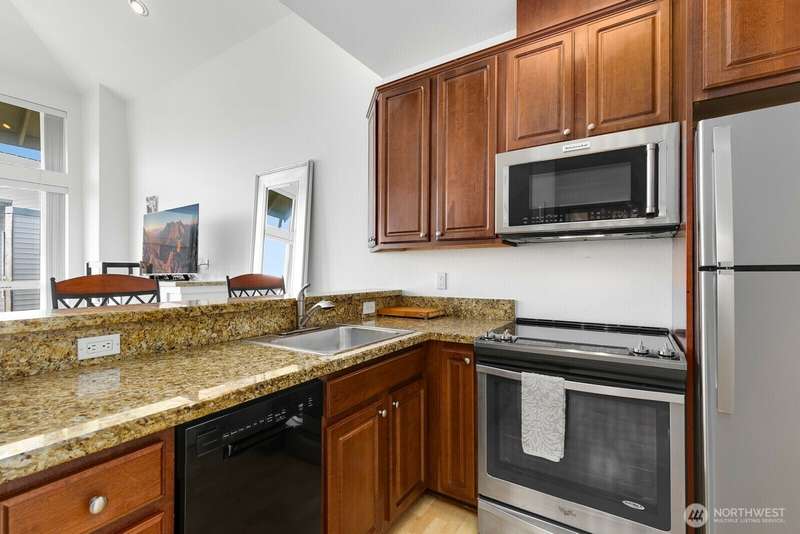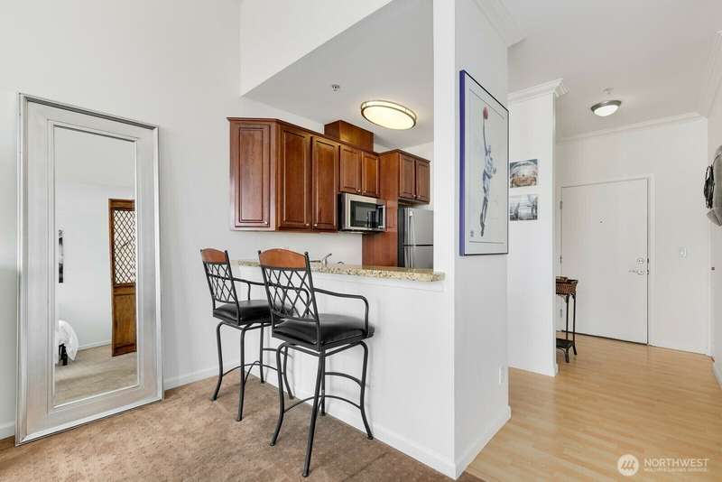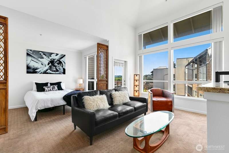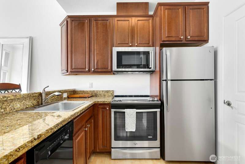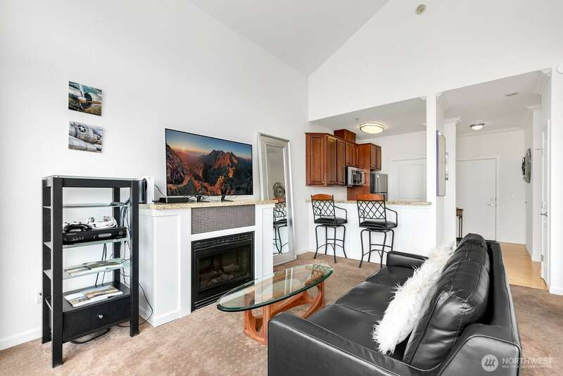 Bright and stylish condo in the heart of downtown Renton! This top floor studio unit lives large with a defined sleeping area, soaring ceilings, granite countertops, stainless steel appliances, in-unit washer/dryer, cozy fireplace, and a private balcony. Move in ready unit in well maintained building with fantastic amenities including secure garage parking, a fitness center, rooftop patio with grill, elevator, and inviting common spaces. Unbeatable location with a Walk Score of 97—just steps to dining, coffee, shops, transit, and more. Quick access to I-405, The Landing, Coulon Beach Park, Boeing, and SeaTac. No rental cap—great for investors or homeowners alike! Motivated Seller - bring your offers!