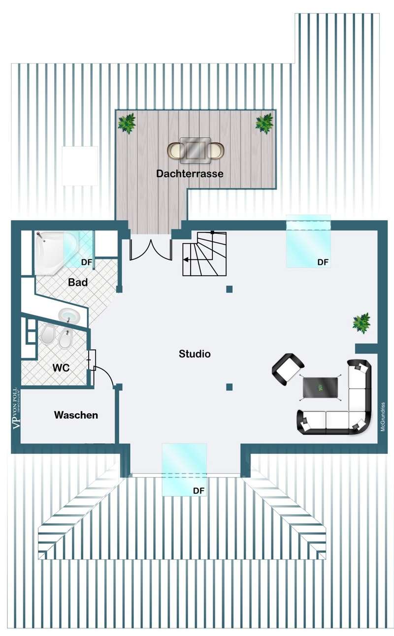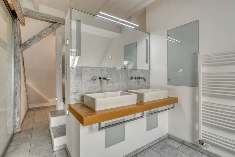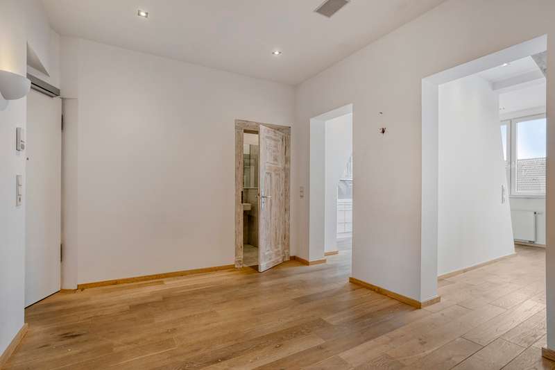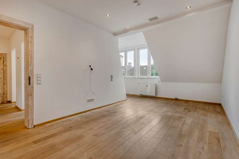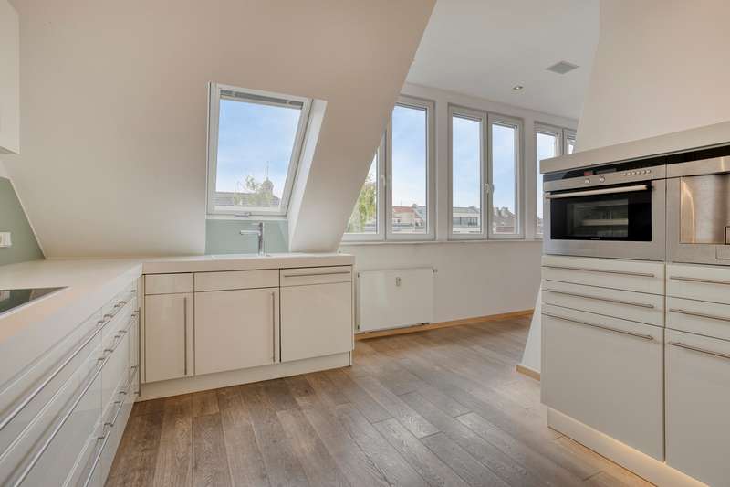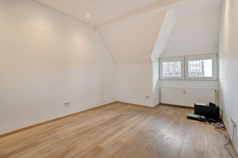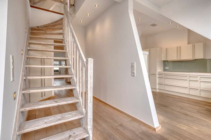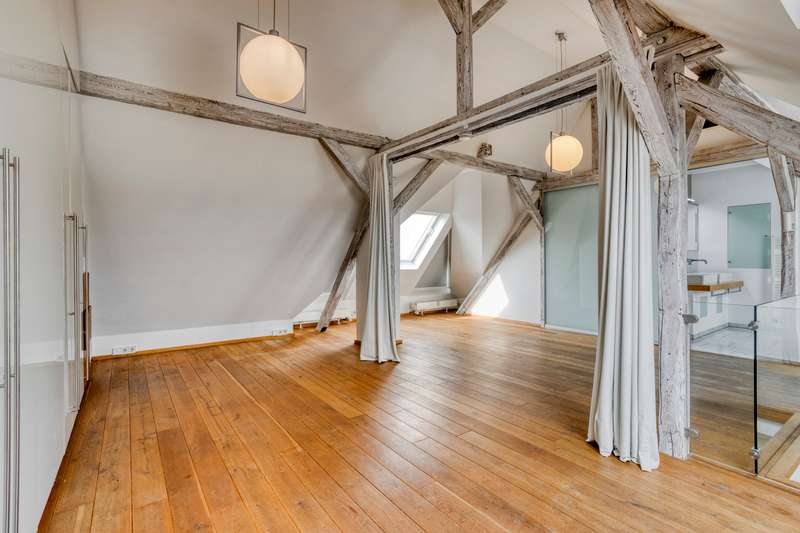 Directly opposite the state parliament with a view of the Rhine and television tower, you will find this individual and light-flooded maisonette apartment with approx. 133 m² of living space and a fantastic roof terrace, which offers you a fantastic view over the rooftops of Unterbilk. You can easily reach the apartment on the 4th floor of a well-kept old building from 1913 by elevator and are greeted by a spacious entrance hall, from which you reach the living/dining area, which consists of two connected rooms, a children's room or study, the kitchen and the shower room. The successful style of the apartment is already evident here: lots of light, high ceilings, a beautiful wooden floor and old, refurbished wooden frames and doors are just a few examples. A Bose sound system provides excellent acoustics in all rooms if required. If desired, the living and dining areas can be easily separated again to create an additional room. A modern and timeless fitted kitchen awaits you in the kitchen. Adjacent to this, an open wooden staircase leads to the top floor, where the spacious sleeping area with en suite bathroom and access to the roof terrace at the rear is located. Custom-made built-in units provide plenty of storage space and a large skylight offers a view of the state parliament, the Rhine and the Rhine promenade. The room height up to the gable and the open beams of the roof truss give this area a very special touch. The daylight bathroom on this floor also has a small, separate area with a washing machine connection. The apartment was extensively modernized a few years ago and is now in a very well-kept condition. Come and view this fantastic property in a prime Düsseldorf location for yourself!