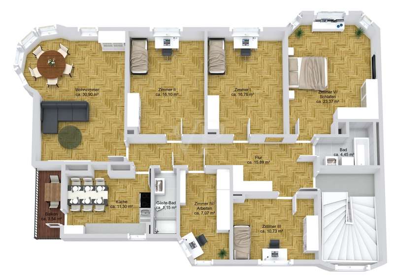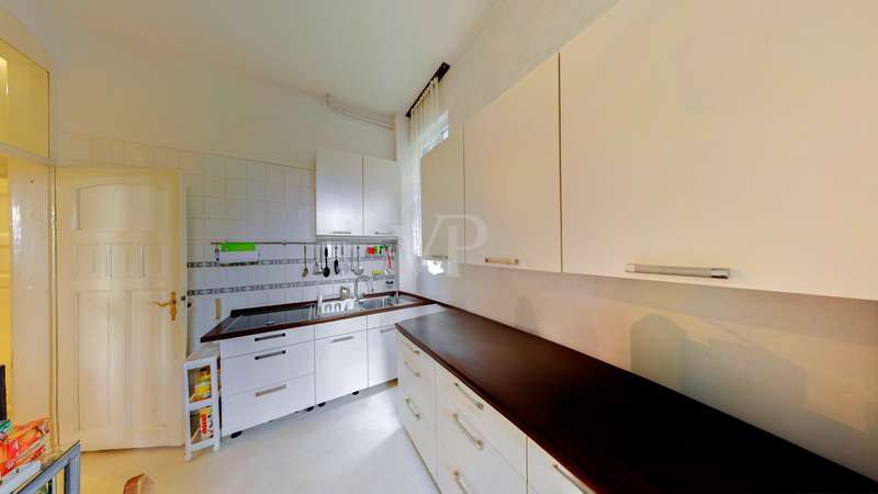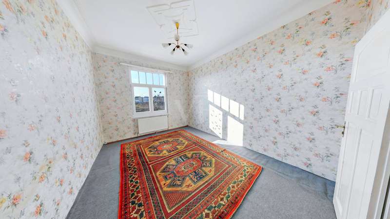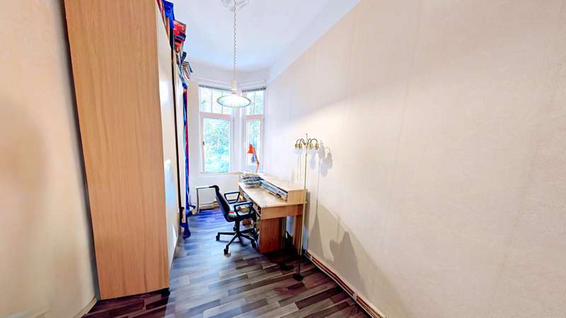 You can access the 360° tour here: https://von-poll.com/tour/fuerth/Wv06 This impressive apartment is located in a listed, historic residential building dating back to 1912 and extends over the entire second floor. The cozy kitchen-cum-living-room (with a fitted kitchen for a fee), six bedrooms and two bathrooms open up a wide range of possible uses - ideal for both families and flat-sharing communities. In addition, a balcony off the kitchen offers space for relaxing hours outdoors. A particular highlight is the stylish round bay window, which not only floods the living area with plenty of natural light, but is also a visual gem. A long hallway typical of an old building and the impressive ceiling heights of approx. 3.20 m create a spacious feeling of living. Original details such as the largely preserved herringbone parquet flooring (partially concealed under the current flooring), artistically crafted stucco on the ceilings and the original room doors underline the prestigious character of this gem of an old building. Two adjoining cellar rooms provide ample storage space. Parking spaces can be rented in the parking garage next door. Further information: - Size WEG: 5 - Monthly house rent: approx. 160,- € - Reserves as of 31.12.2023: approx. 9.500,- € - Adopted special contribution(s): none