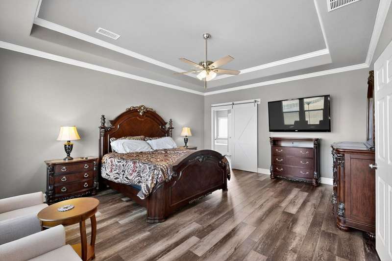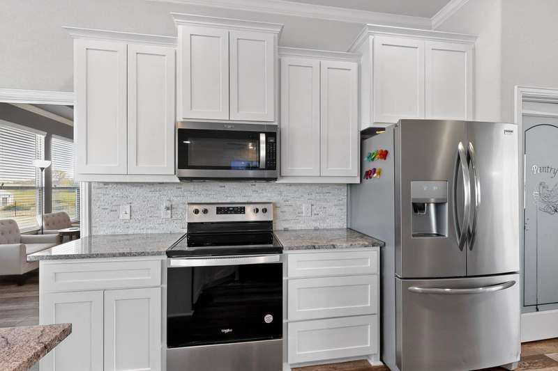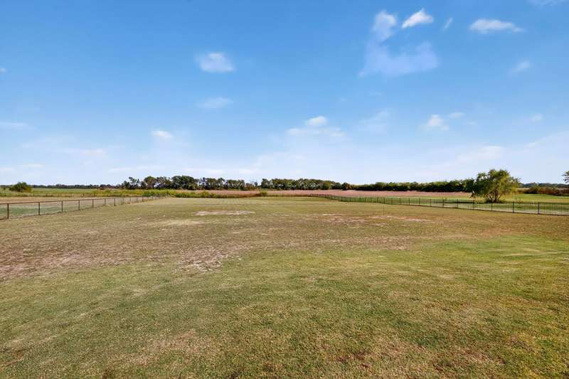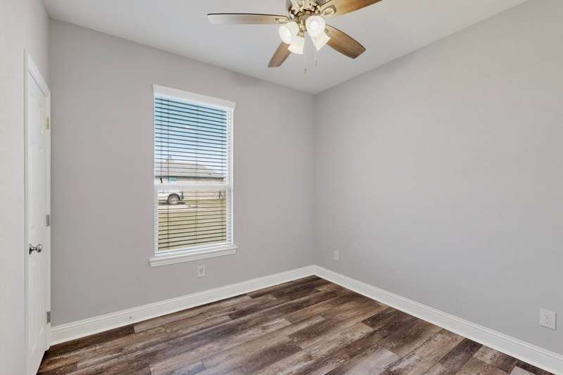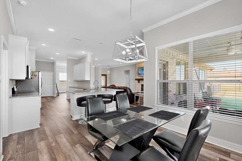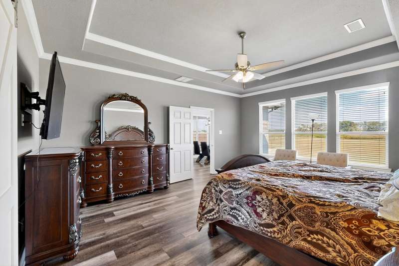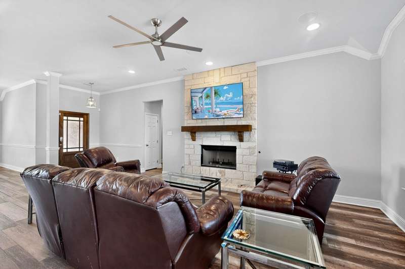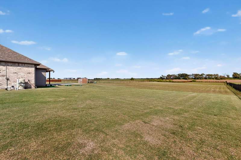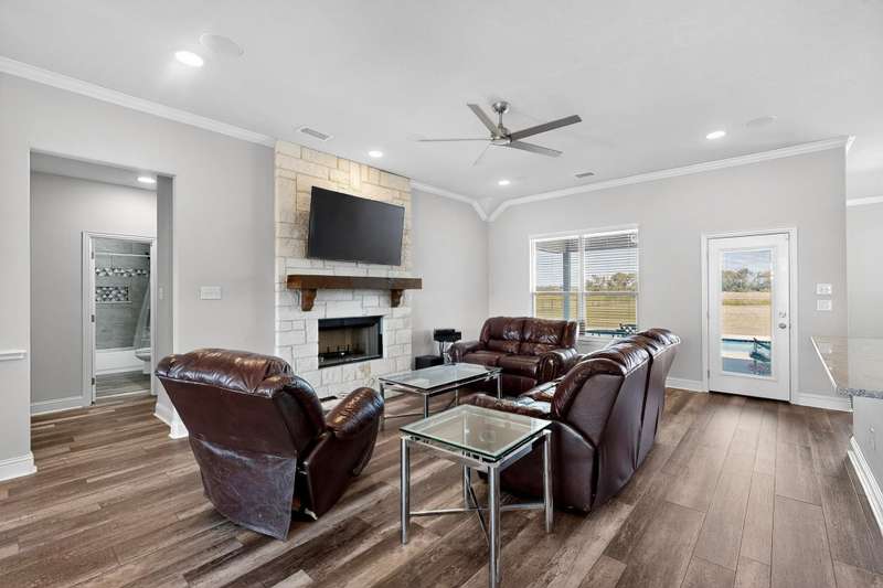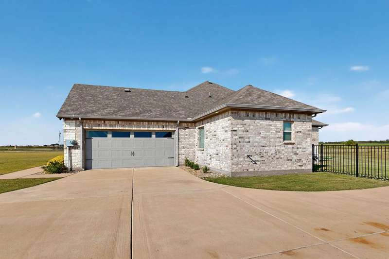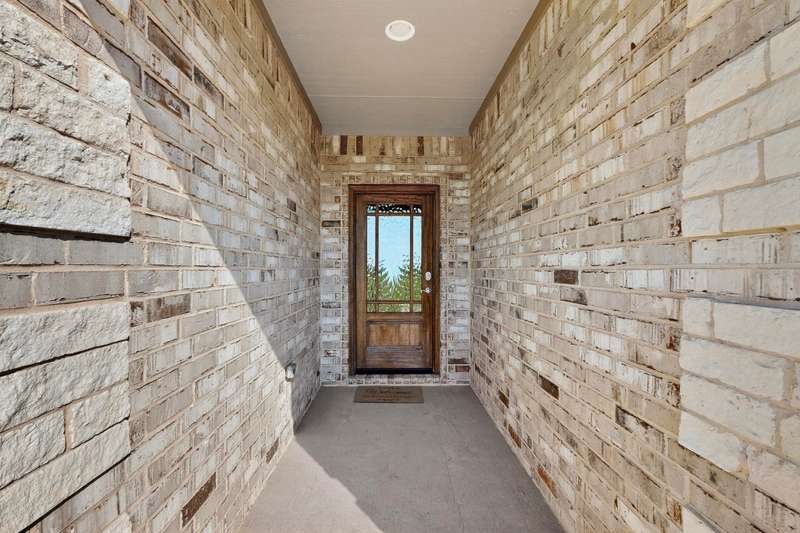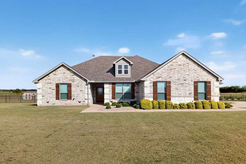 Welcome to a stunning 4-bedroom, 2-bathroom home built in 2021, nestled on 1.890 acres of serene Texas land. From the moment you arrive, the expansive driveway and wrought iron fencing set the tone for elegance and privacy. The light brick exterior is beautifully accented by rich mahogany shutters and a matching front door, offering exceptional curb appeal. Step inside to a light grey interior palette complemented by dark wood plank-style tile flooring. The open-concept living space flows effortlessly into a chefs kitchen featuring granite countertops, shaker cabinetry, and a stone backsplash that adds texture and warmth. Retreat to the luxurious master suite with an inset ceiling and private sitting area. A sliding barn door reveals a spa-like ensuite with dual vanities, spacious cabinetry, a soaking tub, and a walk-in shower designed for relaxation. Updated bathrooms showcase contrasting tilework, modern lighting, and refined finishes throughout. And when its time to unwind, step into your backyard oasis complete with wide-open skies, lush acreage, and a brand-new pool perfect for entertaining or peaceful solitude.