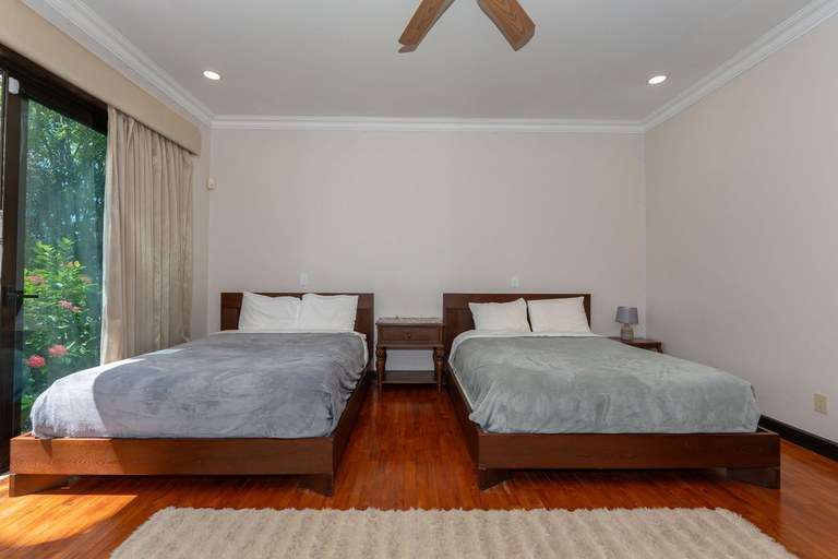 The first wing houses the master bedroom with a luxurious ensuite bathroom, an office, two additional large bedrooms with en suite baths, a salita/TV room, and a side outdoor patio. Across the enclosed walkway, the second wing offers a charming bedroom with a twin bed and an additional twin trundle bed, the kitchen, laundry room, 2-car garage, and the living room with high ceilings and giant windows. In addition to the main house, there is a spacious casita with an ensuite bathroom and a beautiful large balcony with furniture to enjoy the views of the surrounding area.
