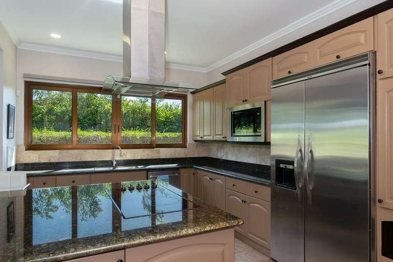 In the open-concept great room, large windows blur the boundaries between indoor and outdoor spaces, flooding the house with natural light. The fully equipped kitchen boasts high- end appliances and an expansive island, perfect for preparing gourmet meals. The thoughtful layout includes two wings, connected by a large, enclosed foyer with expansive windows, a half bath, access to the backyard, and a full view of the gardens and pool.