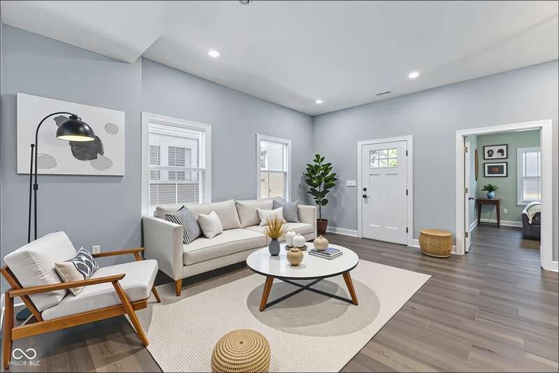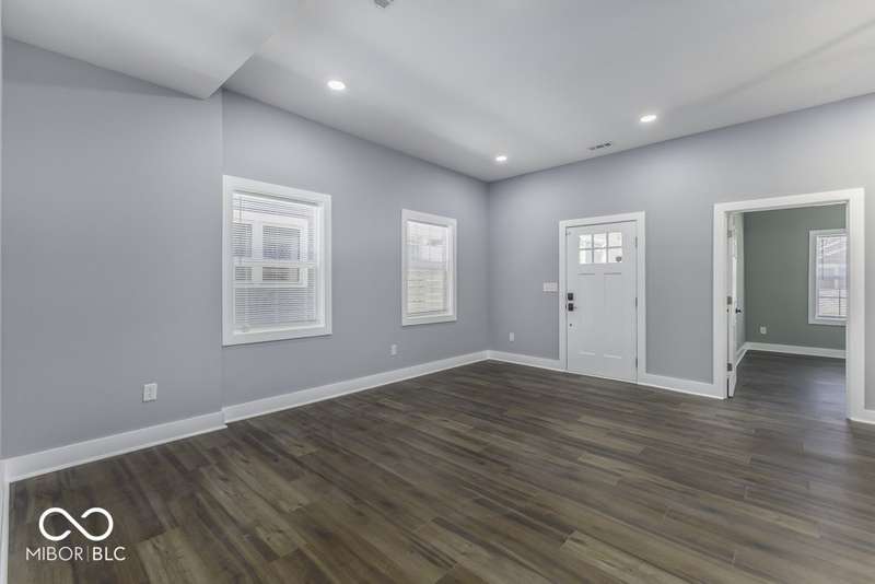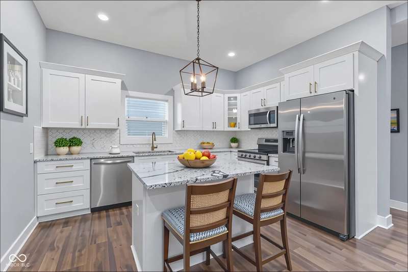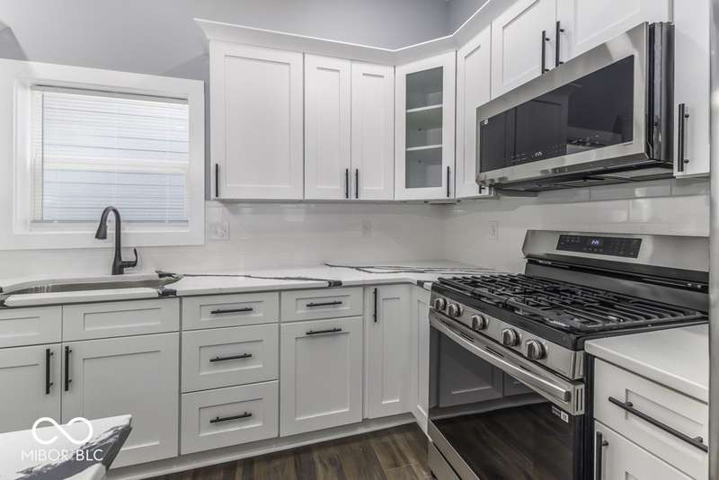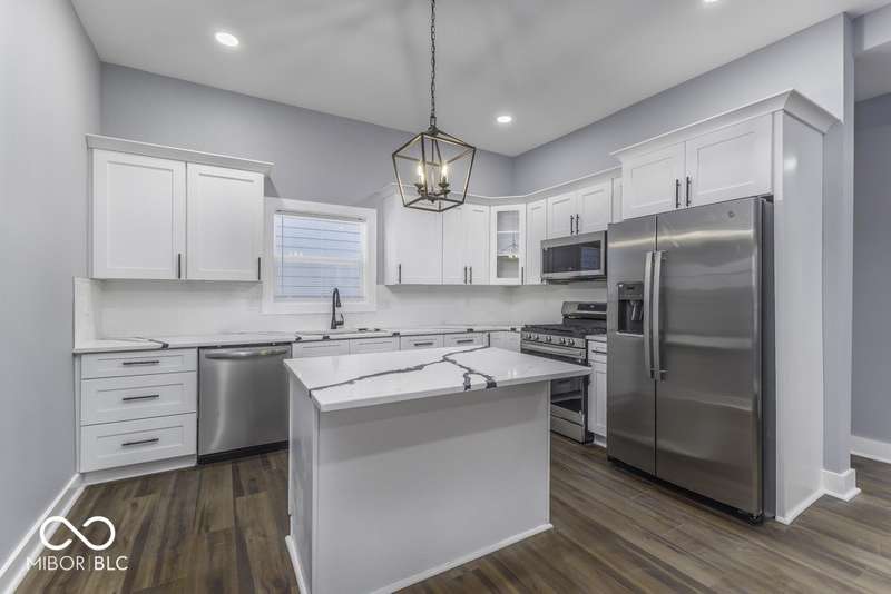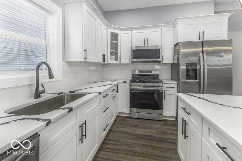 Don't miss this opportunity at a totally updated bungalow in Bates-Hendricks. New from the studs out and includes vinyl plank flooring throughout. Features a bright kitchen with a center island. hard surface counters and stainless appliances. The kitchen is open to the large living room making this ideal for entertaining. The third bedroom is located in the front of the home and would make an ideal office if needed. The primary bath includes double sinks and a large shower stall. There is also a partial cellar for storage, a large one car detached garage and a privacy fenced backyard.