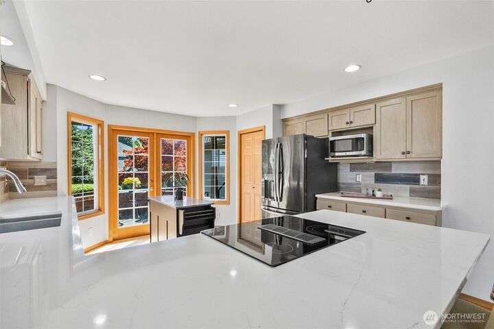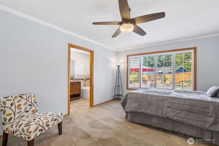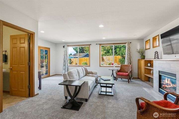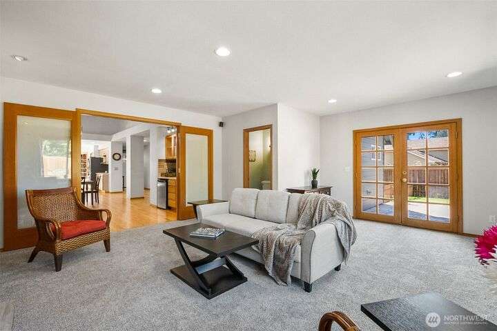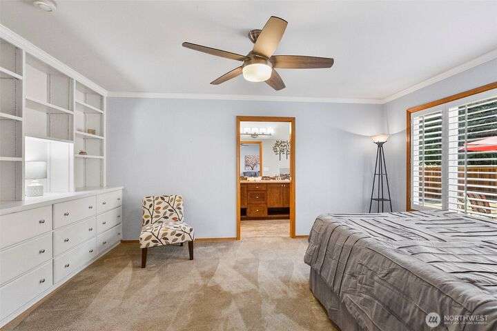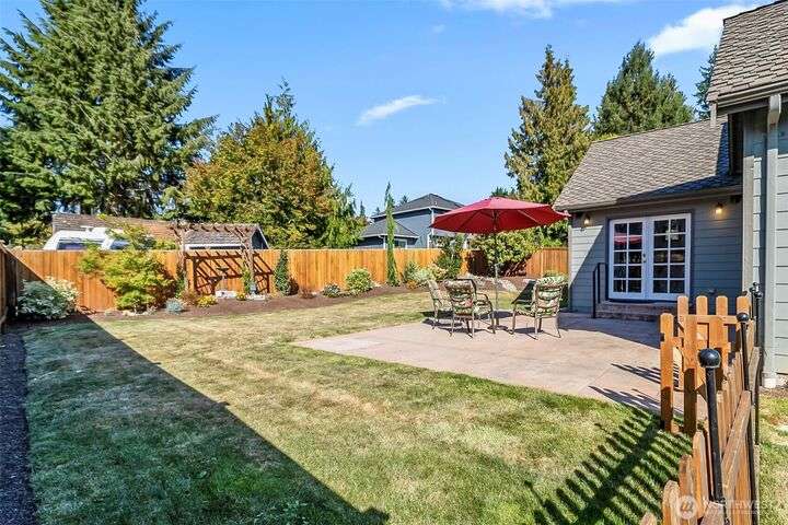 Outstanding Community of Gold Creek. Rambler with bonus room & office on upper level. 3 bedrooms & 2.5 bathrooms. Updated kitchen w/quartz countertops, full backsplash, pantry & French doors to front patio. Great room/dining space w/vaulted ceiling, hardwood floors, wet bar w/quartz counter, glass faced cabinets & beverage fridge. Large family rm w/French doors, built-in cabinets, gas fireplace, 2nd set of French doors to beautiful yard w/entertainment patio. Primary suite w/built-in cabinet, walk-in closet, gorgeously updated 5-piece bath w/quartz counters, soaking tub & luxurious shower. Bonus rm w/skylights & attic storage. AC, RV parking & sprinkler system. Parks, tennis courts & walking trails. Excellent schools!