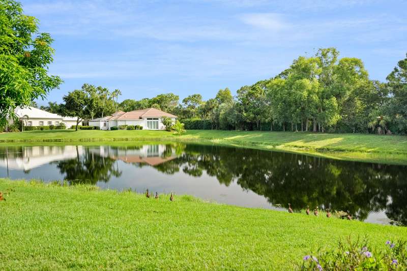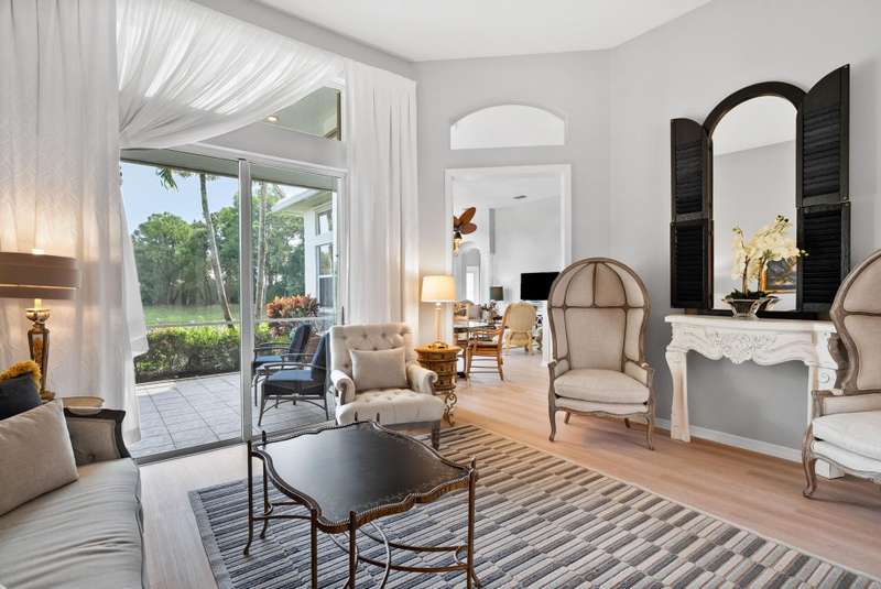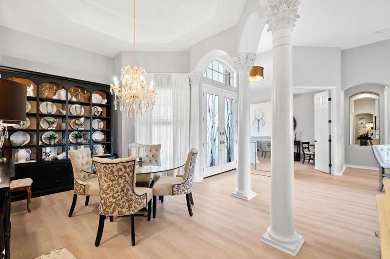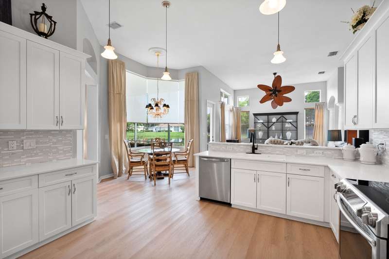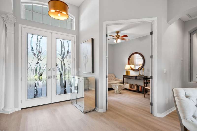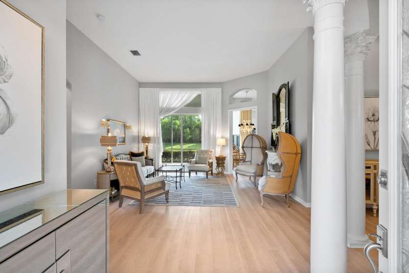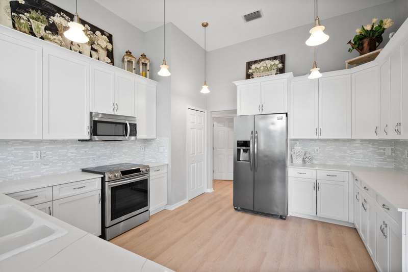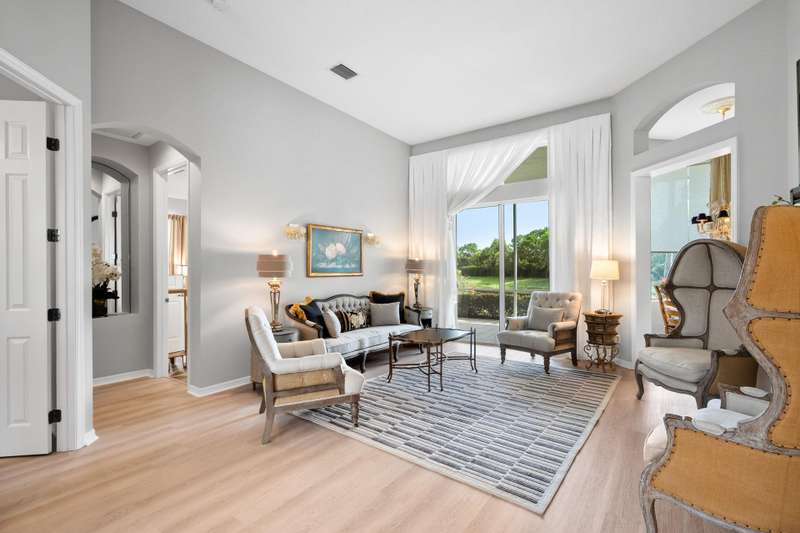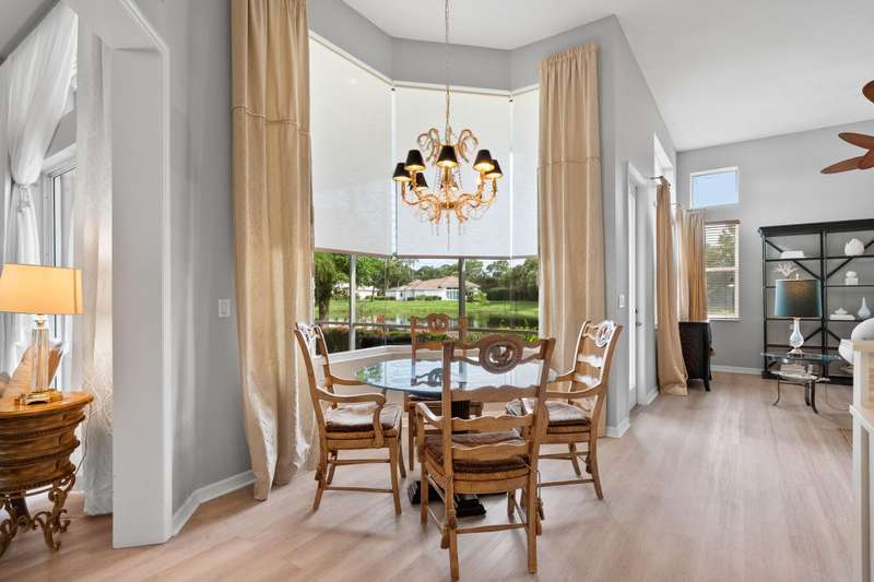 Elegance with modern renovations in this captivating floor Plan. Featuring light, neutral vinyl floors, soaring 12 ceilings in the main living areas, and 10 ceilings throughout the rest of the home, this residence is filled with natural light from abundant windows. Updated kitchen showcases white quartz countertops and stainless steel appliances. Floor plan includes a formal dining room, living room, and family room, plus 4 bedrooms and 3.5 baths. One bedroom is an en suite ideal for a nanny or in-law quarters, while another bath serves as a cabana. Enjoy tranquil lakefront views, beautiful mature landscaping, a 2021 roof, and complete hurricane panels. Community amenities include a clubhouse, pool, tennis, fitness center, and optional golf club with cafe and dining. Membership Optional