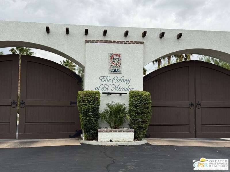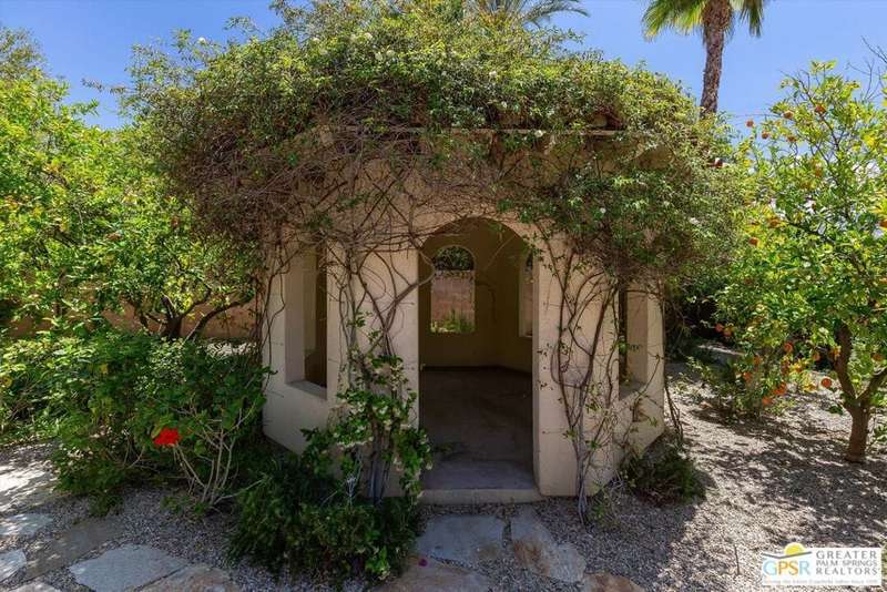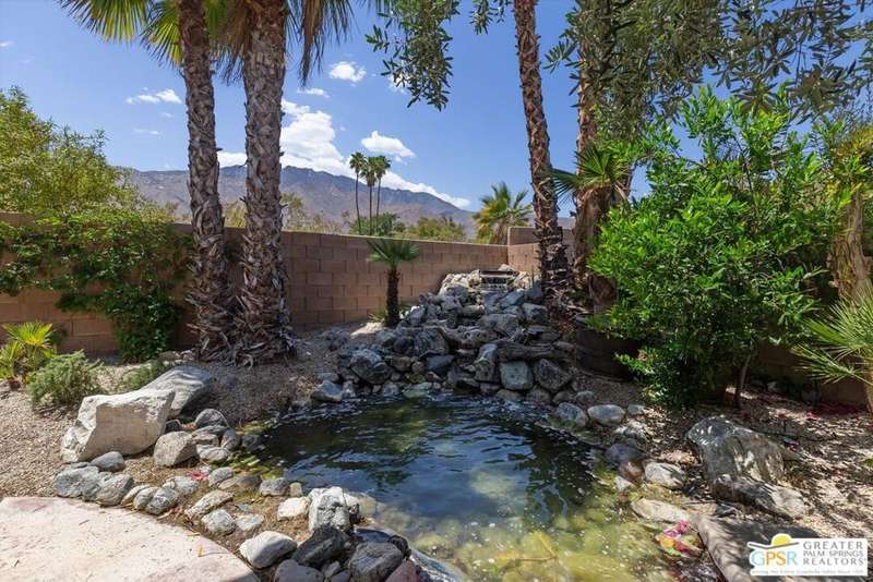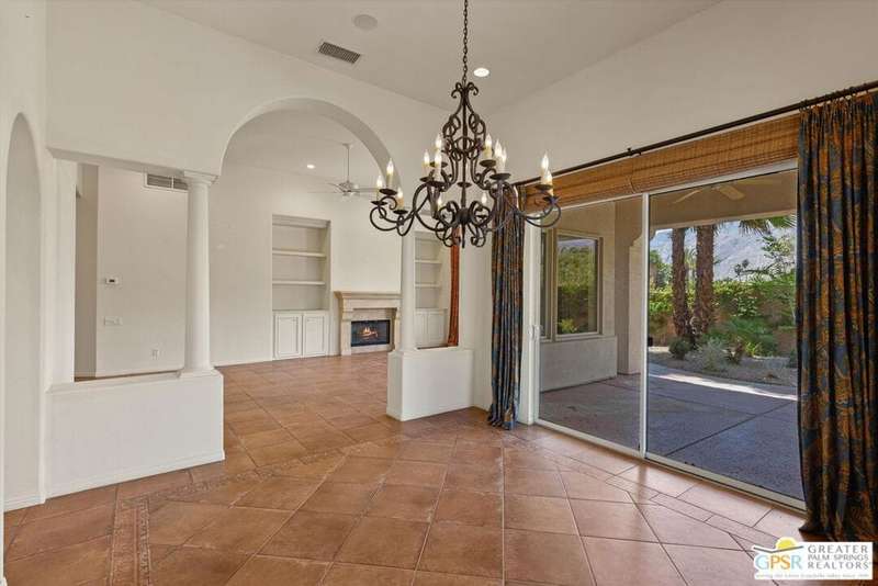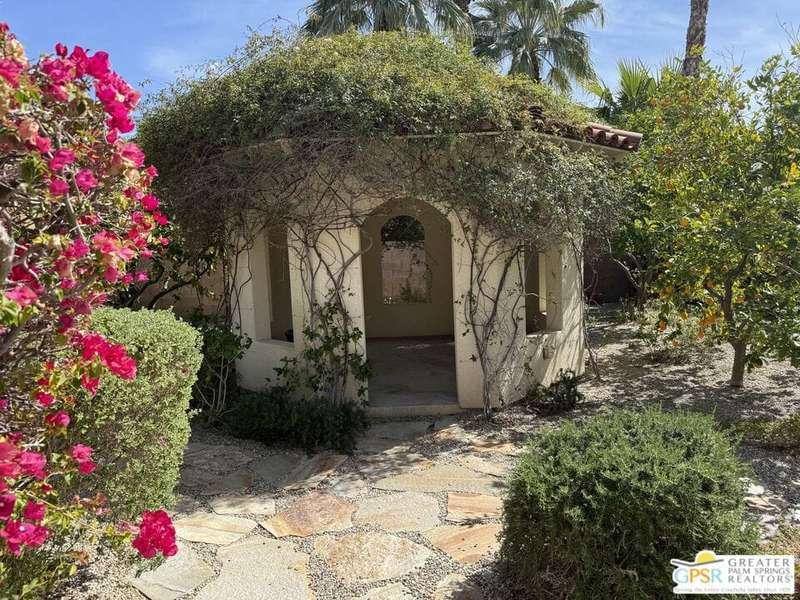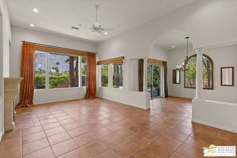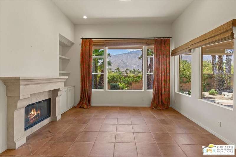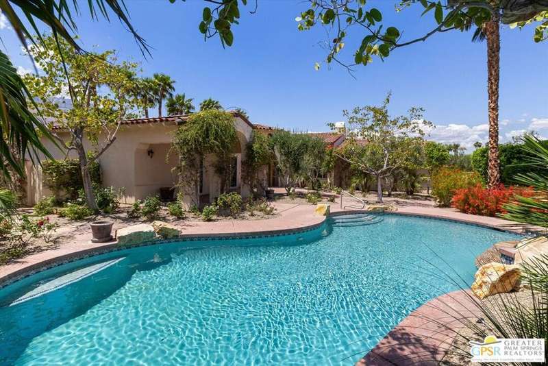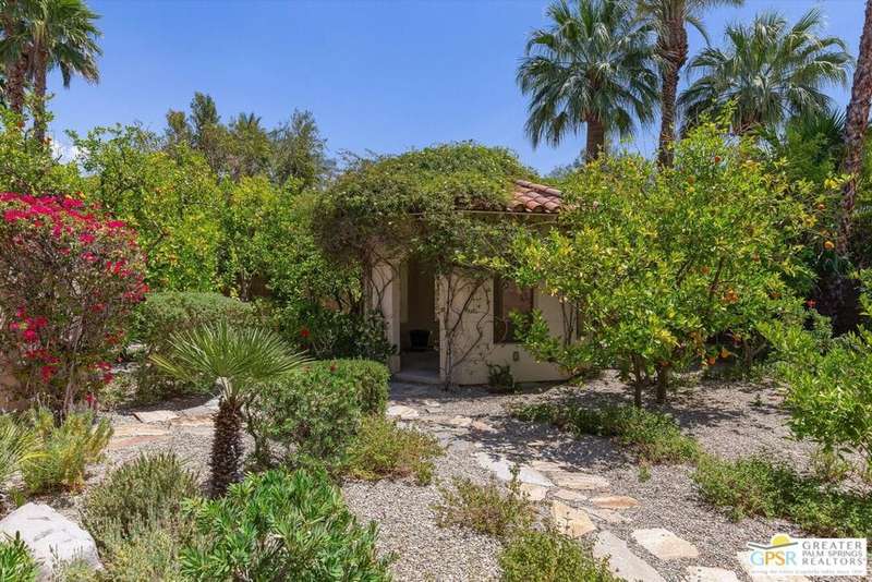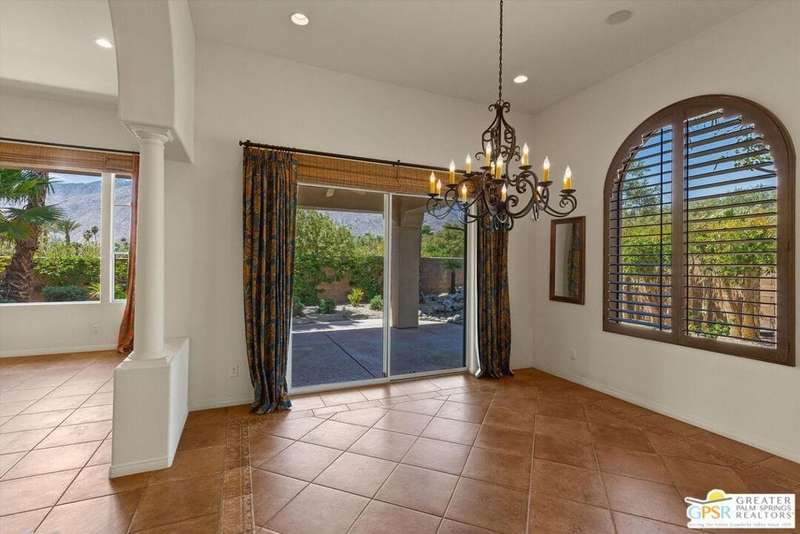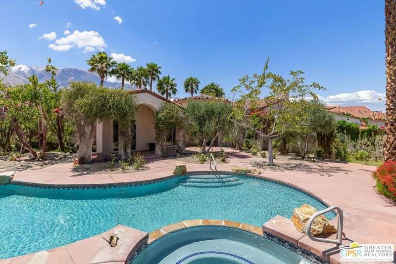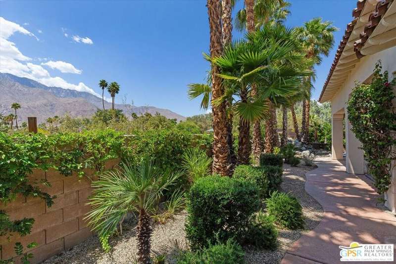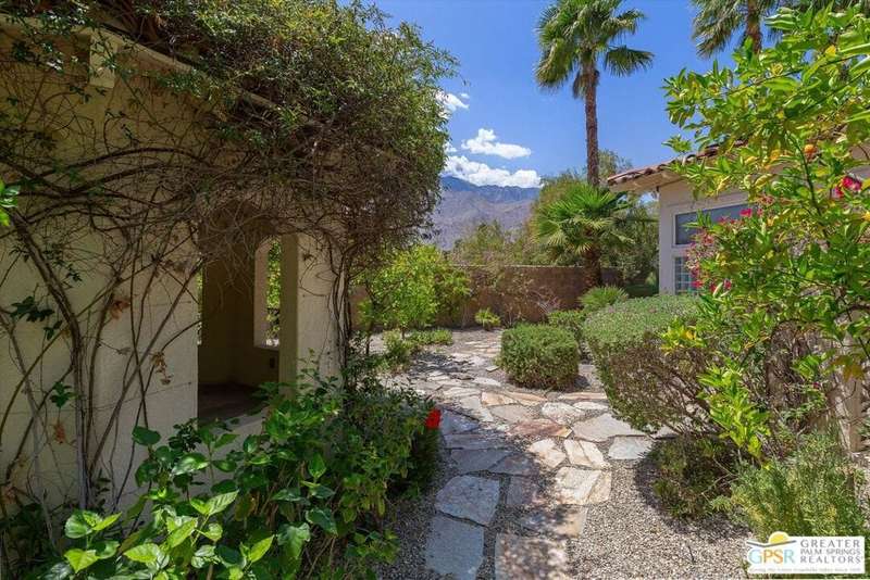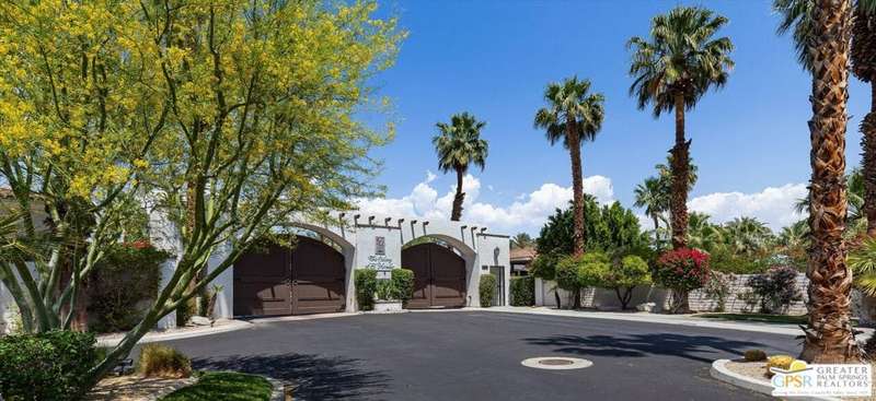 Nestled securely within the prestigious gates of an exclusive enclave, discover this grand Spanish Mediterranean retreat equipped with OWNED SOLAR and offers immediate occupancy in time for season! One of only 35 distinguished residences, the property offers unparalleled privacy amidst lushly hedged landscapes, Zen-like grounds. Imagine strolling along serene walking paths, pausing by a charming gazebo and tranquil pond with a cascading waterfall, all while surrounded by fruit-filled citrus trees and breathtaking, postcard-perfect mountain vistas. Step through the impressive entry rotunda into the spacious 24x15 living room, where soaring 13' ceilings and a striking fireplace create an inviting ambiance with bold mountain views. The living room flows seamlessly into the adjacent 14x13 formal dining room, perfect for elegant gatherings. A separate family/media room, complete with a cozy fireplace, provides an ideal space for friends and family to celebrate the quintessential Palm Springs lifestyle. The truly grand chef's kitchen boasts top-of-the-line Viking Professional appliances, abundant prep spaces, a large center island with extensive storage cabinets and display shelves. Retreat to the pampering primary suite, featuring a generous walk-in closet, built-in linen storage, dual vanities, and a separate tub and shower with mountain views. An adjacent home office or exercise/yoga area offers added convenience. Two additional well separated bedrooms, with their own entry hall and ensuite baths, showcase stunning western mountain views. A full-sized laundry room with extra storage and additional refrigeration provides practicality, leading to the oversized three-car attached garage. Outside, the sparkling pool and spa create the ultimate private resort-like oasis for relaxation. Personalize this hidden gem with your own cosmetic touches and embrace the exceptional private Palm Springs vibe. YES, with an owned energy-saving solar system with car charger and low HOA fees, this retreat is truly a very special find. Personalize the cosmetics to your liking, as there's no need to buy unwanted seller upgrades only to reverse them to your preferences.