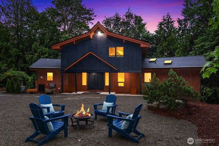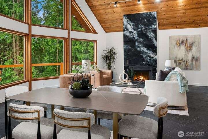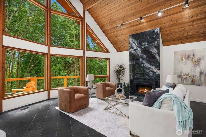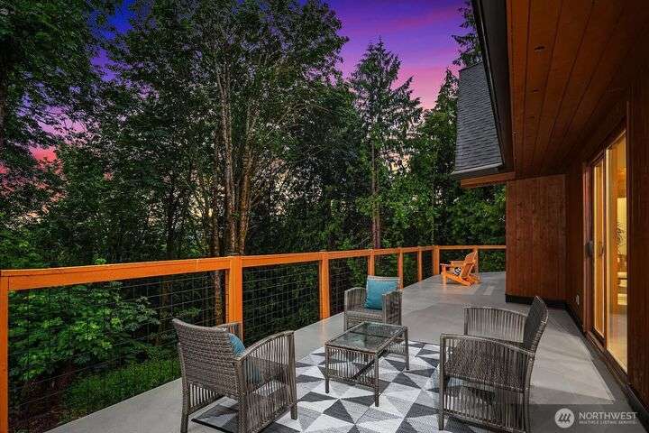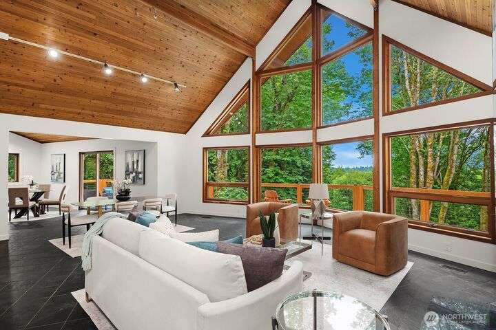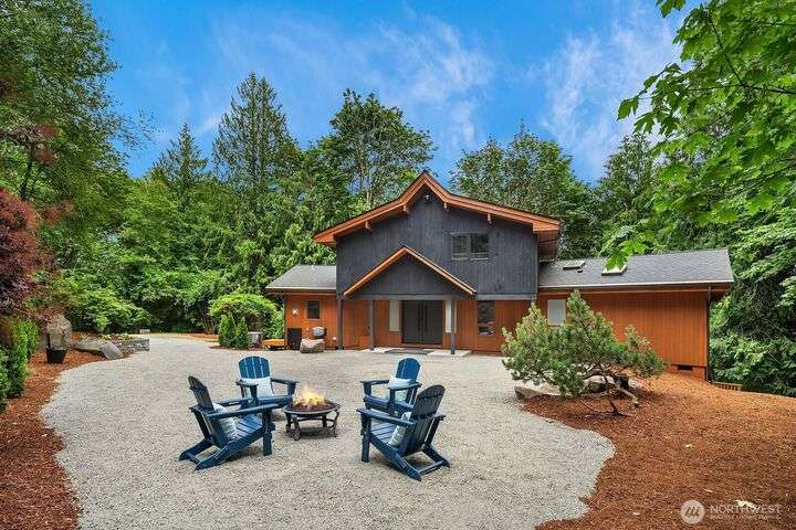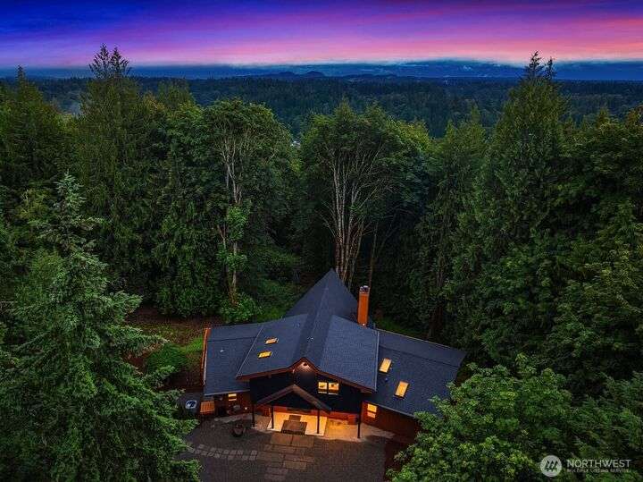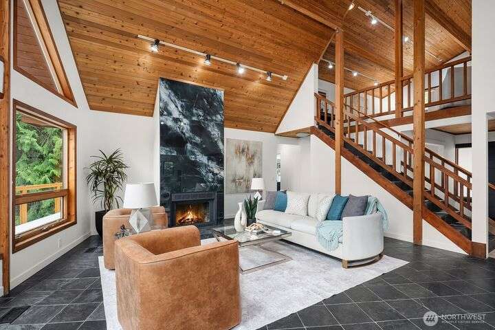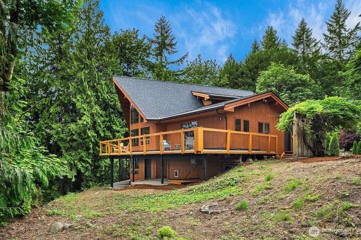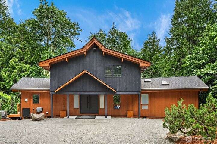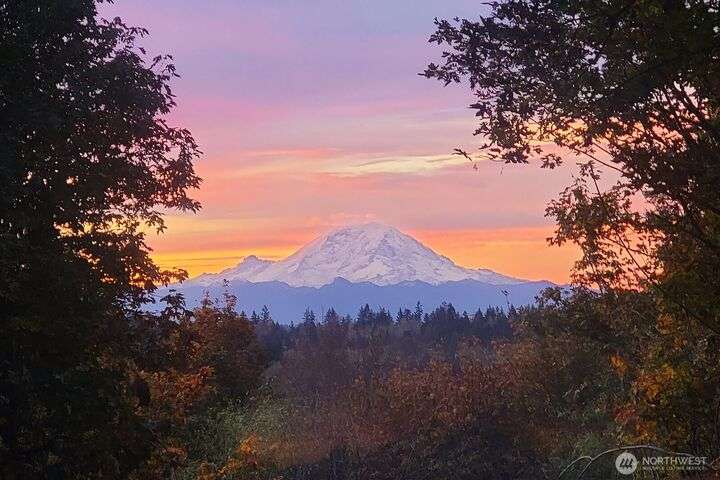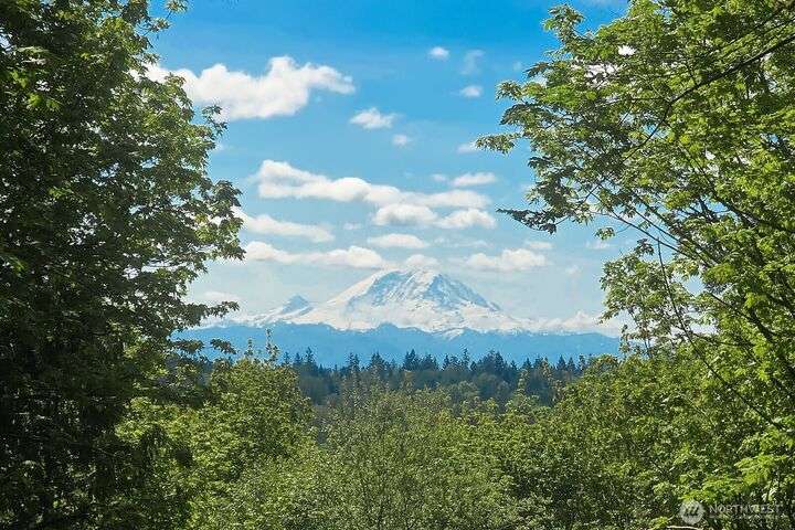 Nestled behind a private gate on nearly 5 acres, this one-of-a-kind retreat blends elegance, privacy, & a picturesque view of Mt. Rainier. With over 3,200SF of thoughtfully laid out living space, every detail is elevated; soaring wood lined ceilings, rich hardwoods, enormous wraparound deck, a chef’s kitchen, waterfall island & premium appliances. The sun-drenched great room centers around a stunning fireplace & panoramic windows that captures the mountain in perfect stillness. Upstairs, the spa-like primary suite offers a luxe bath, walk-in closet & unforgettable vistas. Downstairs includes a second living space & versatile bonus room. Beautifully landscaped, parking & near I405.