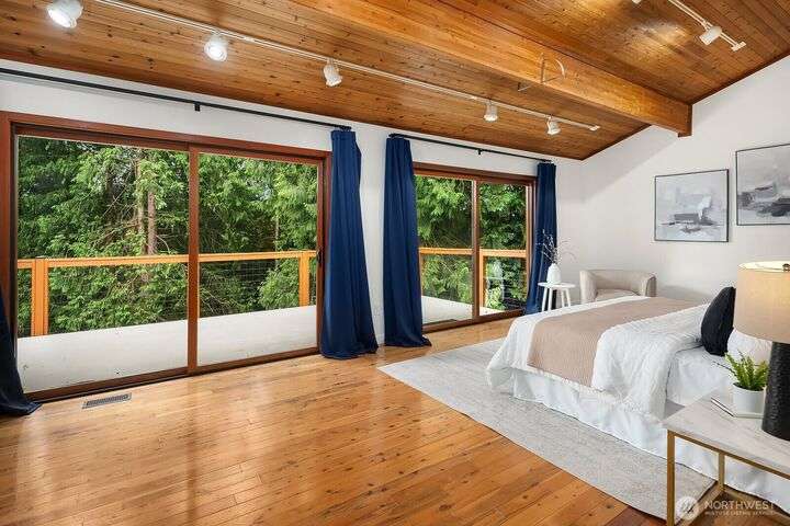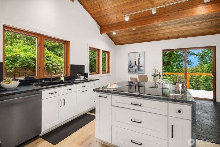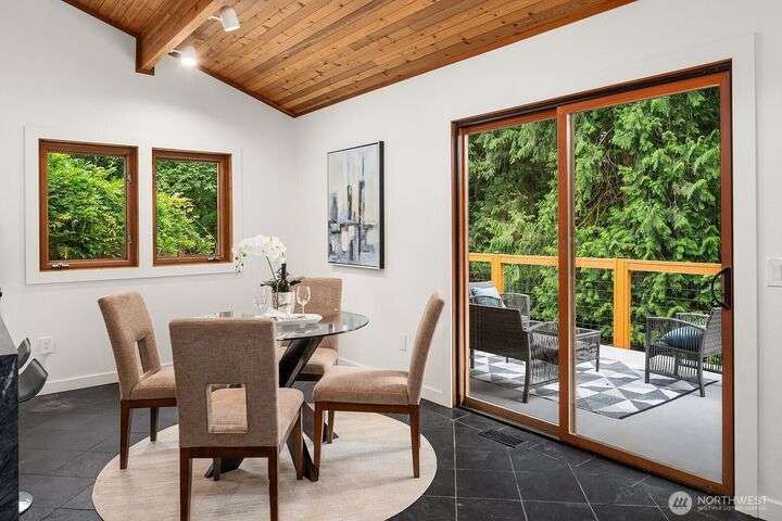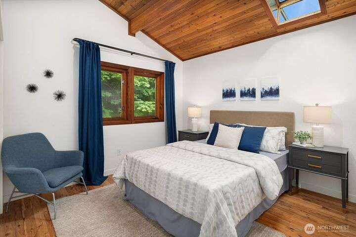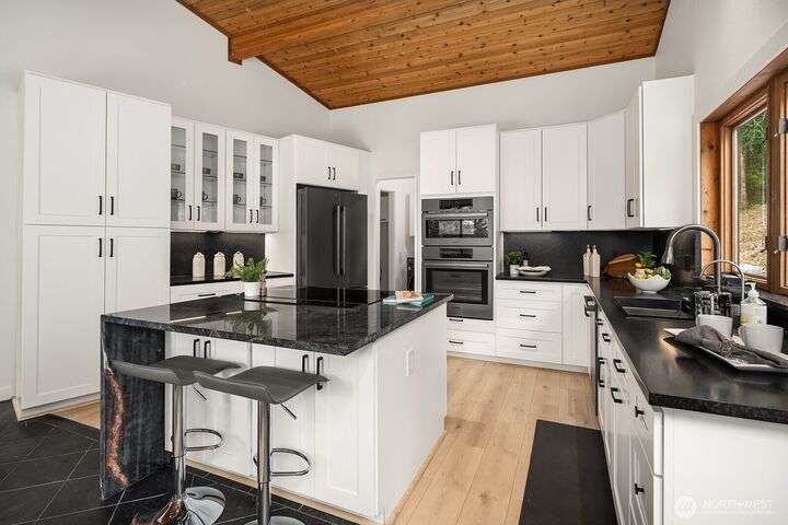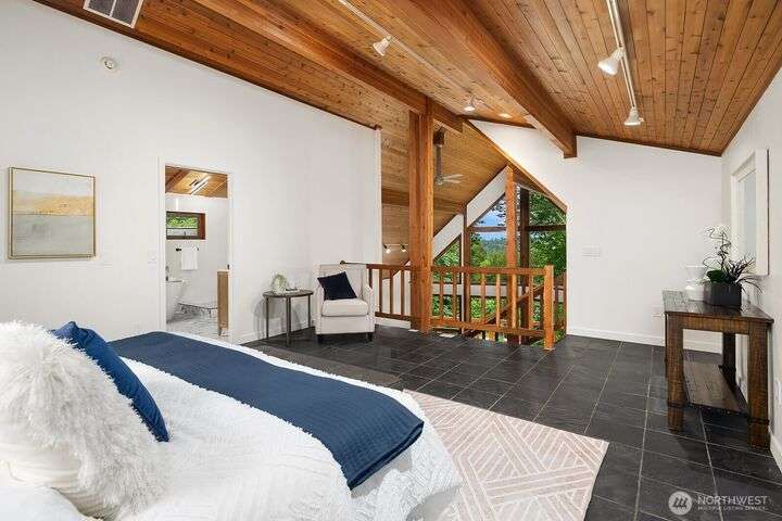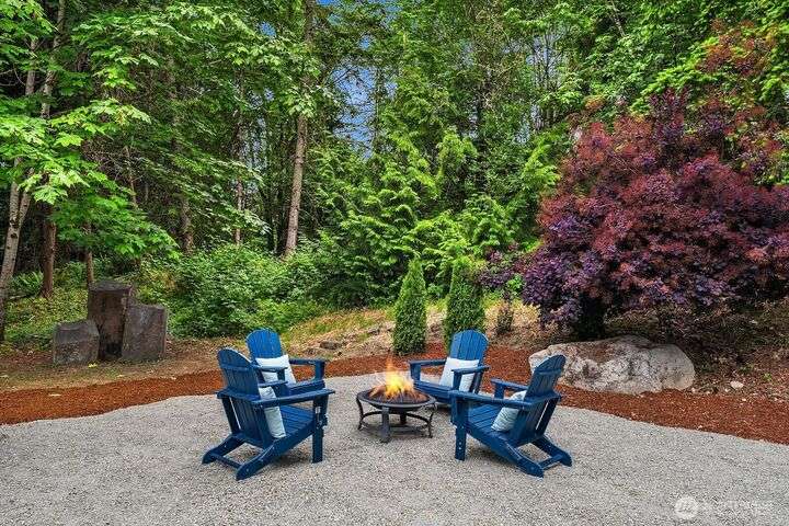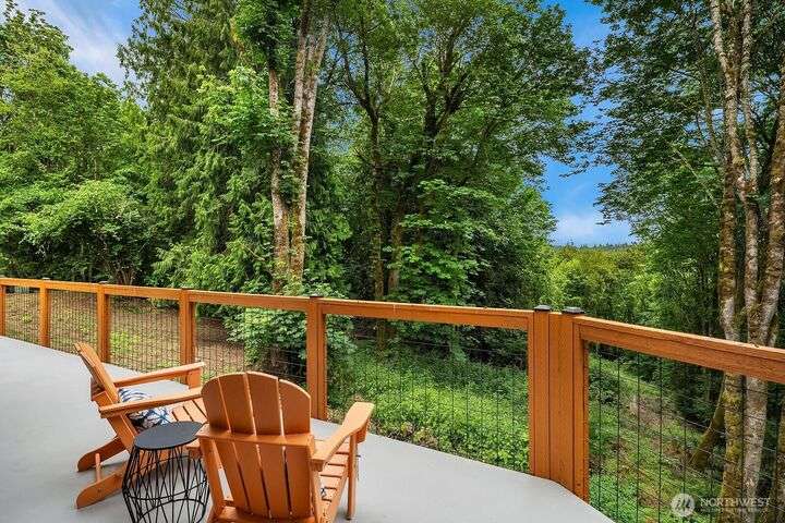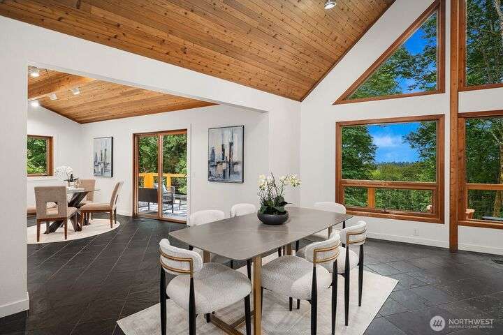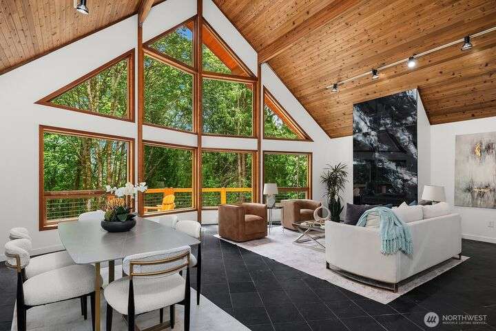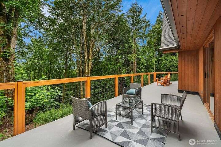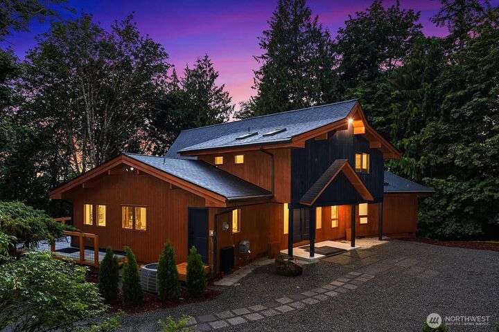 Nestled behind a private gate on nearly 5 acres, this one-of-a-kind retreat blends elegance, privacy, & a picturesque view of Mt. Rainier. With over 3,200SF of thoughtfully laid out living space, every detail is elevated; soaring wood lined ceilings, rich hardwoods, enormous wraparound deck, a chef’s kitchen, waterfall island & premium appliances. The sun-drenched great room centers around a stunning fireplace & panoramic windows that captures the mountain in perfect stillness. Upstairs, the spa-like primary suite offers a luxe bath, walk-in closet & unforgettable vistas. Downstairs includes a second living space & versatile bonus room. Beautifully landscaped, parking & near I405.