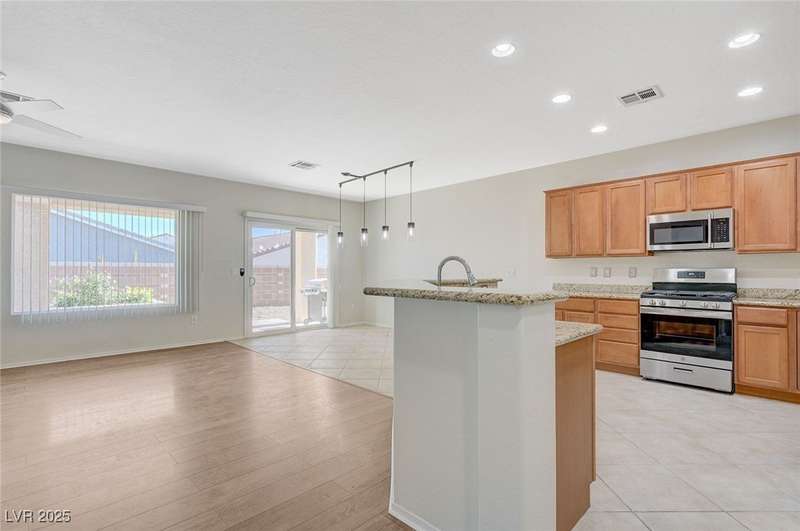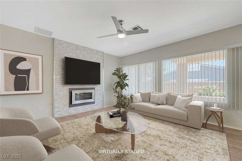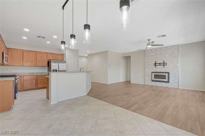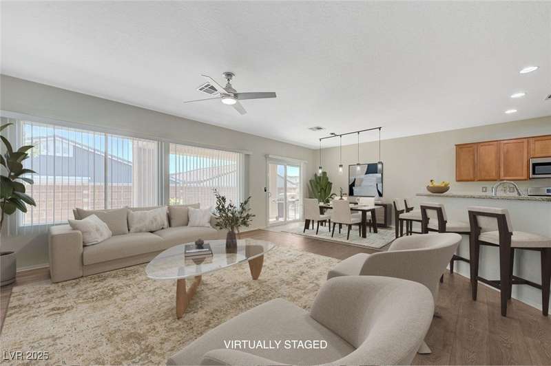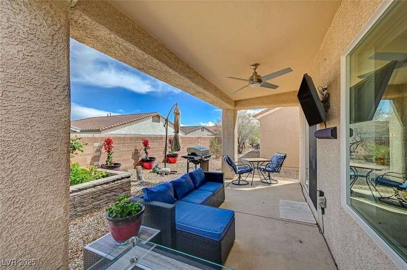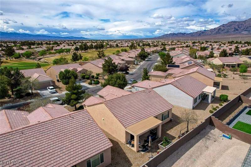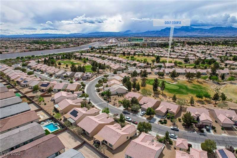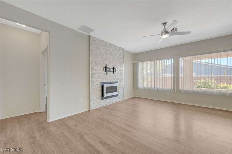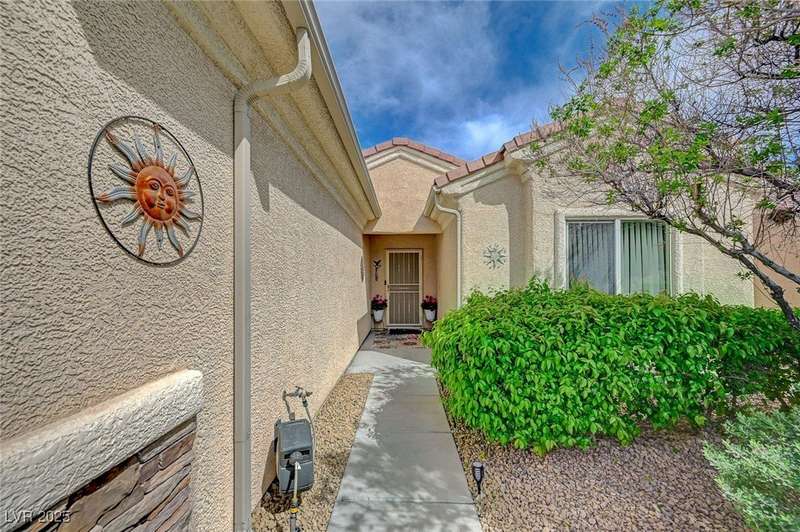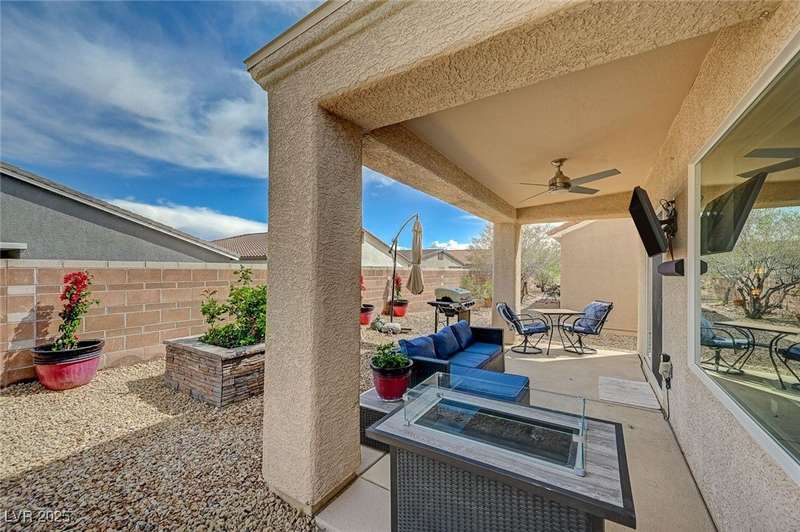 Discover this stunning single story home in the highly desired age qualified Sun City Aliante community! Featuring 2 beds + den, 2 baths, and breathtaking mountain views, this home offers an open-concept design with a spacious kitchen, large breakfast bar, granite countertops, 2 pantries, and all included stainless steel appliances. The primary suite boasts a huge walk-in closet and picture windows. Enjoy luxury vinyl plank & tile flooring throughout, custom fireplace, upgraded light fixtures, and a den that can serve as a third bedroom. The backyard oasis includes a covered patio with a Charbroil Gas BBQ with an option to fully fence and a garden area. The finished 2 car garage features epoxy floors, a workshop, ample storage, 30-amp outlet, full water treatment/filtration system & water softener. Sun City Aliante offers top tier resort-style amenities: golf, indoor & outdoor pools/spas, tennis, pickleball, basketball courts, clubhouse, fitness center, and more! Don’t miss this one!