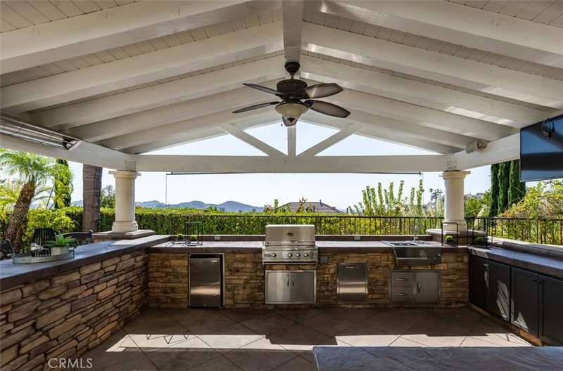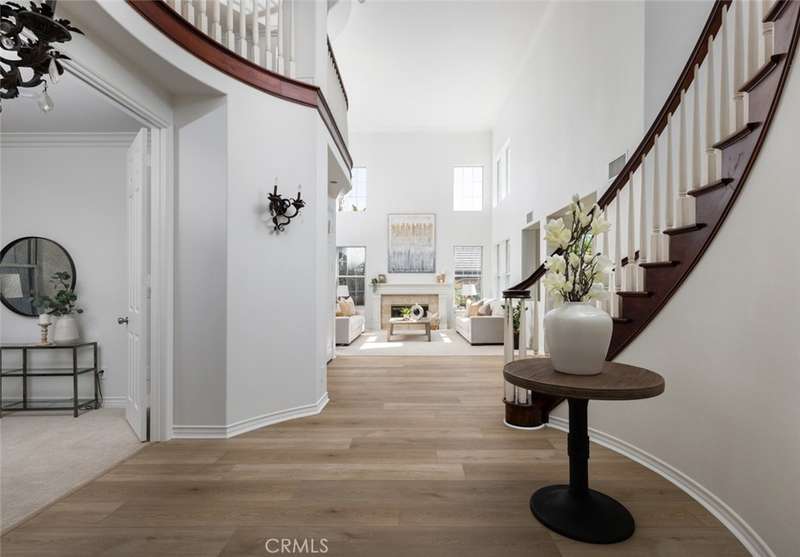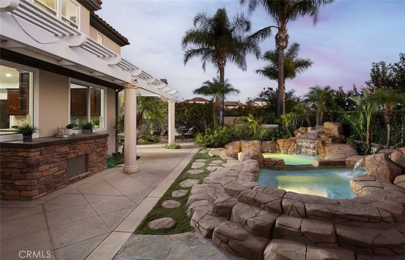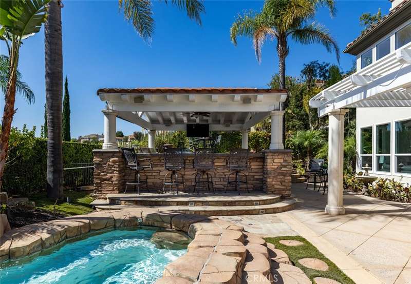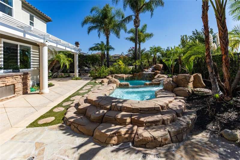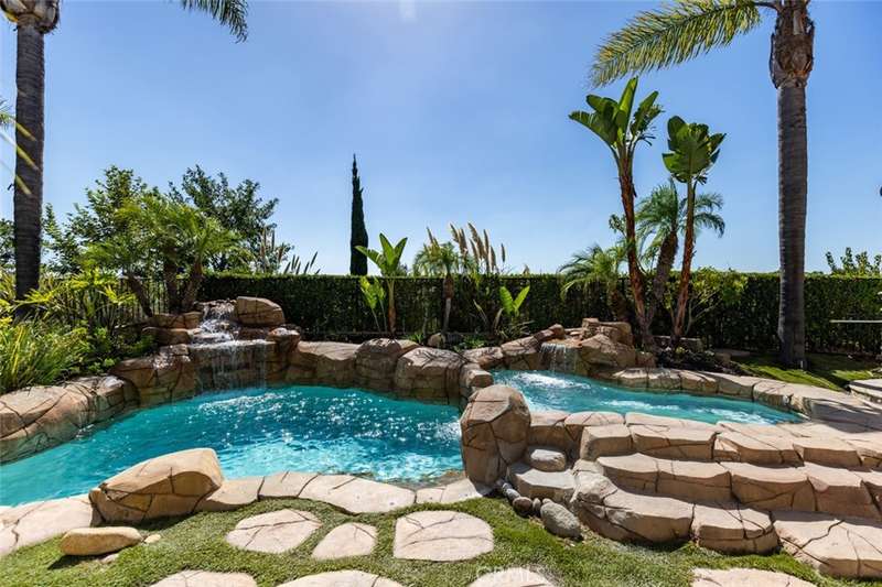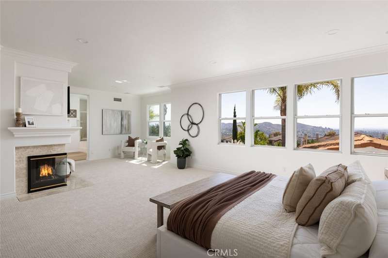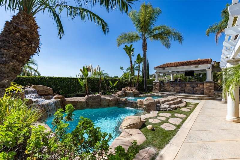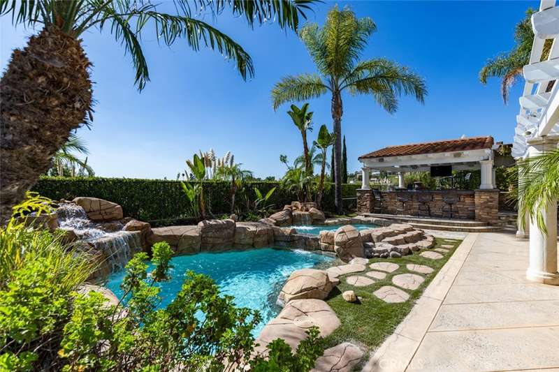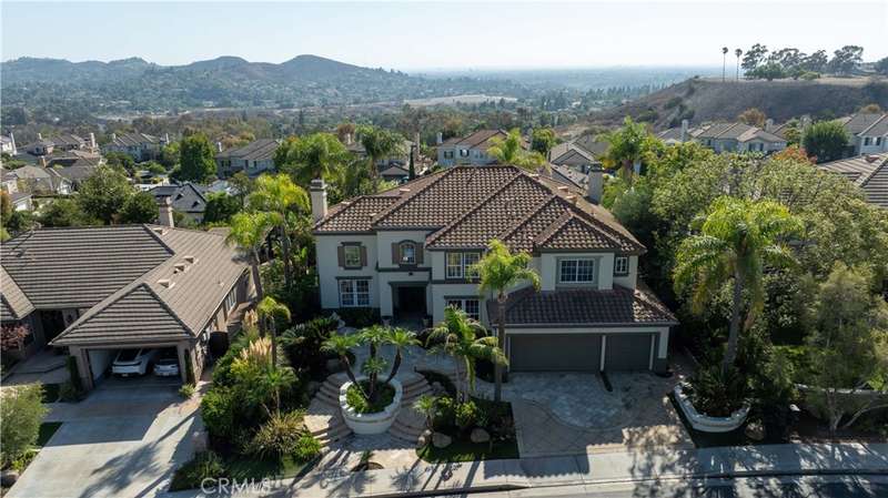 RENOVATED LUXURY HOME | PANORAMIC VIEWS | SPARKLING POOL & SPA | EN-SUITE BEDROOMS | GATED PARKRIDGE COMMUNITY | Welcome to 6336 E Cedarbrooks Avenue, a stunningly updated home located in the prestigious gated community of Parkridge in Orange. With five spacious bedrooms, five and a half bathrooms, and a separate office, this expansive two story property offers the perfect combination of elegance, comfort, and functionality, ideal for modern living and entertaining. Completely renovated with a designer's touch, the home features fresh interior and exterior paint, brand new luxury vinyl plank flooring, plush new carpet, custom countertops, and beautifully remodeled bathrooms. From the dramatic curved staircase to the soaring ceilings and abundant natural light, every space has been thoughtfully refreshed with timeless style and quality. At the heart of the home is the oversized chef's kitchen, complete with quartz countertops, rich wood cabinetry, a center island, and stainless steel appliances. It opens directly to a spacious family room with built-in speakers and walls of windows that showcase the lush backyard and hillside views. A formal living room with two story ceilings and a separate dining room provide even more space to gather. The flexible floor plan includes a downstairs en-suite bedroom, perfect for guests or multi generational living. Upstairs, each of the four additional bedrooms has its own private bathroom, offering privacy and convenience for every member of the household. The expansive primary suite features a wall of windows with panoramic views, a spa-inspired bathroom with dual vanities, soaking tub, walk-in shower, and two generous walk-in closets. Step outside to your private oasis, complete with a lagoon-style pool and spa, rock waterfalls, built-in BBQ bar, and multiple seating areas all surrounded by tropical landscaping and sunset views. Residents of Parkridge enjoy two private gates, a community pool and spa, sport court, BBQ areas, and access to nearby hiking and biking trails, shops, dining, and top rated schools. 6336 E Cedarbrooks Avenue is move-in ready and offers resort style living in one of Orange's most coveted neighborhoods.