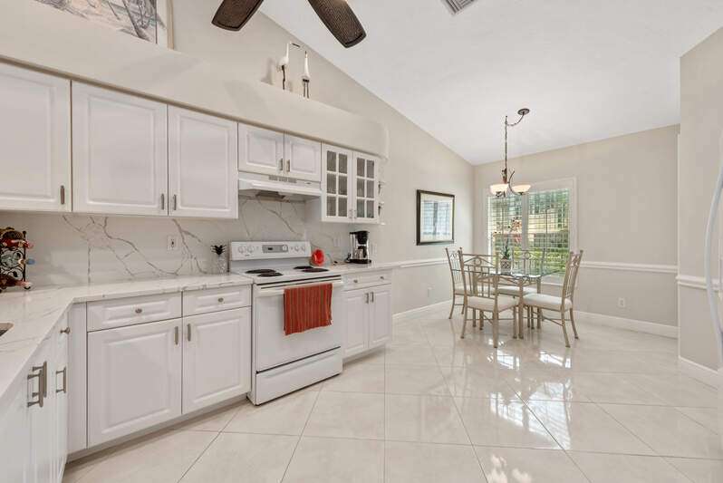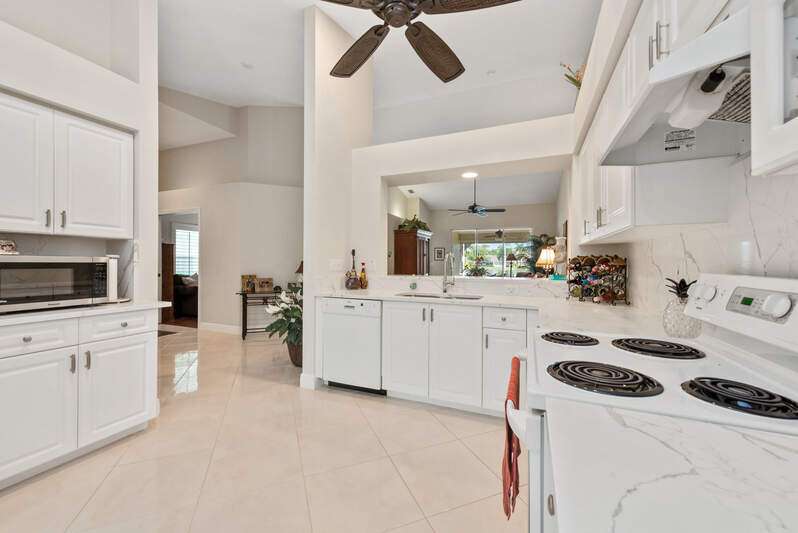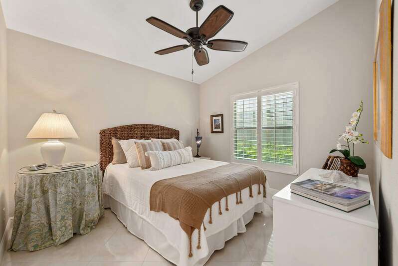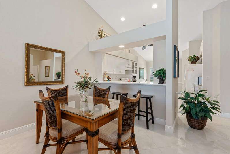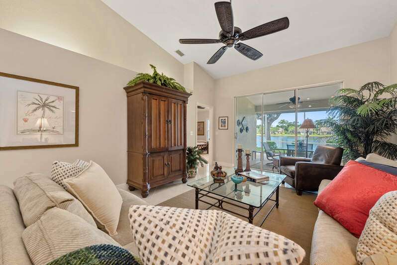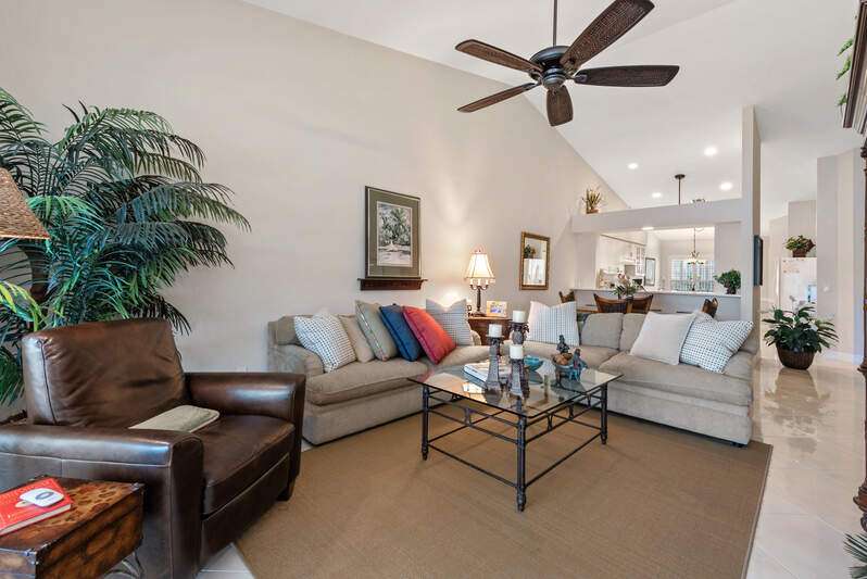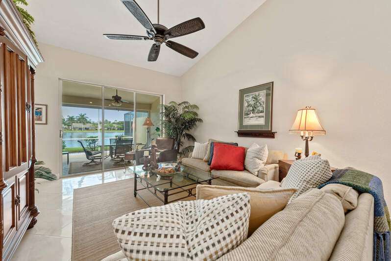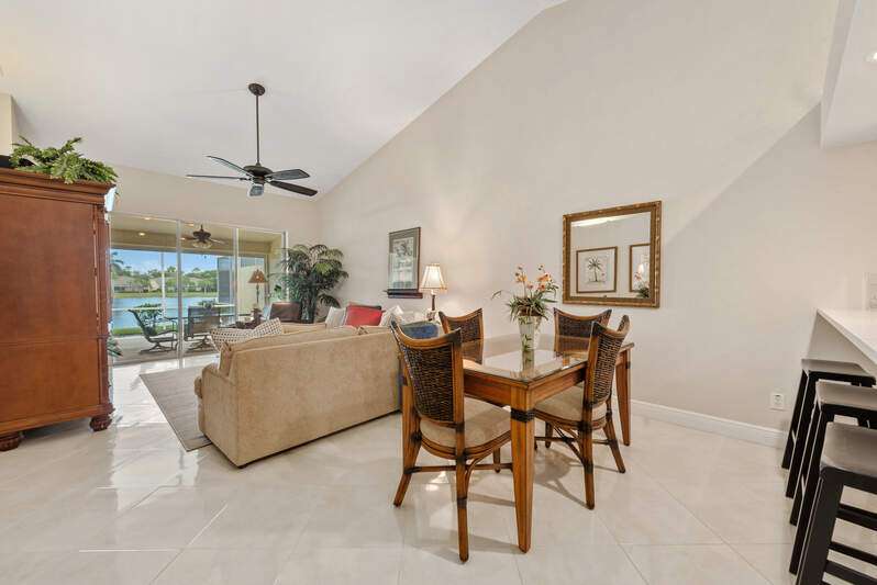 Welcome to The Villas at Greenwood-a serene, gated enclave just under 3 miles from vibrant Downtown Naples and its world-renowned beaches. This beautifully updated 3-bedroom, 2-bath attached villa with a two-car garage offers an ideal blend of comfort, style, and location-all with low HOA fees. Step inside and discover a pristine interior with soaring cathedral ceilings and modern, high-gloss tile flooring throughout the main living areas and primary bedroom. The remodeled kitchen shines with white marble-look countertops and backsplash, ample cabinetry, and a generous eat-in area overlooking the landscaped front yard. A wide passthrough opens to the spacious great room, perfect for casual entertaining with room for multiple bar stools. The primary suite offers peaceful lake views and an en-suite bath featuring double vanities with quartz countertops and sleek new shower doors. The third bedroom, currently used as a den/office, features warm wood flooring, providing flexibility to suit your lifestyle. Enjoy your evenings on the screened lanai, where stunning sunsets reflect off the tranquil lake-a perfect setting for unwinding with your favorite beverage. For peace of mind while you're away, the villa includes electric hurricane shutters on the lanai and high-impact resistant clear shutters on all windows. This home is offered completely turnkey furnished with tasteful, quality furnishings-just bring your suitcase!