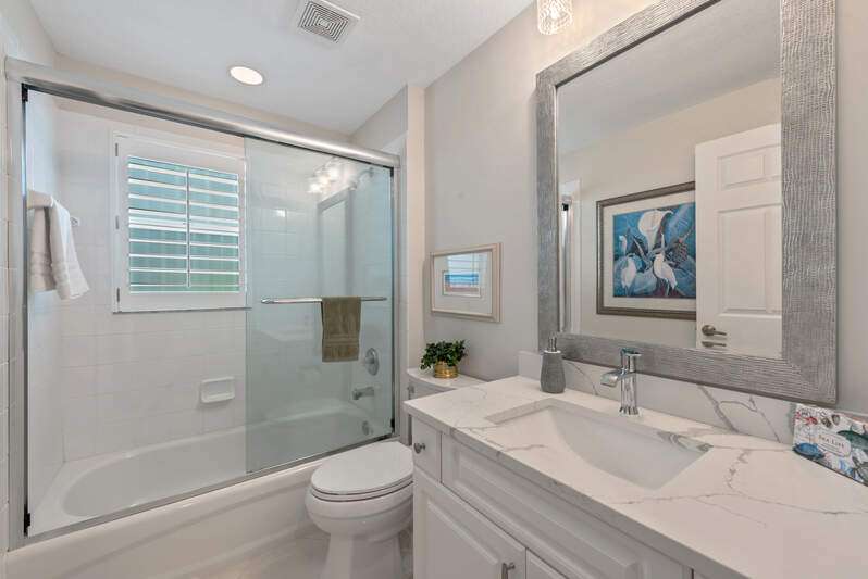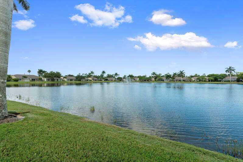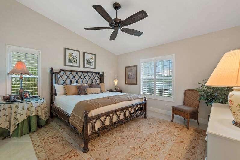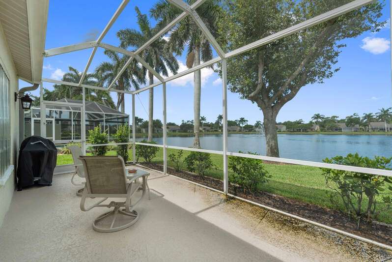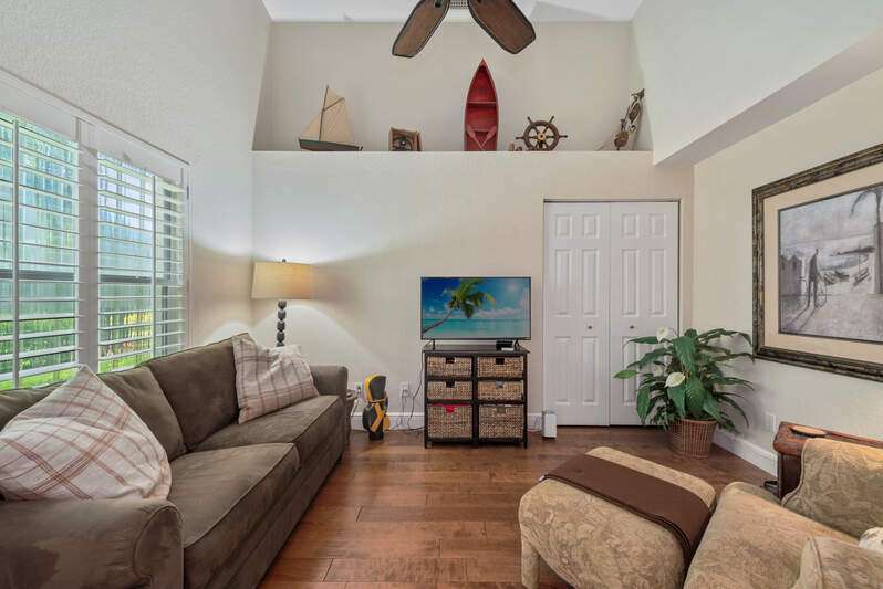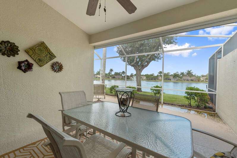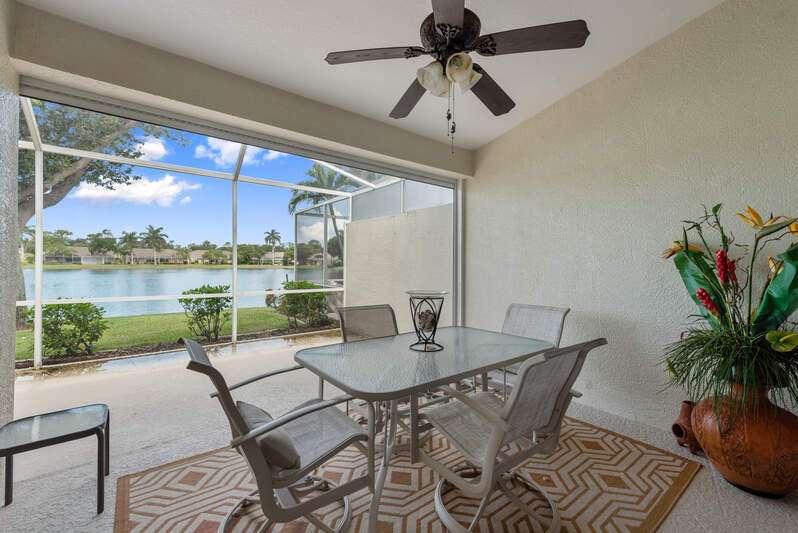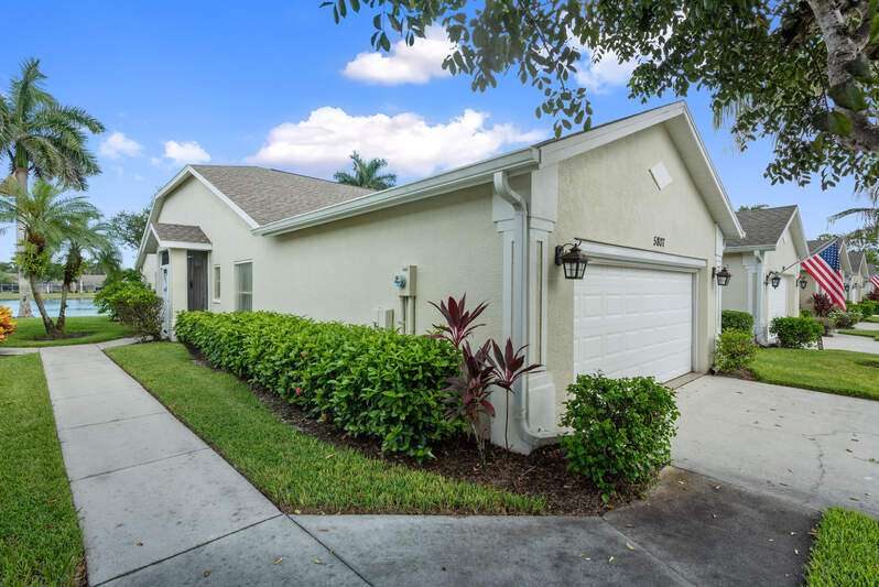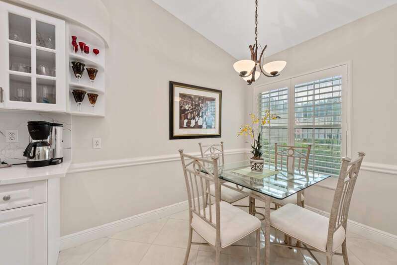Welcome to The Villas at Greenwood-a serene, gated enclave just under 3 miles from vibrant Downtown Naples and its world-renowned beaches. This beautifully updated 3-bedroom, 2-bath attached villa with a two-car garage offers an ideal blend of comfort, style, and location-all with low HOA fees. Step inside and discover a pristine interior with soaring cathedral ceilings and modern, high-gloss tile flooring throughout the main living areas and primary bedroom. The remodeled kitchen shines with white marble-look countertops and backsplash, ample cabinetry, and a generous eat-in area overlooking the landscaped front yard. A wide passthrough opens to the spacious great room, perfect for casual entertaining with room for multiple bar stools. The primary suite offers peaceful lake views and an en-suite bath featuring double vanities with quartz countertops and sleek new shower doors. The third bedroom, currently used as a den/office, features warm wood flooring, providing flexibility to suit your lifestyle. Enjoy your evenings on the screened lanai, where stunning sunsets reflect off the tranquil lake-a perfect setting for unwinding with your favorite beverage. For peace of mind while you're away, the villa includes electric hurricane shutters on the lanai and high-impact resistant clear shutters on all windows. This home is offered completely turnkey furnished with tasteful, quality furnishings-just bring your suitcase!