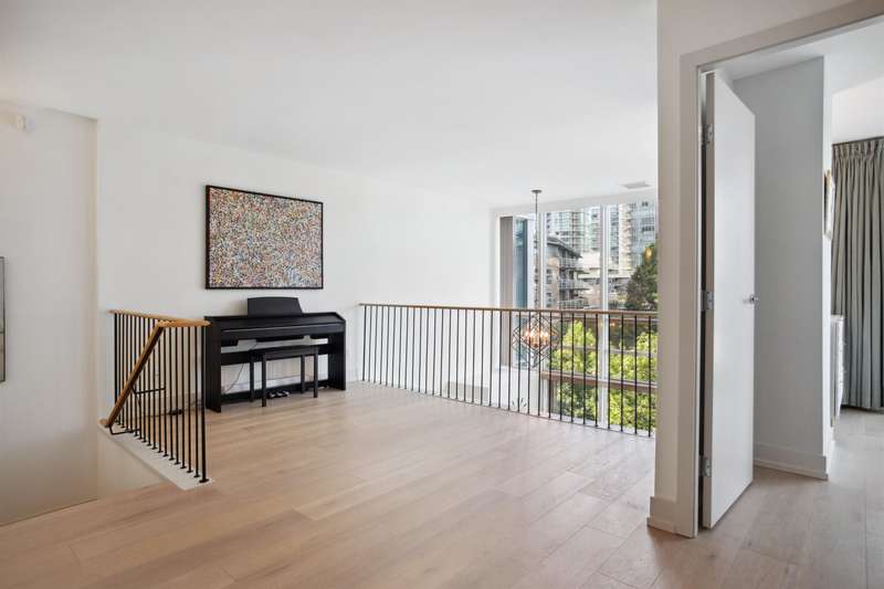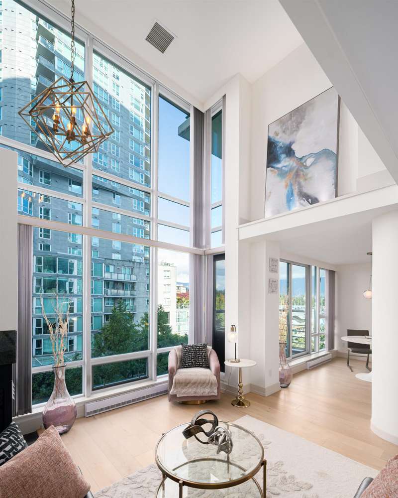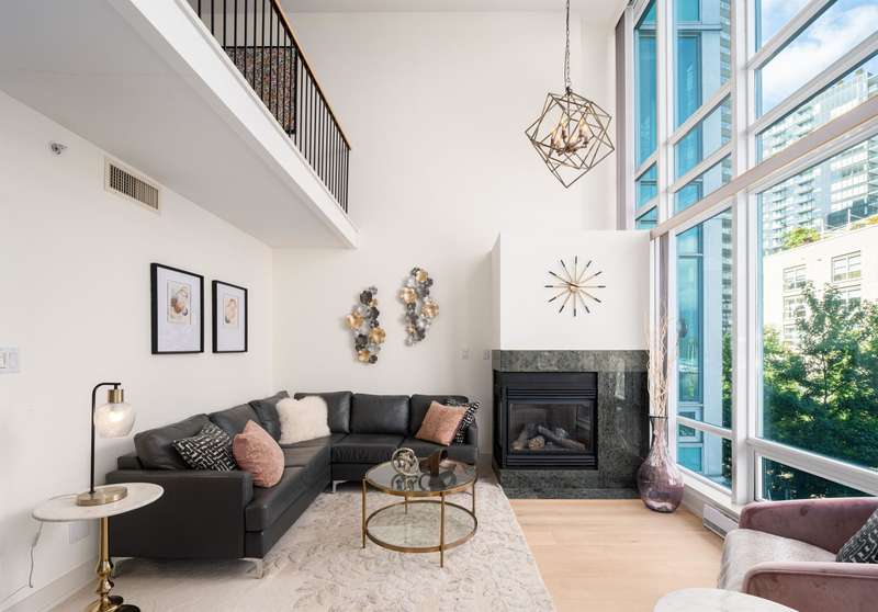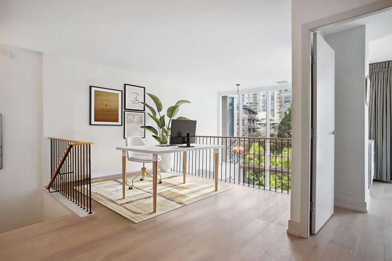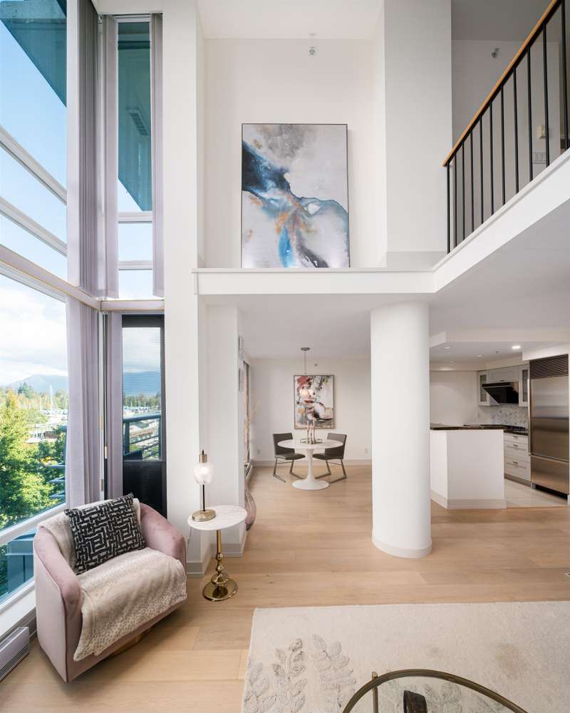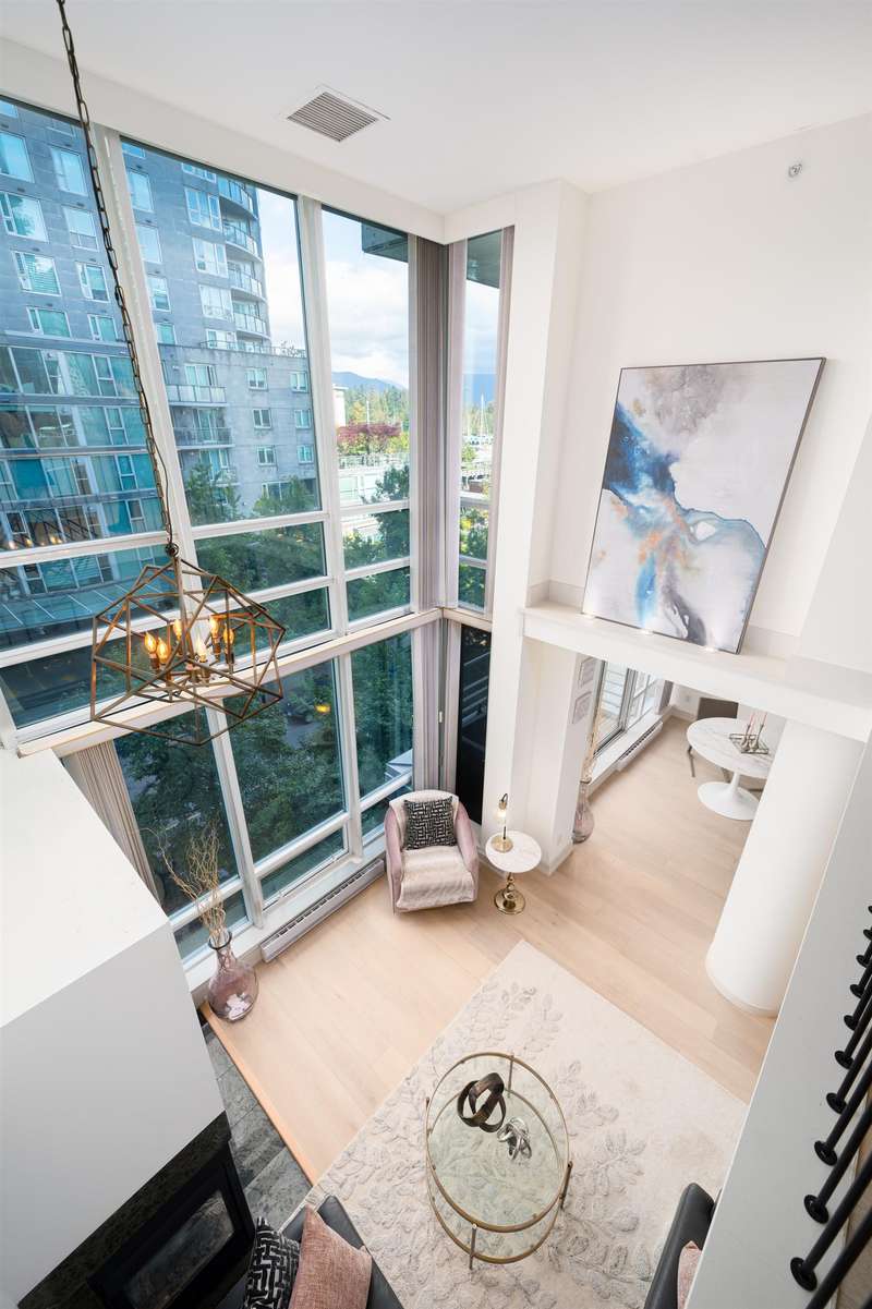 An upgraded, stunning modern one-bedroom loft with ocean views & A/C at Cascina. A rare gem in the heart of Coal Harbour, boasting soaring double-height ceiling, impressive open space ideal for entertaining, beautiful views of ocean, mountains, Stanley Park & marina, perfectly blending luxury & comfort. Upgrades incl. engineering h/w floor, hood fan, backsplash, dishwasher, refinished cabinets, Bosch washer & dryer, walk-in closet, lighting fixtures, motorized shades in the primary bedroom. Elevator access to the 2nd floor. (The 2nd bedroom refers to the flex room/space on the 2nd floor.) Meticulously maintained, ready to move in. Resort-style amenities: 3 elevators, 24/7 concierge, indoor pool, hot tub, gym, sauna, steam, party rm, library, theatre, etc.