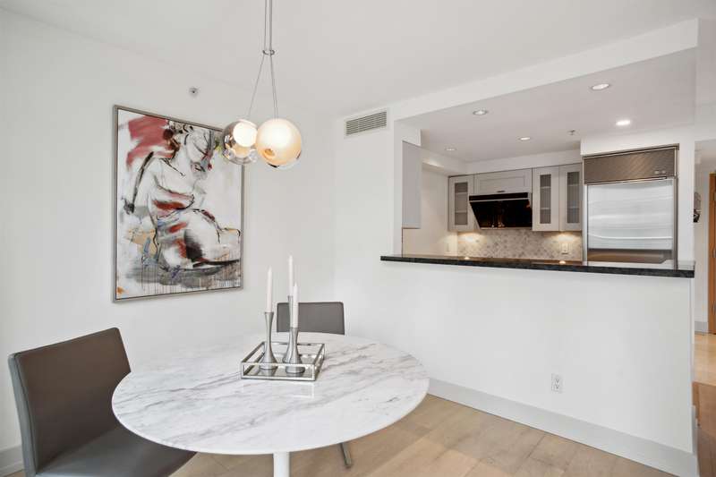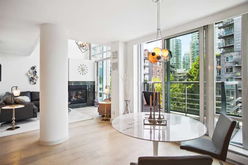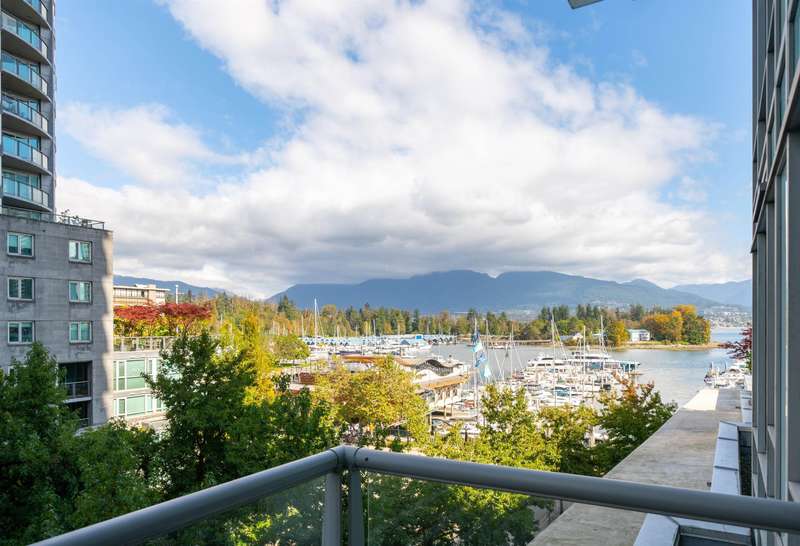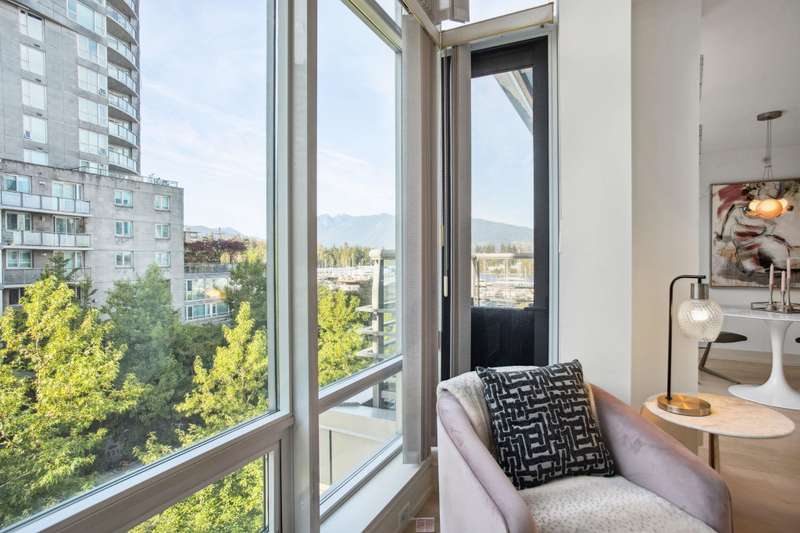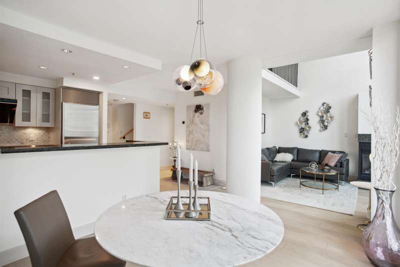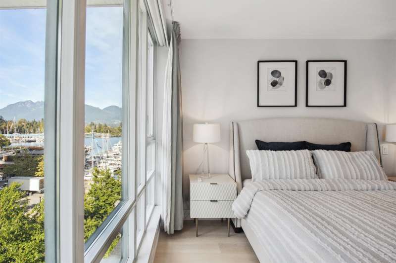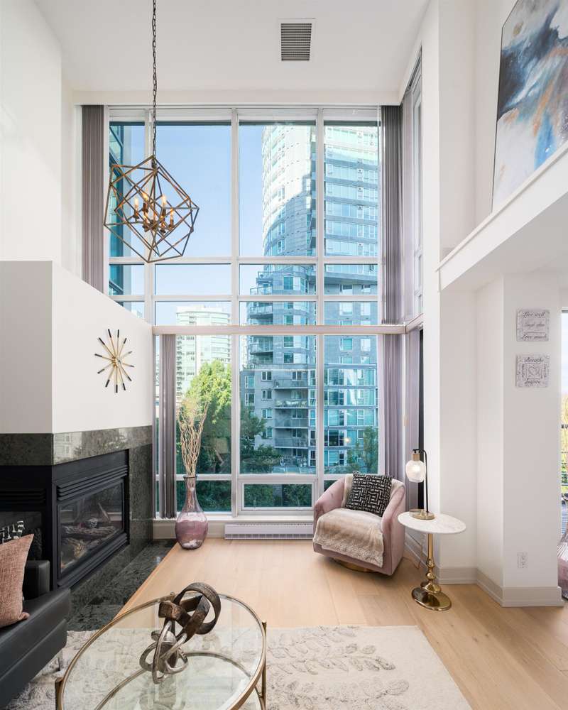 An upgraded, stunning modern one-bedroom loft with ocean views & A/C at Cascina. A rare gem in the heart of Coal Harbour, boasting soaring double-height ceiling, impressive open space ideal for entertaining, beautiful views of ocean, mountains, Stanley Park & marina, perfectly blending luxury & comfort. Upgrades incl. engineering h/w floor, hood fan, backsplash, dishwasher, refinished cabinets, Bosch washer & dryer, walk-in closet, lighting fixtures, motorized shades in the primary bedroom. Elevator access to the 2nd floor. (The 2nd bedroom refers to the flex room/space on the 2nd floor.) Meticulously maintained, ready to move in. Resort-style amenities: 3 elevators, 24/7 concierge, indoor pool, hot tub, gym, sauna, steam, party rm, library, theatre, etc.