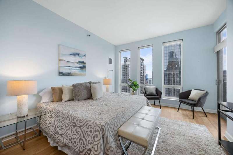 Perfect South Loop location, soaring high above the city, this stunning 3 bed / 2 bath condo offers bright, open living with dramatic 10' ceilings and sweeping views that stretch from the sparkling lake to the iconic skyline. Sunlight pours into this south-facing home, while two private balconies invite you to unwind and watch the sailboats drift by. All three bedrooms are fully enclosed with floor-to-ceiling walls and windows, ensuring both privacy and natural light. The expansive living area easily accommodates a dining space, perfect for entertaining. The chef's kitchen impresses with 40" white cabinetry, sleek stainless steel appliances, and granite countertops. The spacious primary suite boasts dual custom closets and a spa-inspired bath with a separate shower. The two additional bedrooms are generously sized, easily fitting queen or king beds. Set in a full-amenity luxury building, residents enjoy 24-hour door staff, a resort-style outdoor pool, fitness center, party room, dog run, and more. Ideally located just steps from the lakefront, Grant Park, Soldier Field, the Museum Campus, dining, shopping, transit, and major highways. Heated indoor parking available.