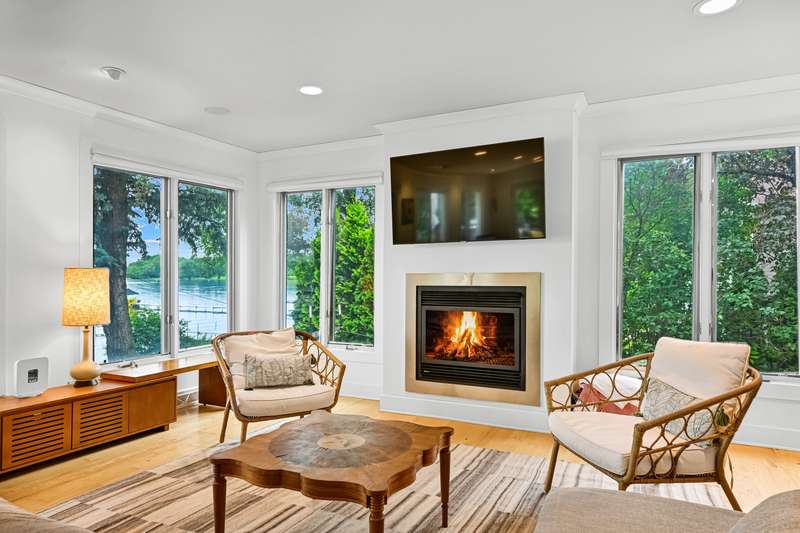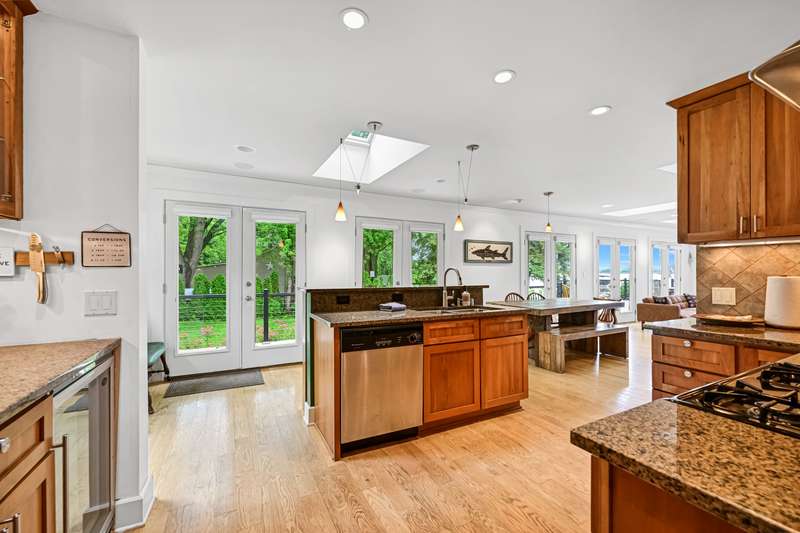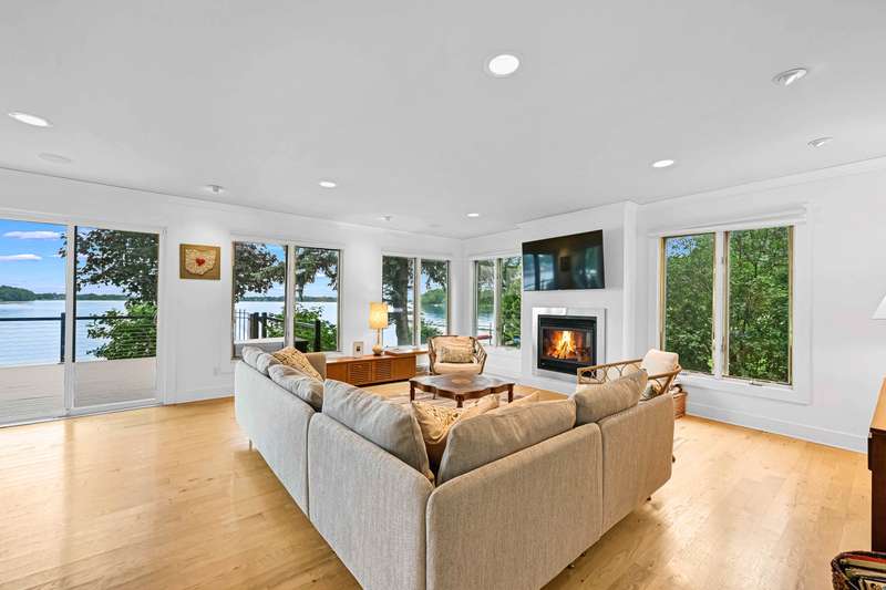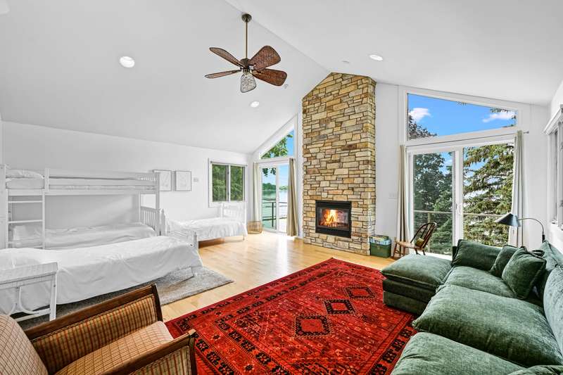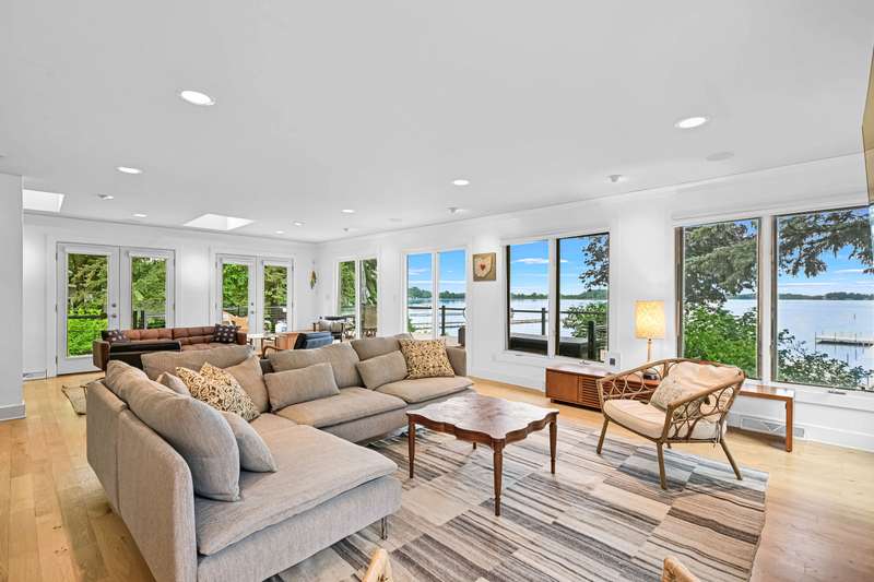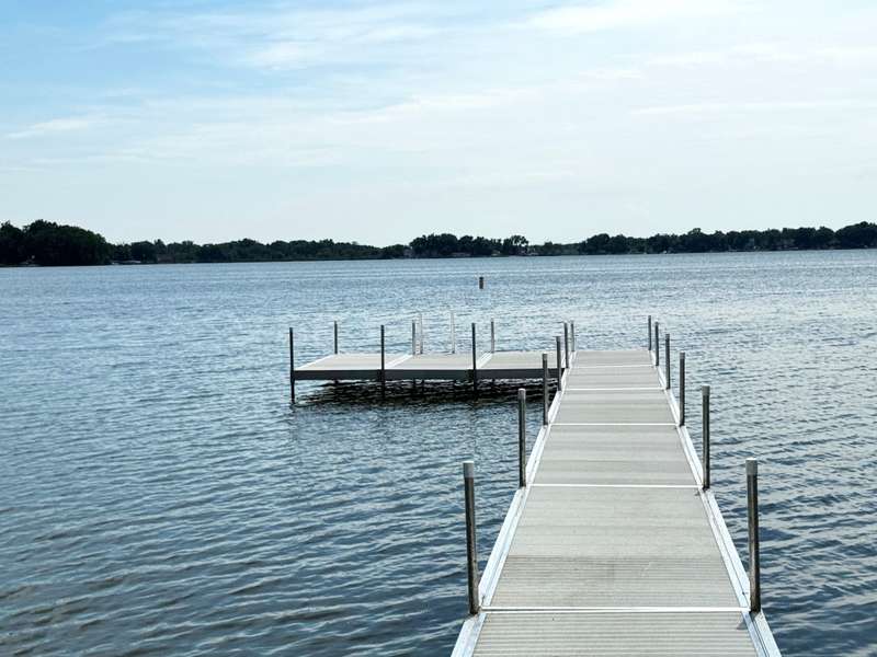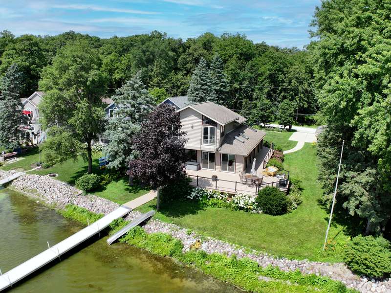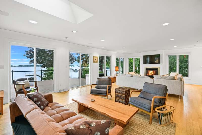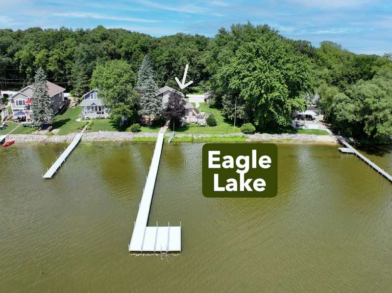 Imagine beginning your day with the breathtaking views of Eagle Lake, presenting a remarkable lakeside living experience. You can enjoy the final days of summer on your 87-foot flat lot, which offers stunning water views from a spacious, modern deck and a newly constructed pier with an expanded platform. Inside, you will find an inviting layout with a kitchen that features a large island, granite countertops, a tiled backsplash, stainless steel appliances, and attractive hardwood flooring. Enjoy the abundance of natural light from the numerous windows and new patio doors that showcase the beautiful lake perspectives from every angle. Two primary bedroom suites, situated on different levels, provide a wonderful sense of privacy for residents. The upstairs suite boasts a private balcony, a gas fireplace, and vaulted ceilings that enhance your appreciation of the peaceful lake views.