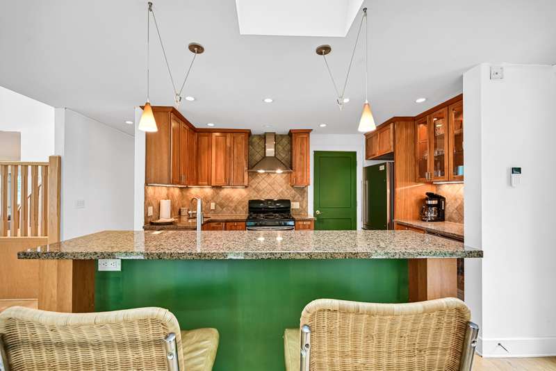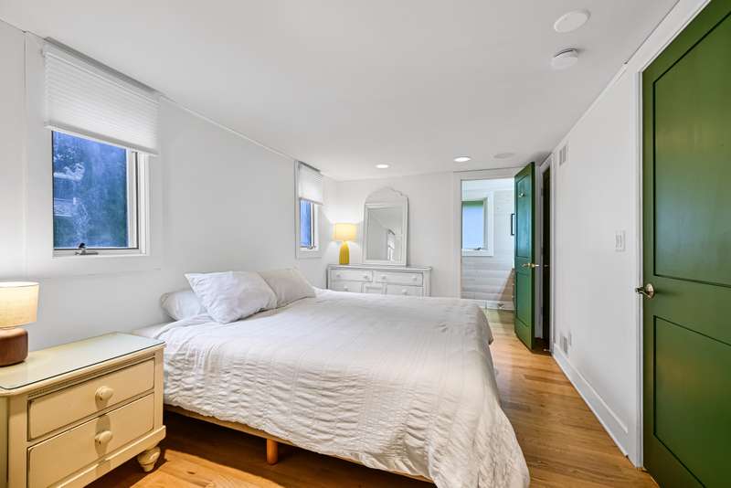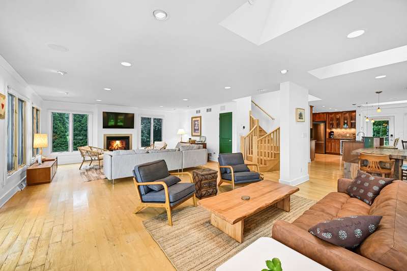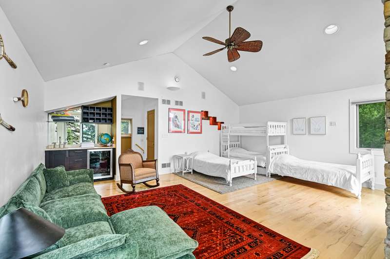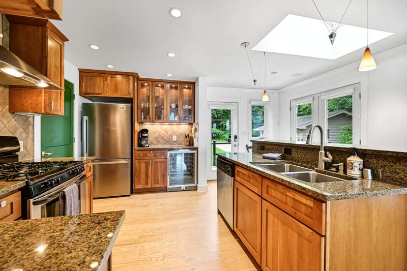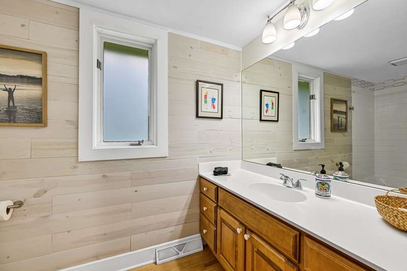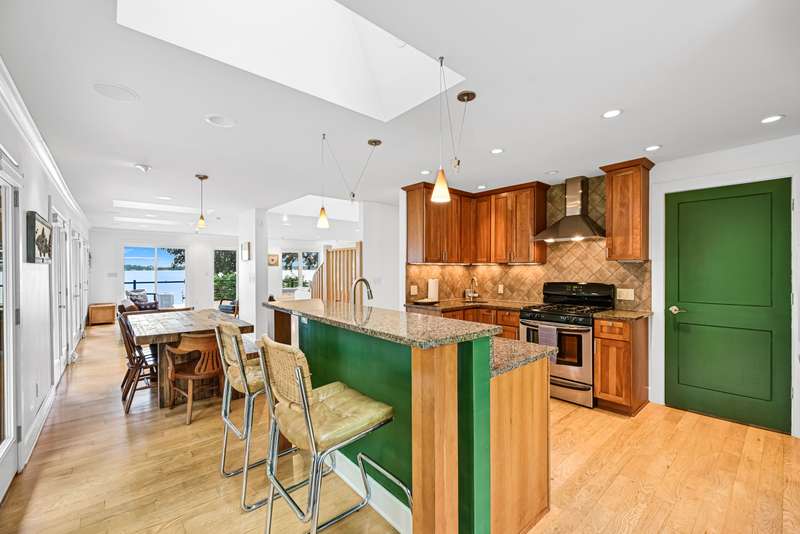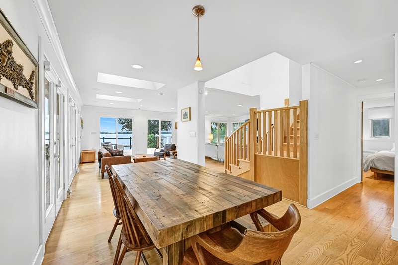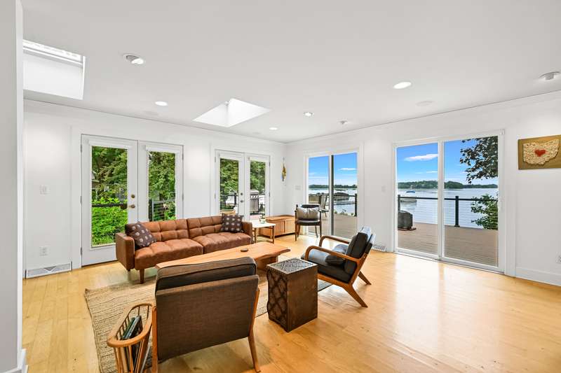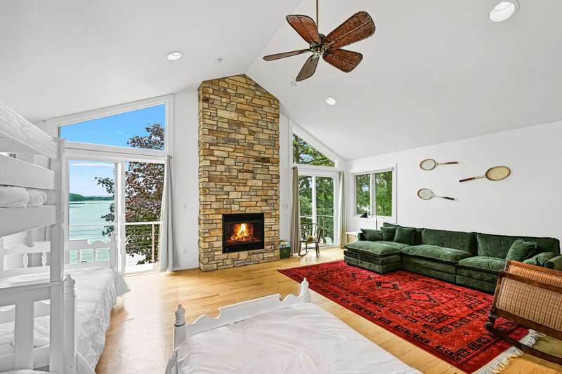 Imagine beginning your day with the breathtaking views of Eagle Lake, presenting a remarkable lakeside living experience. You can enjoy the final days of summer on your 87-foot flat lot, which offers stunning water views from a spacious, modern deck and a newly constructed pier with an expanded platform. Inside, you will find an inviting layout with a kitchen that features a large island, granite countertops, a tiled backsplash, stainless steel appliances, and attractive hardwood flooring. Enjoy the abundance of natural light from the numerous windows and new patio doors that showcase the beautiful lake perspectives from every angle. Two primary bedroom suites, situated on different levels, provide a wonderful sense of privacy for residents. The upstairs suite boasts a private balcony, a gas fireplace, and vaulted ceilings that enhance your appreciation of the peaceful lake views.