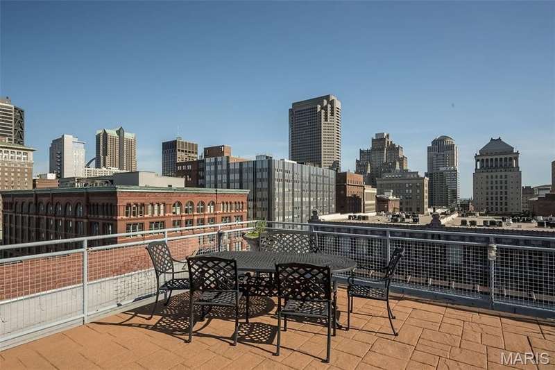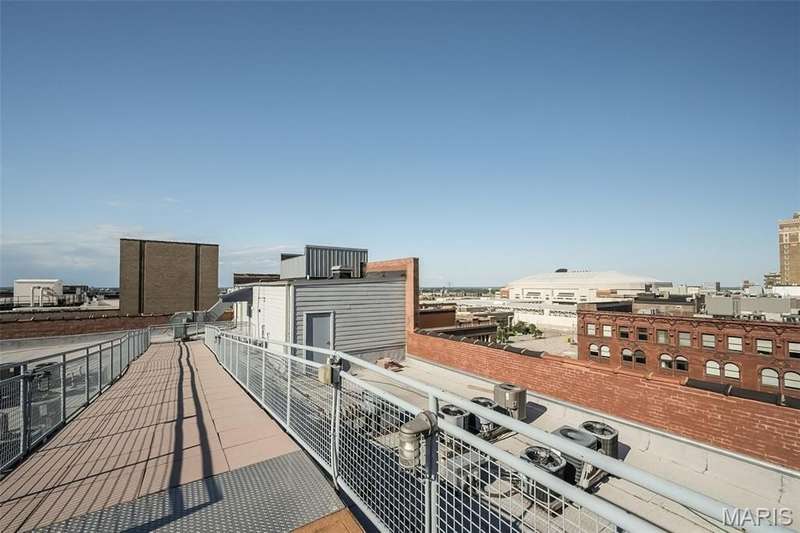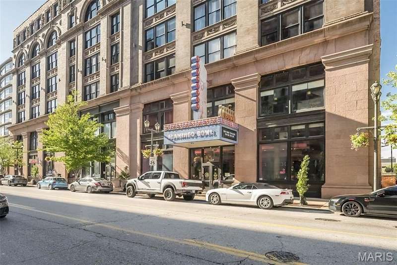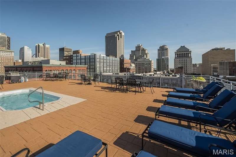 Washington Avenue 6th Floor Loft with 14 Feet of windows overlooking Washington Ave. One of the larger 1-bedroom condo plans in the building, it has a nice open plan, concrete floors, 12' tall wood ceilings and large bright Arched windows. Curved wall entry foyer, massive wooden posts, and some exposed brick give the downtown loft character. The large open Great Room includes the kitchen featuring granite countertops, SS appliances and a breakfast bar along with the living and dining room area. Bathroom has a glass enclosed shower and separate jetted tub and access to the main bedroom and walk-in closet. Rooftop patio and pool area for BBQ or watching the city views. Garage parking w/ 1-assigned space with adjacent storage cage. These artistically designed lofts feature curved walls, exposed brick/stone and colorful decor throughout the building. Newer Range & Microwave (2022), dishwasher (2021). Active condo association and owners. Secure key fob entrance. Location: City, Downtown, Upper Level