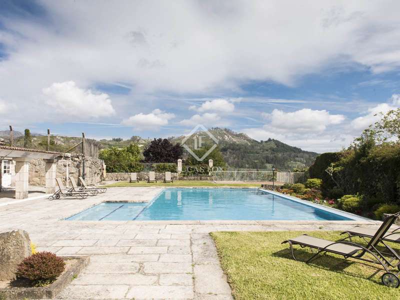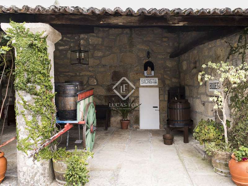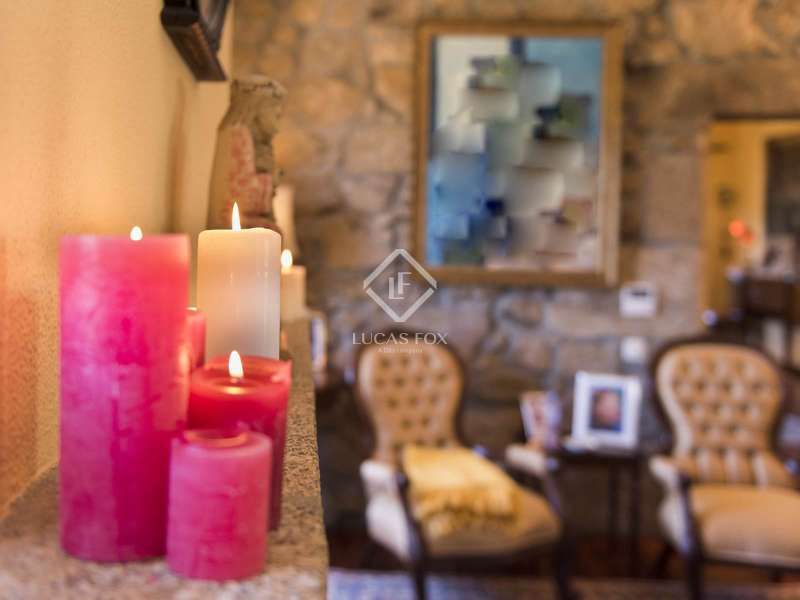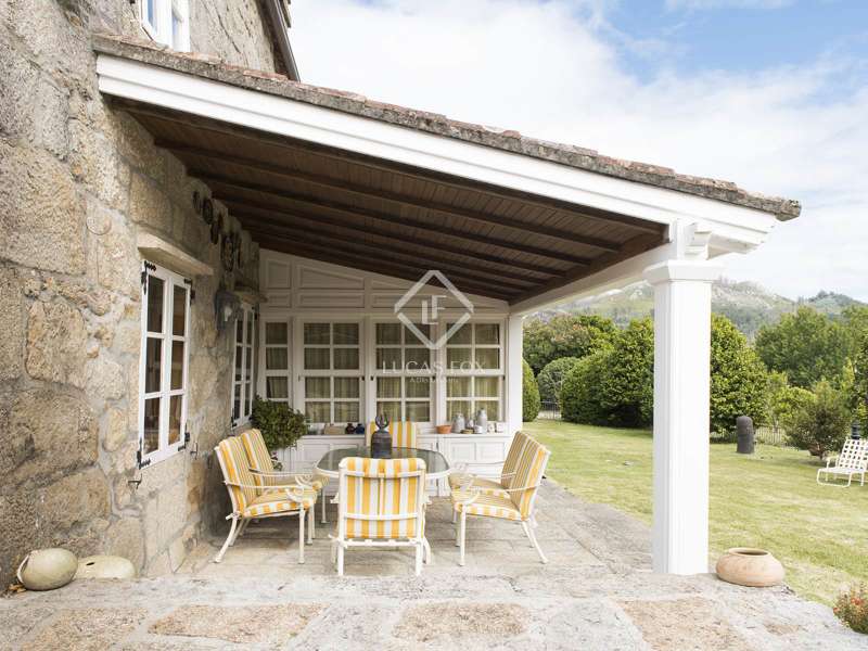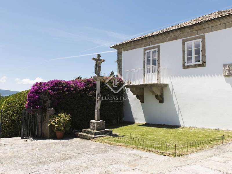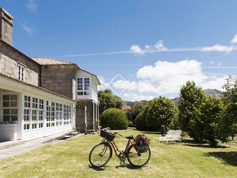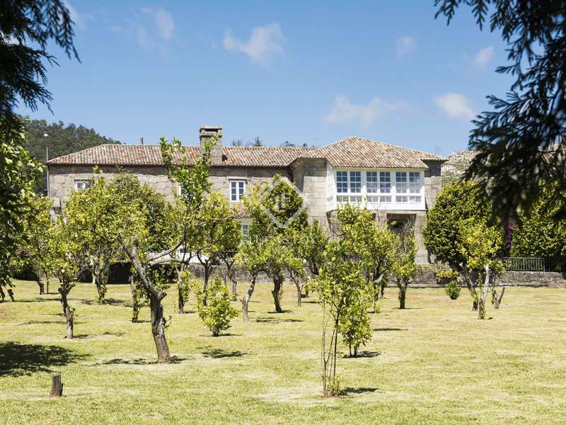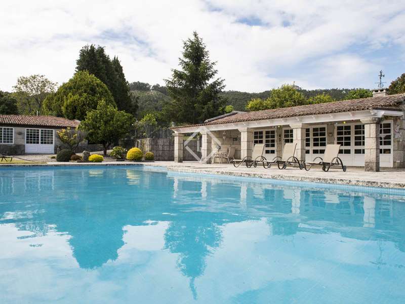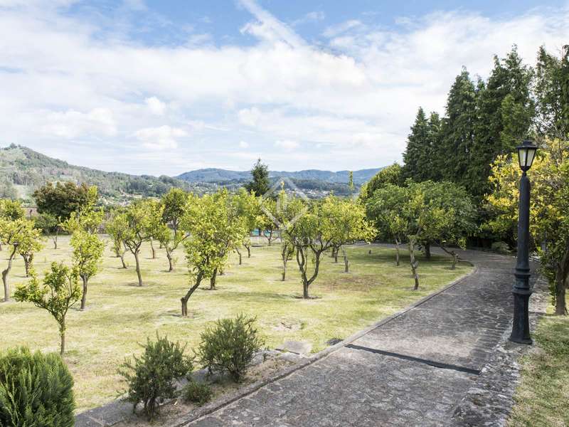 This exceptional property, dating back to the 19th century, is located in Nigran, Pontevedra. The 6,681m² estate is surrounded by an original stone wall and offers total privacy. The estate includes the original private chapel and 3 independent guest houses. The property has a built area of 764m² of which 540m² correspond to the main house, distributed across 2 floors. The main floor is accessed through a stone porch, a characteristic feature in historic buildings such as this. We are welcomed into a reception area that leads to the living room, here you will find a large wood burning stone fireplace, and windows with views to the gardens, this area boasts fine finished hardwood flooring. Continuing on this floor we access the lovely 35m² dining room and the kitchen. On the same floor we find the master bedroom with en-suite measuring 25m². There is a vast glazed gallery offering views of the "cruceiro", the chapel and the beautiful gardens with fruit trees of different types and a variety of ornamental plants. It is worth noting that among the trees are South American species that have adapted very well to the unique climate of this area, such as avocado & mango. All the windows on this floor have been renovated with double glazing and security plus fireproof wood which respects the style of the original construction. The ground floor, accessed from the main hall of the upper level, includes a lounge area, two bedrooms overlooking the garden and with built-in wardrobes and two bathrooms. There is an additional room currently used as a craft workshop which could be used as an extra bedroom. From the same lounge we access to a fully glazed gallery that leads directly to the garden and the summer dining terrace outside. The house also has a service entrance that leads to a private en-suite and laundry room. In the grounds surrounding the house there is a leisure area with a large house used for dining and events and a magnificent large swimming pool. This house has a large living area, a dining section, a kitchen with bar, as well as fireplace and air conditioning. There is a stone barbecue by a large stone table under a thick vine of kiwis, perfect for spring-summer but also pleasant in the autumn. The Chapel with its sacristy, large porch, winery, winepress, the cruceiro, hórreo and other facilities for staff make this a truly exceptional property. There are three independent guests houses, two featuring living areas, bathrooms and separate entrances. Contact us for further information.