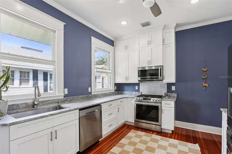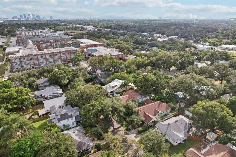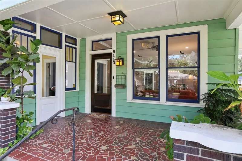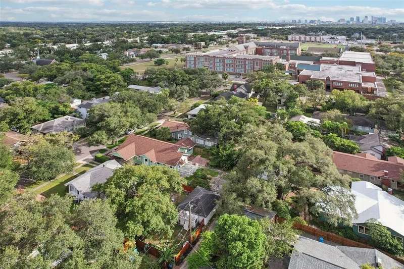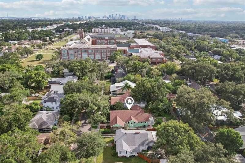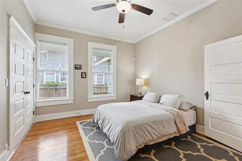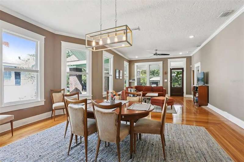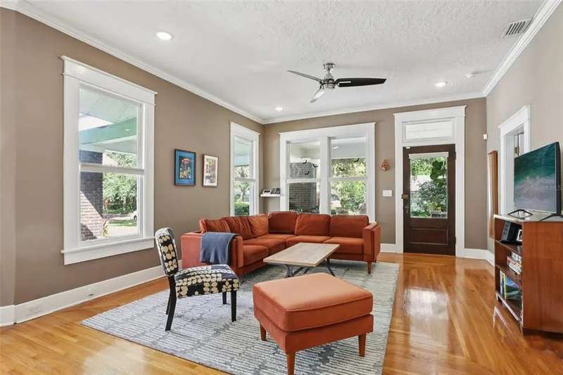 This stunningly restored 1910 bungalow blends historic charm with modern upgrades. Located in the heart of historic Seminole Heights on a large 61x132 lot, this home has beautifully refinished hardwood floors, crown molding, and high ceilings throughout. The living and dining rooms feature recessed lighting, custom light fixtures, and bottom-up cordless shades for privacy and style. The kitchen is a chef’s dream, boasting stone countertops, stainless steel Samsung appliances, a walk-in pantry with built-in shelving, and direct access to the utility room and outdoor deck. The newly remodeled primary suite includes a built-in closet and a luxurious full bathroom with stone counters and a walk-in shower. Bedroom 2 opens to a sunroom through French doors and showcases tile flooring and a custom light fixture, while Bedroom 3 offers a built-in closet and a cozy den/office space wrapped in windows and beadboard paneling, perfect for work or relaxation. The 2nd bath was renovated with classic tile honoring the era of the home. The utility room includes washer/dryer, built-in storage, and backyard access. Outside, enjoy a covered front porch, a huge back yard, and a long driveway with porte cochère. The backyard is ideal for entertaining, with a wood deck, paver patio, gated side yard, alley access, and a storage shed. Recent updates include a new roof (2023), AC system (2020), foundation restoration (2022), and a PEX plumbing system (2016). The home also features a tankless electric water heater and water softener. This prime property offers walkable access to Florida Avenue’s most sought-after restaurants and is just minutes from Raymond James Stadium, Armature Works, Downtown Tampa, Tampa International Airport, and I-75.