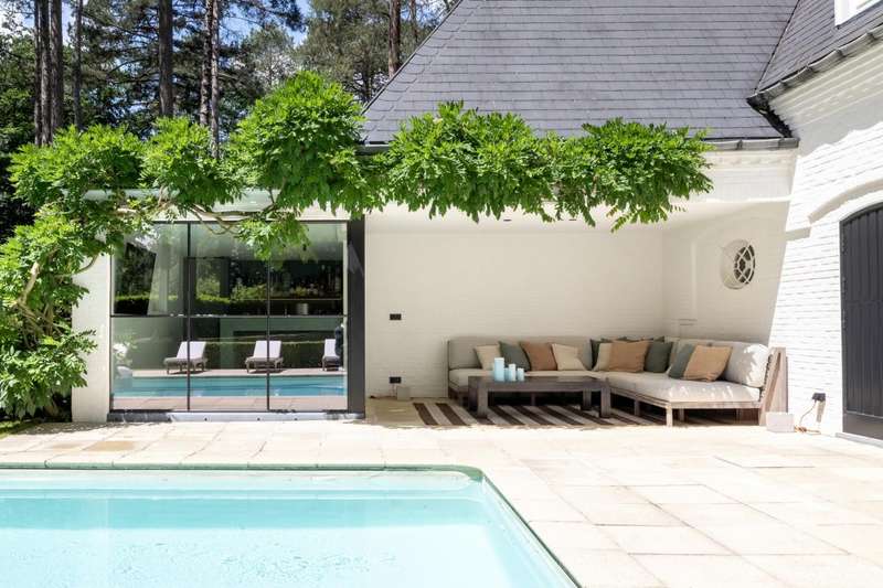On the edge of the prestigious Golf des 7 Fontaines, this magnificent charming villa was completely renovated in 2021 and benefits from an exceptional environment: a flat plot of ± 50 ares, planted with trees, perfectly south-west facing and out of sight. The house has a living area of ± 400 m² and a built area of ± 525 m², with charming reception rooms with a fireplace and office area, a separate dining room, a fully equipped kitchen, as well as 5 bedrooms and 3 bathrooms. Outside, a superb swimming pool with pool house and outdoor bar extends the living spaces in a summery spirit. A large attic of ± 100 m², easily convertible, and a concierge's lodge with independent entrance complete the property. A garage for 2 cars completes this rare property, combining elegance, comfort and nature. EPC C 239 kWh/m².year
