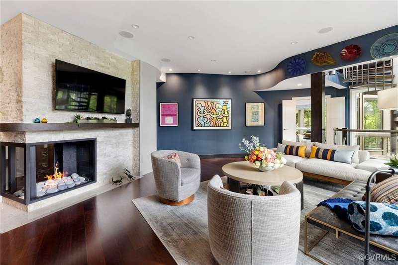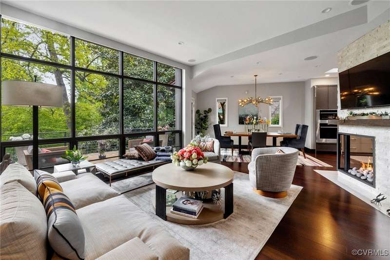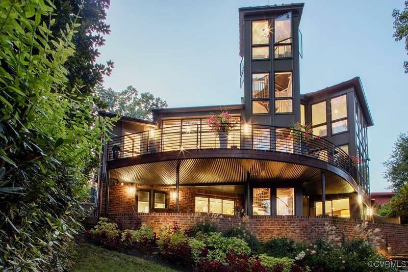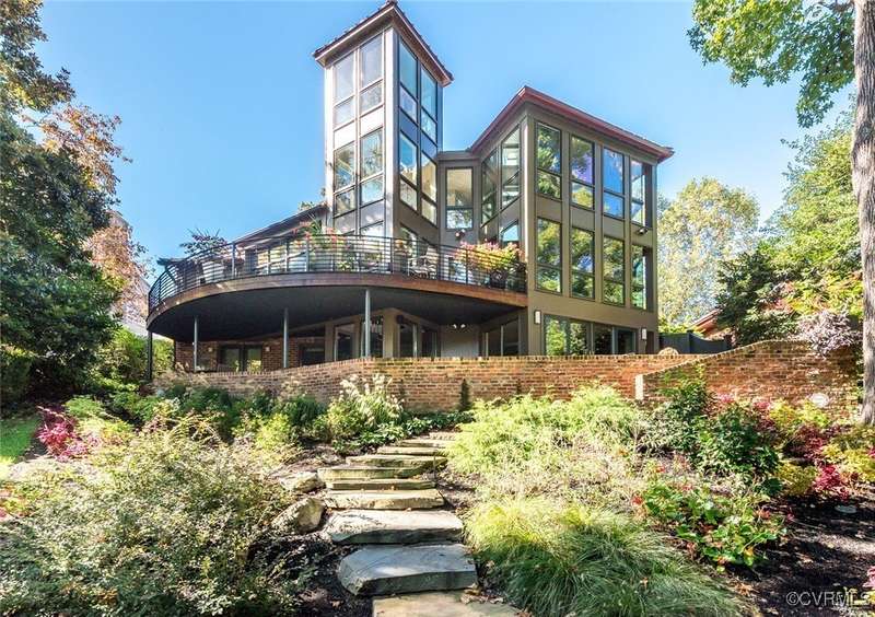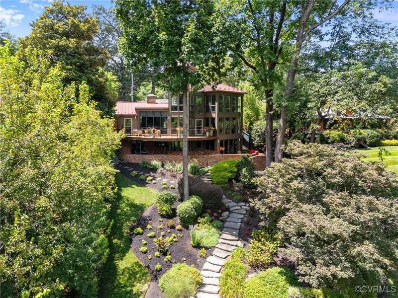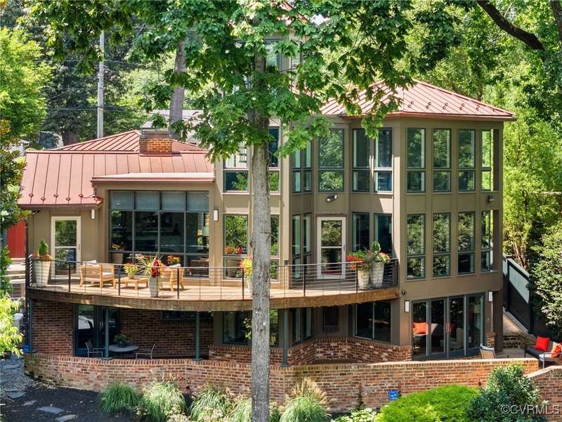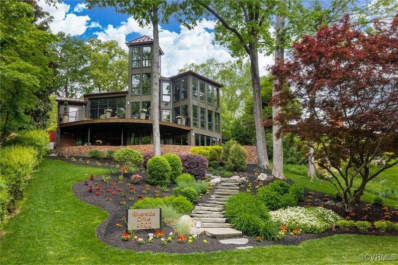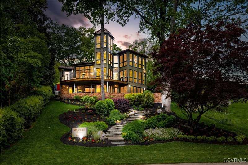 Perched high above Riverside Drive, the Tower House is a striking glass and steel home designed by Richmond architect David Johannas, with interiors reimagined by custom builder Mark Franko. This four-story modern residence offers sweeping views, magazine-worthy design, and a rare connection to nature in the heart of the city. Floor-to-ceiling windows flood the home with natural light, illuminating three bedrooms, two full and two half baths, and elegant living spaces with gas fireplaces. The main-level primary suite is a true retreat with a spa-inspired bath, soaking tub, and built-in TV. A chef's dream kitchen features Wolf and Sub-Zero appliances, quartzite counters, and gorgeous views over a serene rear patio. The lower-level hosts two bedrooms, granite bar with seating, beverage center and wine locker, and a walk-out family room with private access to the hillside gardens. Several outdoor entertaining areas include a dramatic wrap-around deck from the living and dining room, and a graceful stairway of Pennsylvania Bluestone that leads you down to the Buttermilk Trails. The tower's upper floors offer a commanding view of the Carillon, and seasonal views of the James River and downtown skyline. A rear carport and off street parking, complete with multiple attached and detached areas for outdoor storage. A celebrated property, featured in several publications and a stop on the 2024 Historic Garden Tour. This is a rare opportunity to own one of Richmond's architectural treasures. Owner Agent.